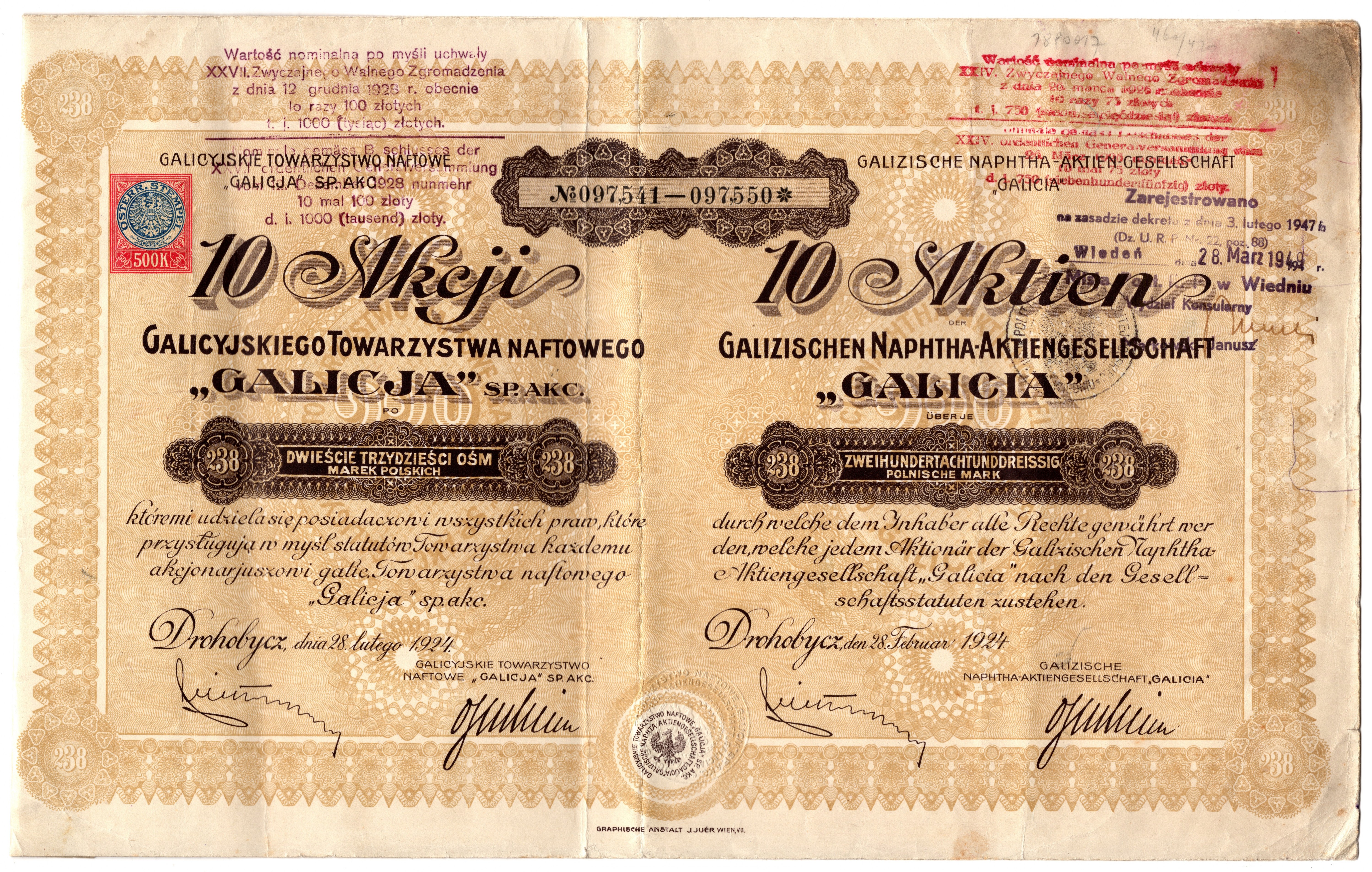 Galicyjskie Towarzystwo Naftowe "GALICJA" S.A. - 10 x 238 marek polskich 1924
