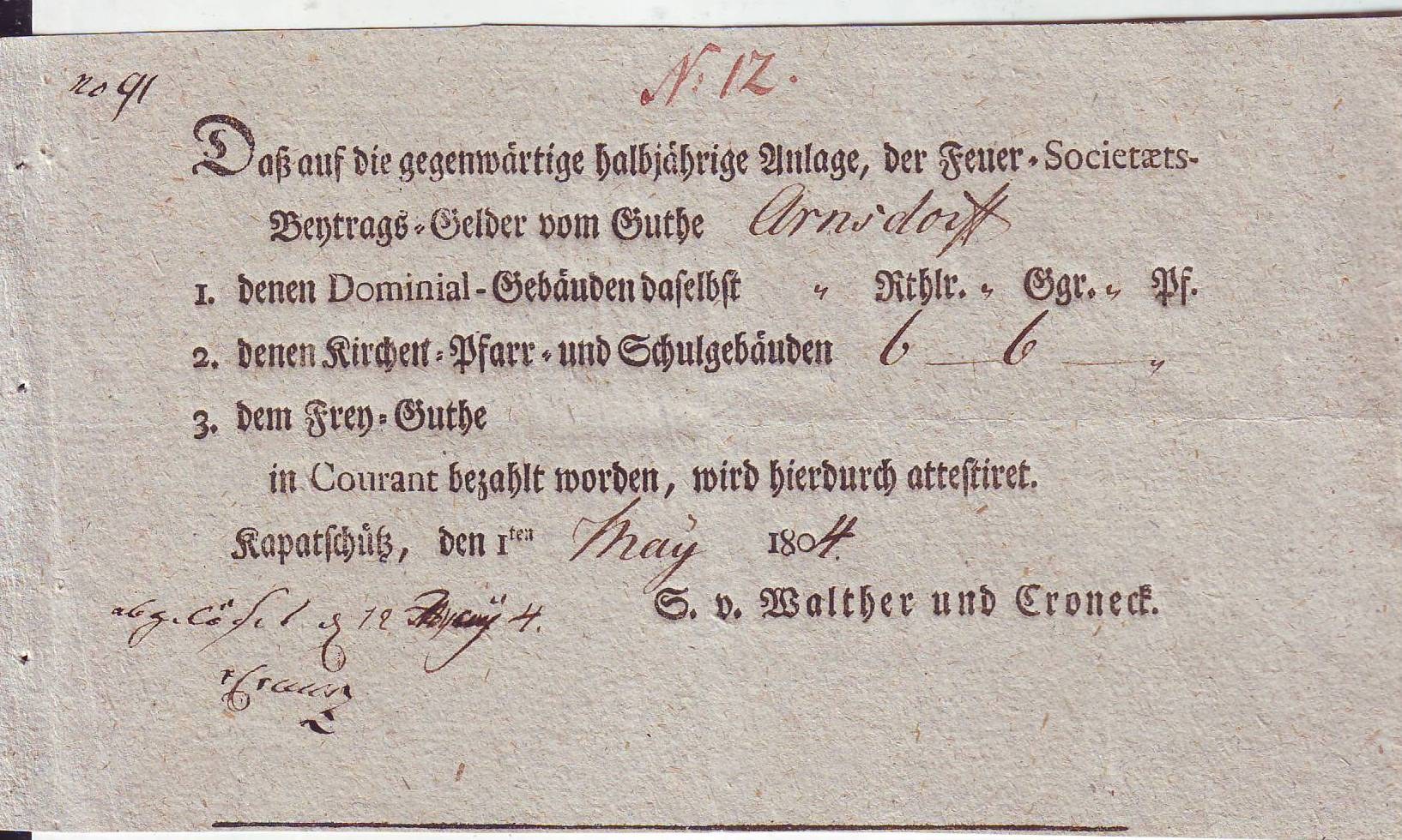 Kwit na wpłatę półroczną ubezpieczenia ogniowego dóbr Arnsdorf (Miłkowice pow. legnicki), za budynki kościelne i szkolne.