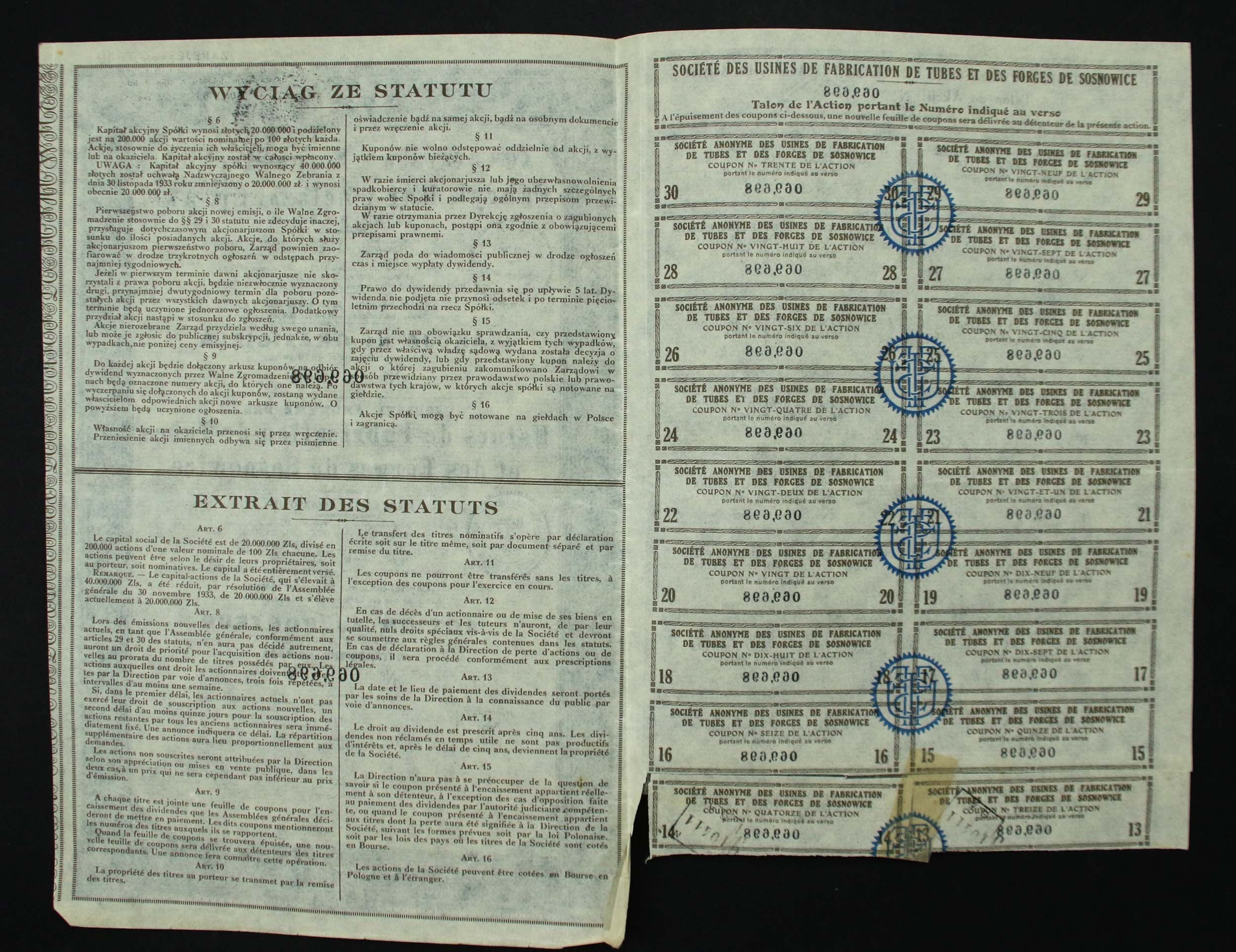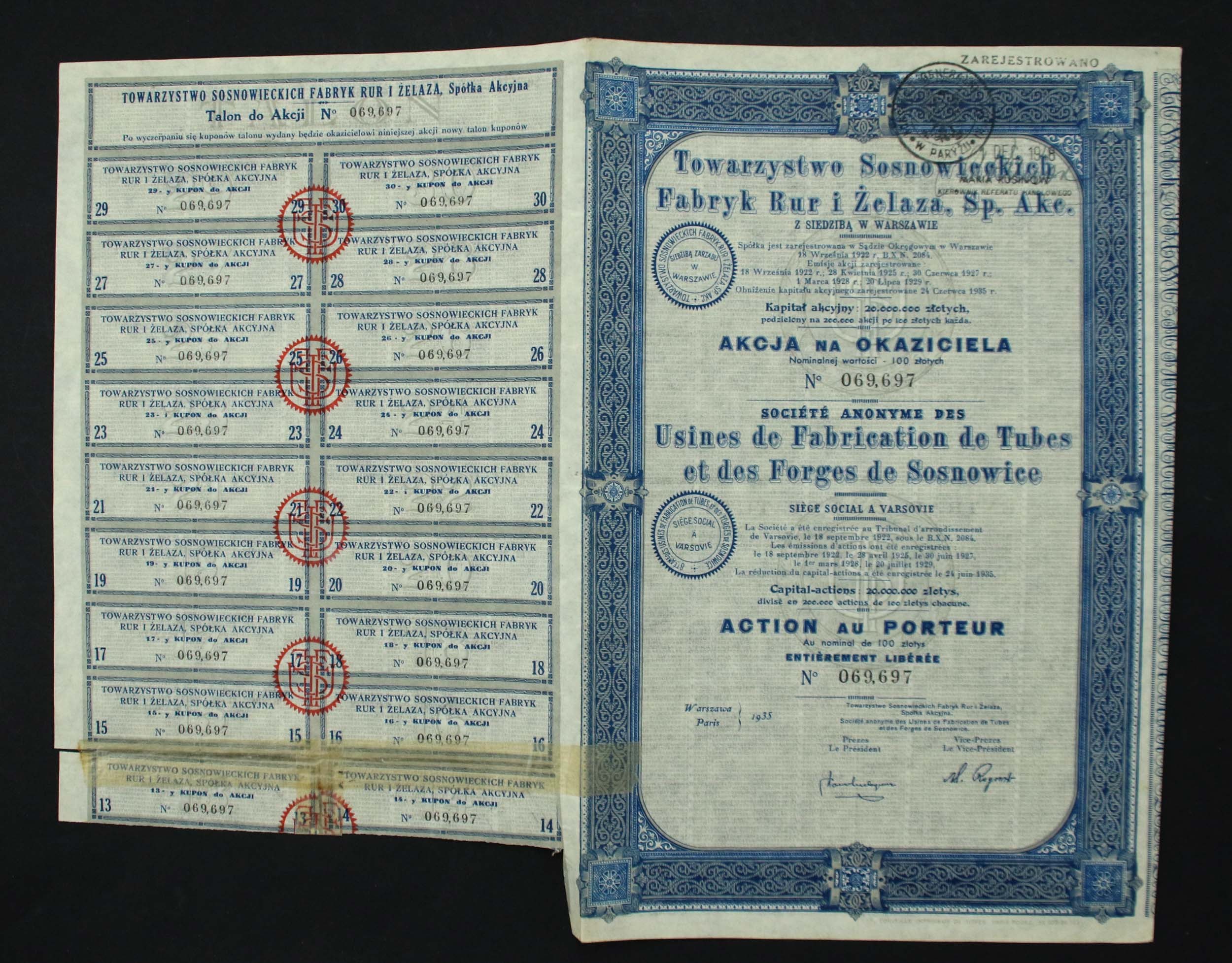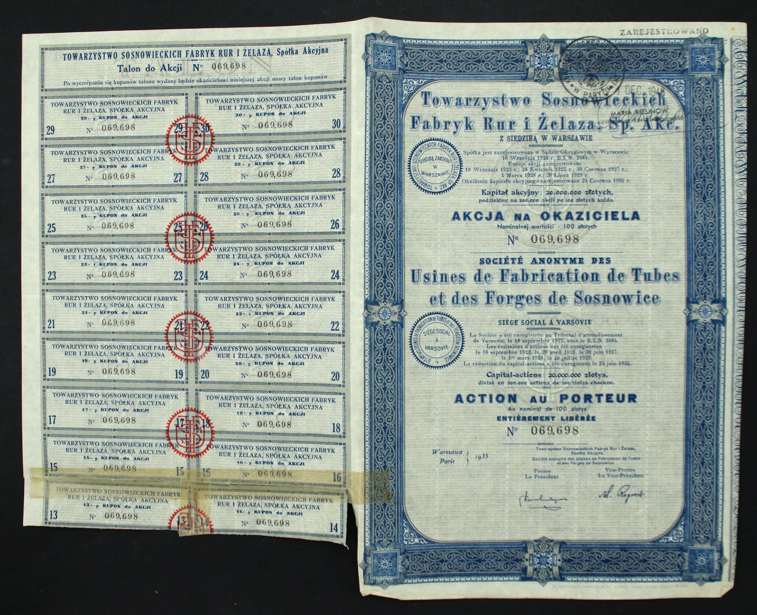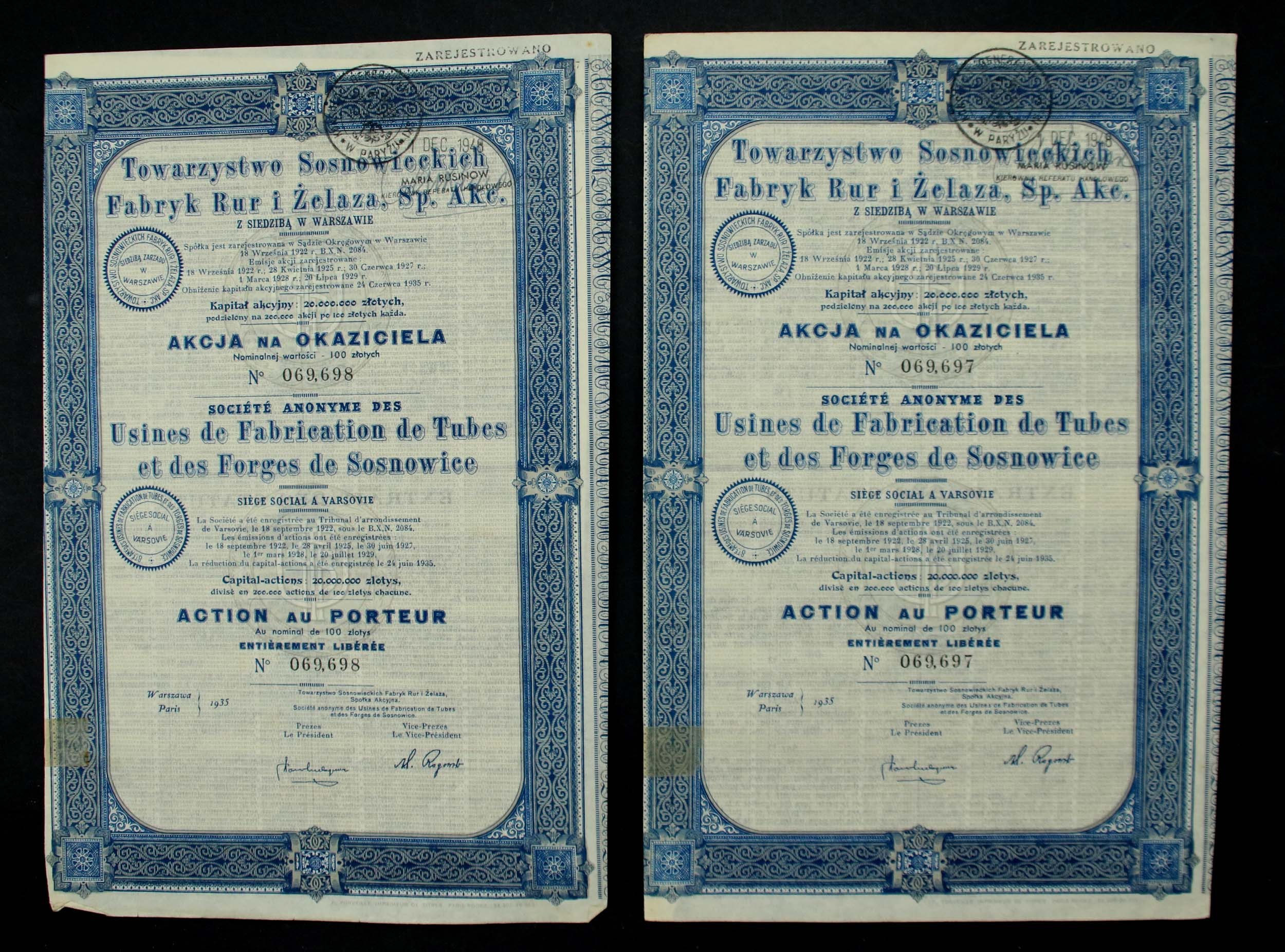 Towarzystwo Sosnowieckich Fabryk Rur i Żelaza S.A., 100 zł 1935. Zestaw 2 szt.