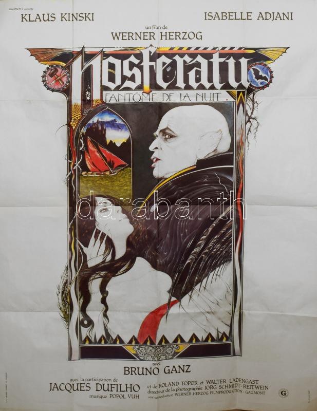1979 Nosferatu: Az éjszaka fantomja (Nosferatu: Phantom der Nacht / Nosferatu the Vampyre) c. Werner Herzog által rendezett film plakátja, főszerepben: Klaus Kinski, Isabelle Adjani, Bruno Ganz, francia nyelvű filmplakát, hajtott, 160x120 cm