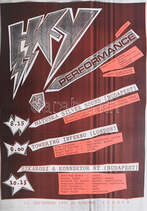 1989 Performance, Matuska Silver Sound (Bernáthy Sándor, Mészáros Sándor), Towering Inferno (London), Szkárosi&Konnektor Rt, Diorama, London, underground-alternatív plakát, papír, jelzés nélkül, 42x29,5 cm.