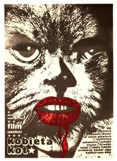Plakat filmowy form. 81x57,1 cm. Pysk kota z kobiecymi ustami. Film japoński (oryg. "Yabu no naka no kuroneko"), wyświetlany w Polsce także pod tyt. "Czarny kot". Reż. K. Shindo. Wyst. K. Nakamura, N. Otowa. Niewielkie naddarcia prawej krawędzi.