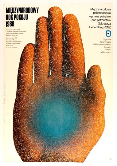 Plakat okolicznościowy form. 96,6x66,8 cm. Otwarta dłoń z błękitnym kręgiem. Wystawa towarzyszyła XI Biennale Plakatu, prezentowana była w Domu Artysty Plastyka w VI-VII 1986. Załamanie dolnego narożnika.