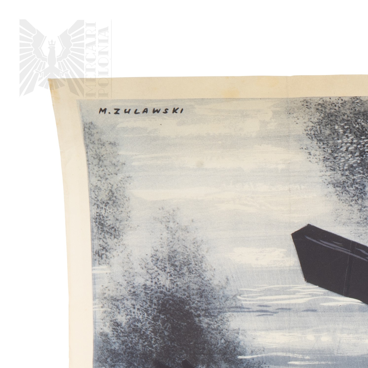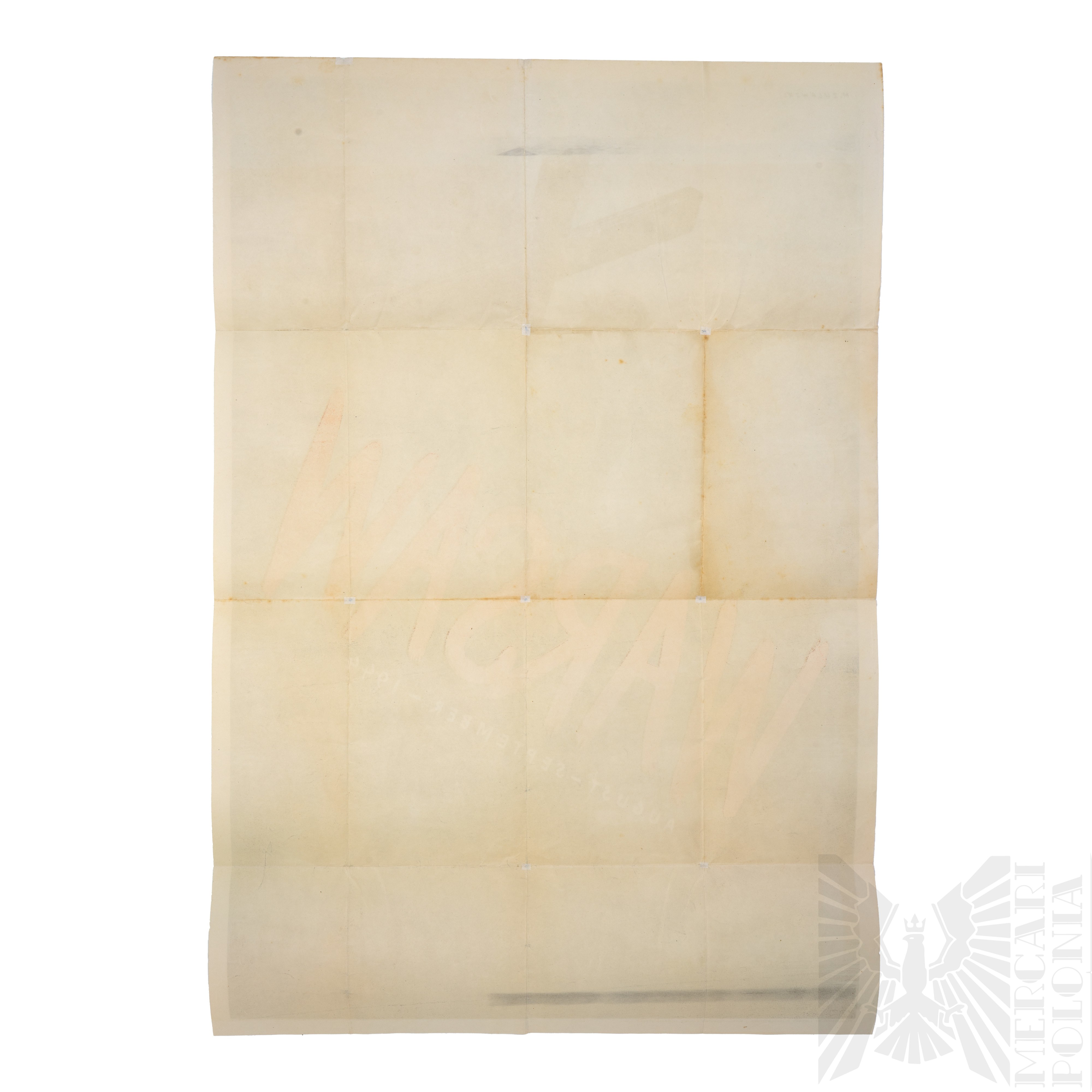 Rzadki plakat zaprojektowany przez Marka Żuławskiego wydrukowany na zachodzie upamiętniający walki w trakcie Powstania Warszawskiego w 1944. W centralnej części plakatu widoczny Chrystus niosący krzyż, na nim napis “Warsaw August-September-1944”. Takie plakaty były drukowane pod koniec 1944 roku.