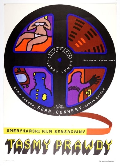 Plakat filmowy form. 82,3x58 cm. Szpula taśmy filmowej z wkomponowanymi czterema scenami z filmu. Film amerykański (oryg. "The Anderson Tapes"). Reż. S. Lumet. Wyst. S. Connery, D. Cannon. Stan dobry.