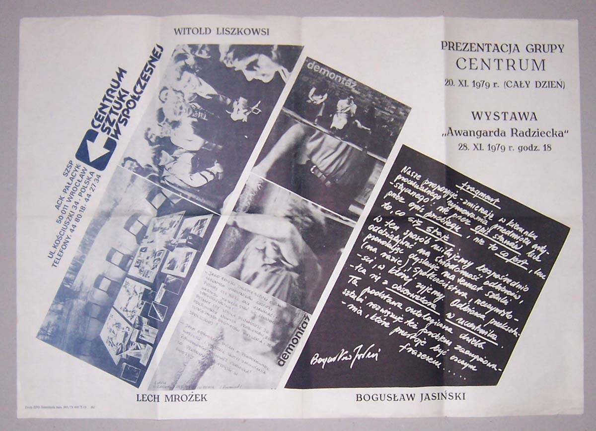 Tytuł: "Prezentacja Grupy Centrum 20.XI.1979 r. (Cały dzień) Wystawa "Awangarda radziecka" 28.XI.1979 r. godz. 18 Witold Liszkowski, Lech Mrożek, Bogusław Jasiński, Wrocław CSW"