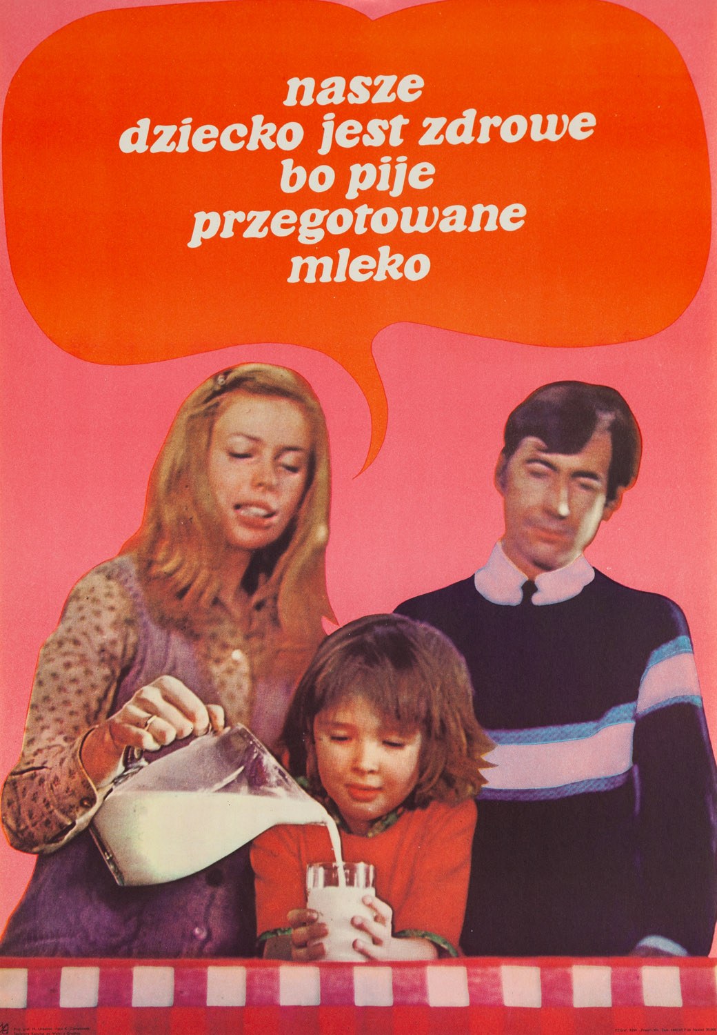 proj. Maciej URBANIEC (1925-2004), foto: Krzysztof GIERAŁTOWSKI (ur. 1938), Nasze dziecko jest zdrowe, bo pije przegotowane mleko, 1969