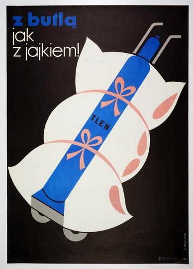 Plakat bhp form. 67x47,4 cm. Dotyczy butli z tlenem, którą tu pokazano opatuloną dziecięcym becikiem. Plakat wydany przez Inst. Wydawniczy Związków Zawodowych, opatrzony symbolem P 842. W obrębie kompozycji nieaktualna piecz.: "Egzemplarz bezpłatny". Stan dobry.