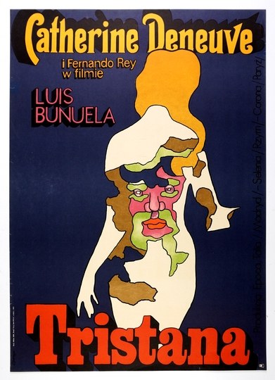Plakat filmowy form. 80,3x57,2 cm. Twarz mężczyzny wkomponowana w kobiecą sylwetkę. Film francusko-hiszpański (oryg. "Tristana"). Reż. L. Bunuel. Wyst. C. Deneuve, F. Rey. Niewielkie naddarcia krawędzi, niektóre podklejone.