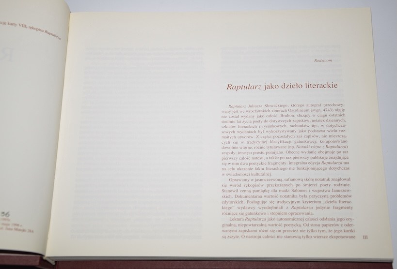 "Raptularz" Juliusza Słowackiego to prawdziwy rarytas dla miłośników literatury doby romantyzmu. Ten brulion służący poecie do notatek, szkiców literackich i plastycznych, zapisków codziennych nie był dotąd wydany w całości. Jego fragmenty drukowano przy okazji ukazywania się innych dziel poety, wykorzystywano jako tło rozmaitych utworów. Autograf "Raptularza" przechowywany we wrocławskiej bibliotece Ossolineum był niedostępny szerszemu gronu osób zainteresowanych twórczością Słowackiego. Dzięki Markowi Troszyńskiemu dostęp do notatek z ostatnich lat zżycia poety będzie dużo łatwiejszy. Poza tym lektura pełnego zapisu "Raptularza", wolnego od ingerencji wydawców to prawdziwe wyzwanie dla miłośników Słowackiego. Wielość elementów składających się na "Raptularz" wymaga od czytelnika dużej wiedzy, wrażliwości na słowo i wyobraźni literackiej. W "Raptularzu" można znaleźć szkice i pomysły do znanych utworów z okresu mistycznego poety, rysunki, wypisy z lektur (często w oryginale), a także notatki codzienne. Z kart tej wspanialej publikacji czytelnik może poznać nie tylko poetę, ale także emigranta, przyjaciela, mistyka, syna. Słowacki jawi się jako niezwykły, ale tez całkiem zwyczajny człowiek, człowiek z krwi i kości.