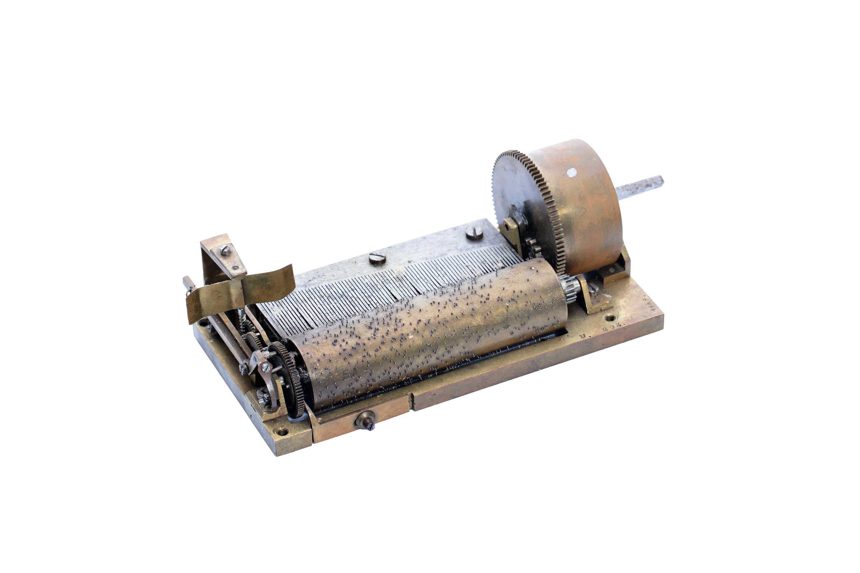 A mechanical jukebox with a cylinder mechanism and metal reeds, probably dating from the 19th century. A cylindrical drum with lugs resonates the reeds, creating a melody. The movement is equipped with a clock face with a winding mechanism and gears that ensure smooth operation. No keyAlthough the movement is functional, it requires professional cleaning for optimal operation. The construction and mechanical components show signs of age and use, but still retain their original character.