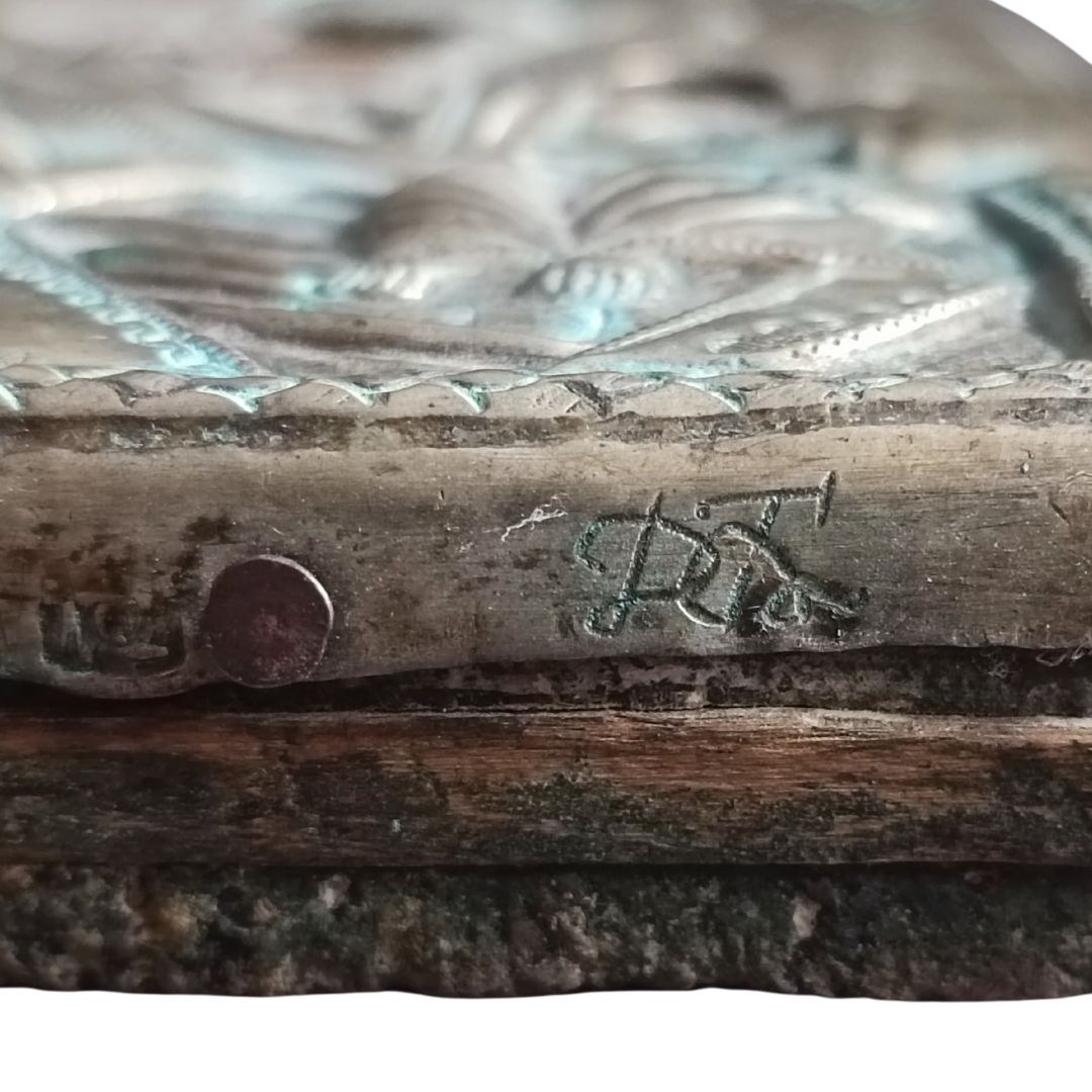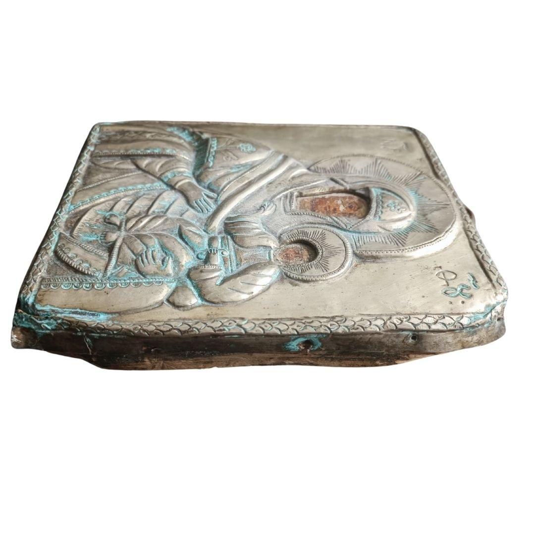 Ikona przedstawiająca klasyczny temat Matki Boskiej z Dzieciątkiem, wykonana na drewnie, w srebrnej koszulce.