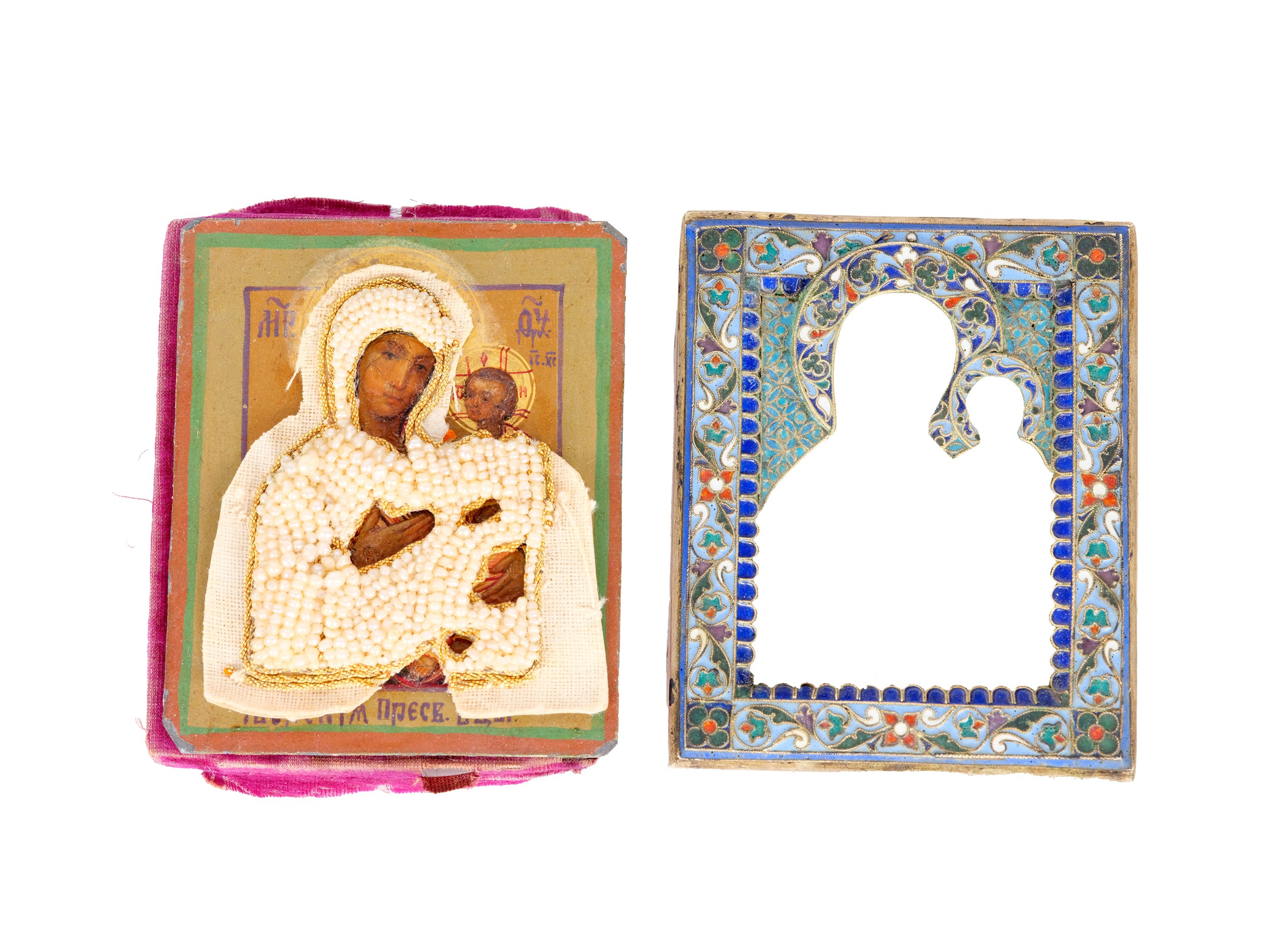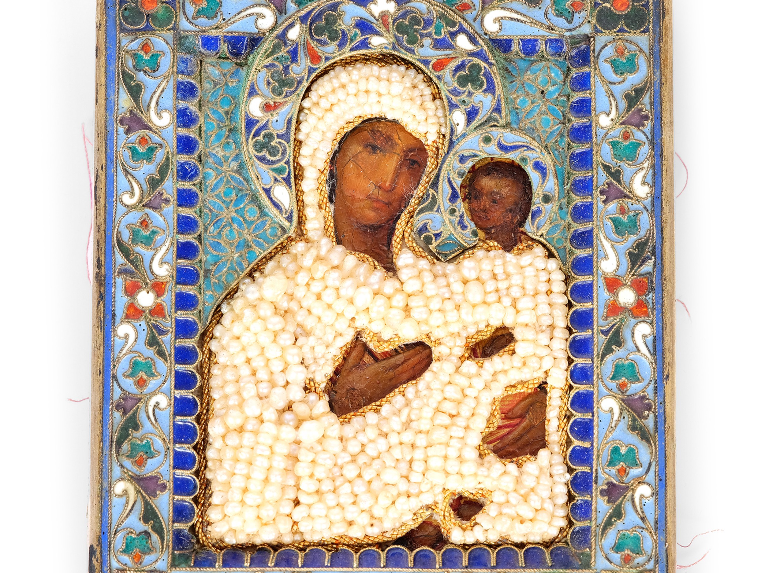 Cell enameling is an elaborate technique in which fine gold wires or silver rods are soldered onto a metal surface to form small cells. These are filled with different colored enamel pastes and fired at high temperatures. The technique was perfected in Russia, particularly in the 19th century, by masters such as Ovchinnikov. The oklad (Russian “oklad” = “cover”) shown here is made of finely crafted silver with cellular enamel. There is also a textile with pearl trimming under the oklad. Beads symbolize purity and immortality and were often used to decorate sacred objects.