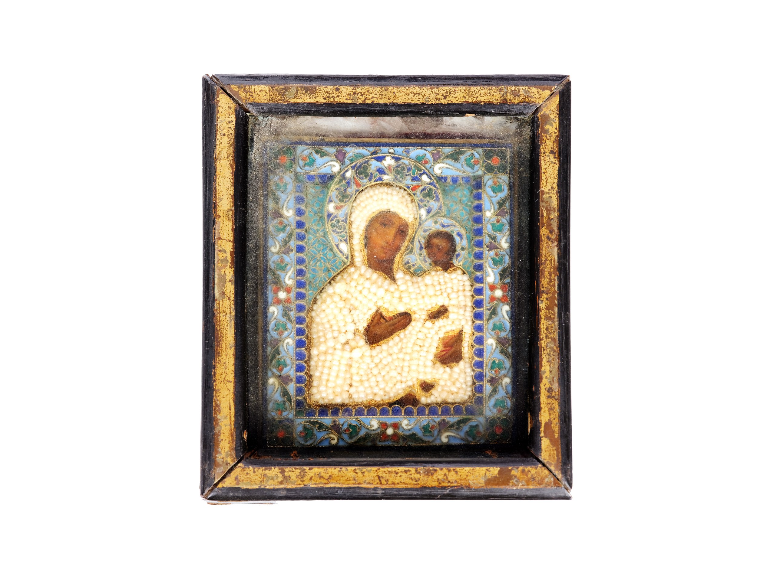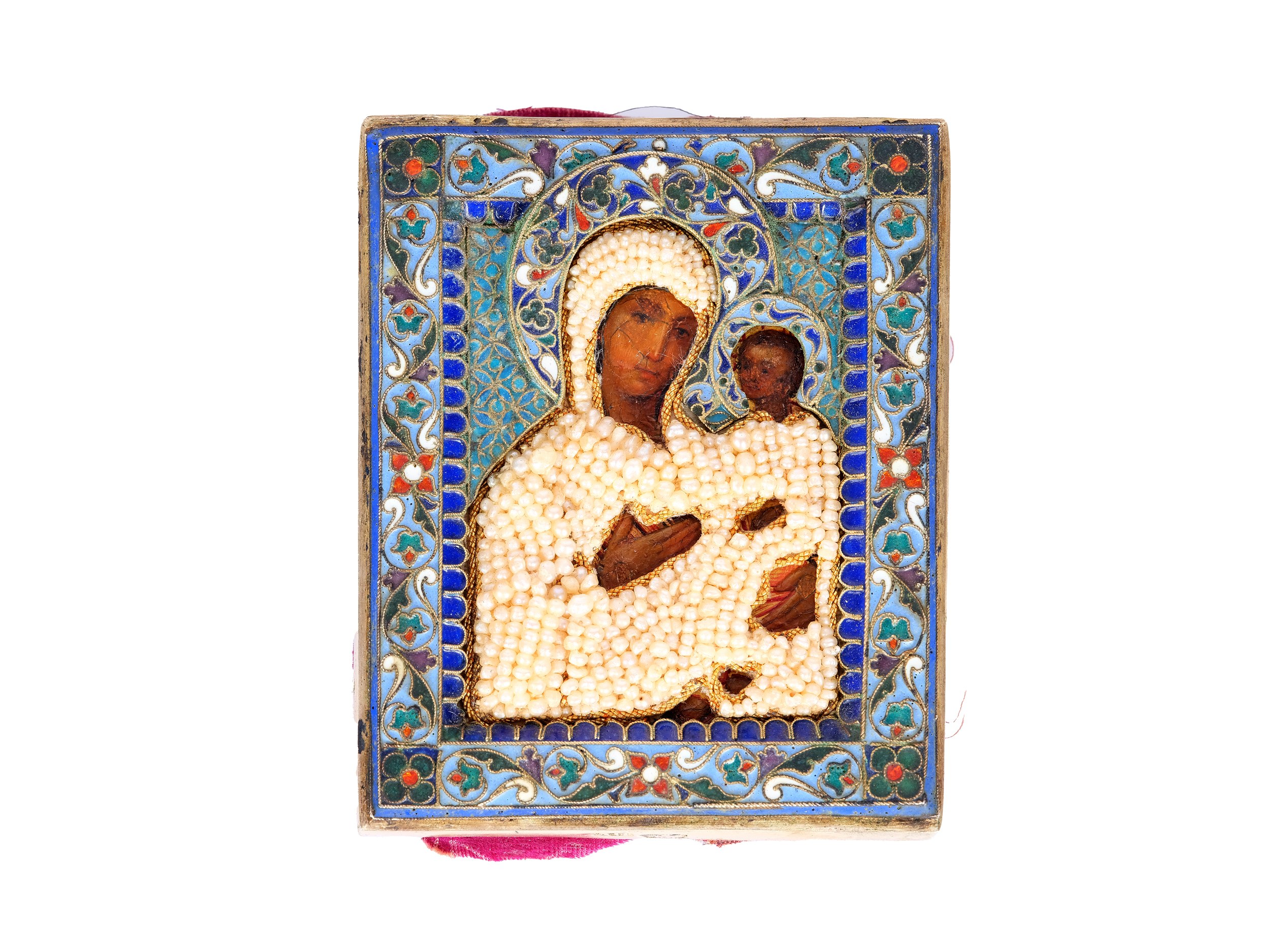 The oklad of the present icon shows characteristics of the style of Pavel Ovchinnikov (1830-1888), one of the leading Russian goldsmiths of the 19th century. Ovchinnikov was purveyor to the Tsar's court and was known for his masterly workmanship of silver and enamel. His workshop specialized in the production of iconoclasts, liturgical objects and ornate tableware in the Russian national style. The cell enamel technique, which he perfected in the tradition of old Russian goldsmithing, is particularly characteristic of his work. The icons from his workshop were often decorated with pearls, precious stones or gilded ornaments.