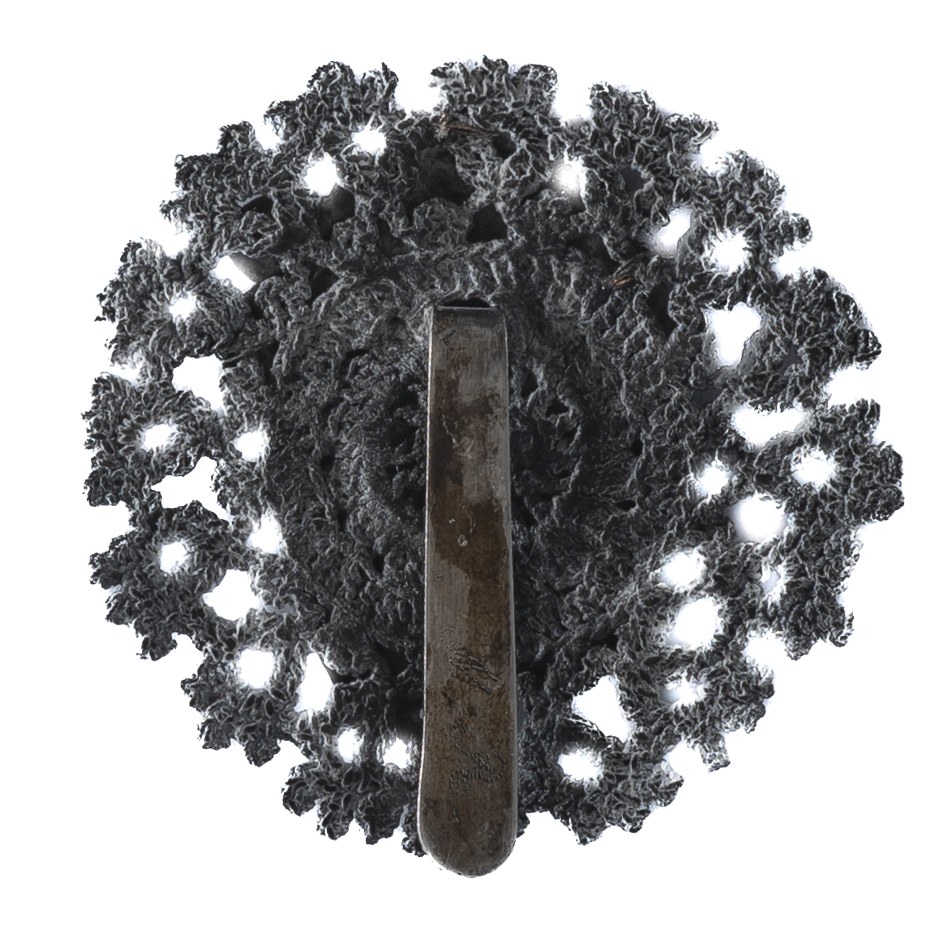 38x46mm. Wykonana w srebrze - nieczytelna próba na awersie. Rewers z kontrą. Mocowana na płaską wsuwkę z inicjałami M.R[ całość umieszczona na haftowanej podkładce. Stan bardzo dobry.