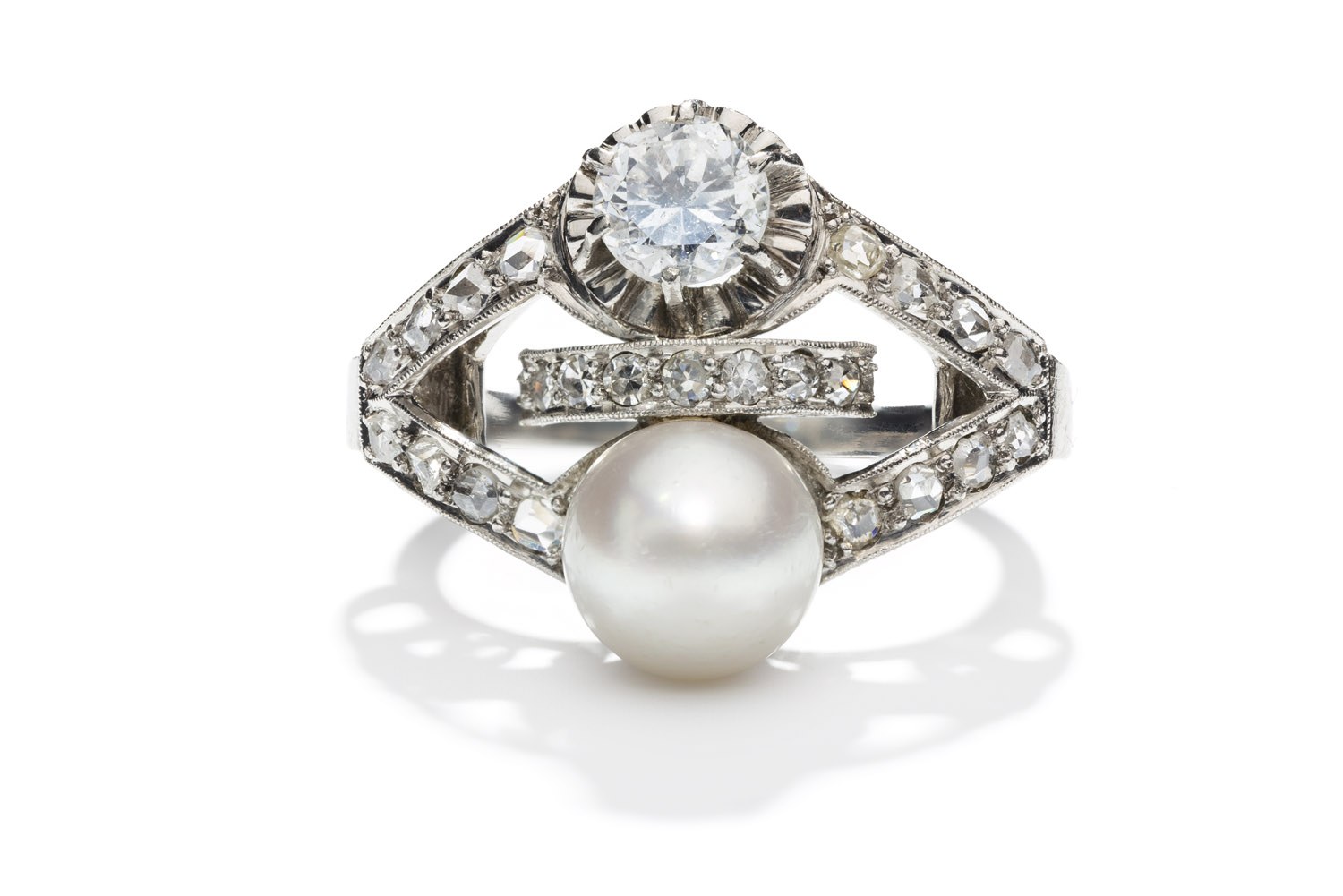 platyna pr. ~ 0,950, 1 brylant ~ 0,60 ct H/P1 w szlifie przejściowym, 23 diamenty i rozety diamentowe ł. ~ 0,50 ct H-I/VS-SI w szlifie 8/8, 1 perła naturalna śr.: 7,5 mm, masa: 6,62 g, rozmiar: 12*