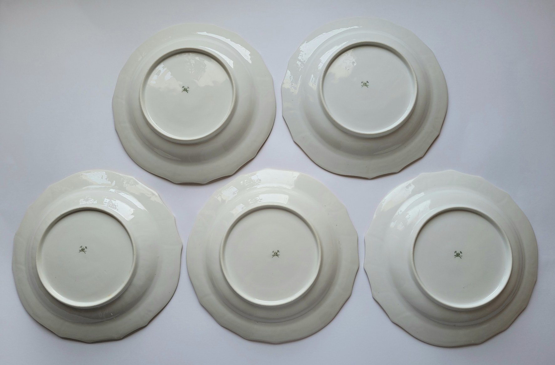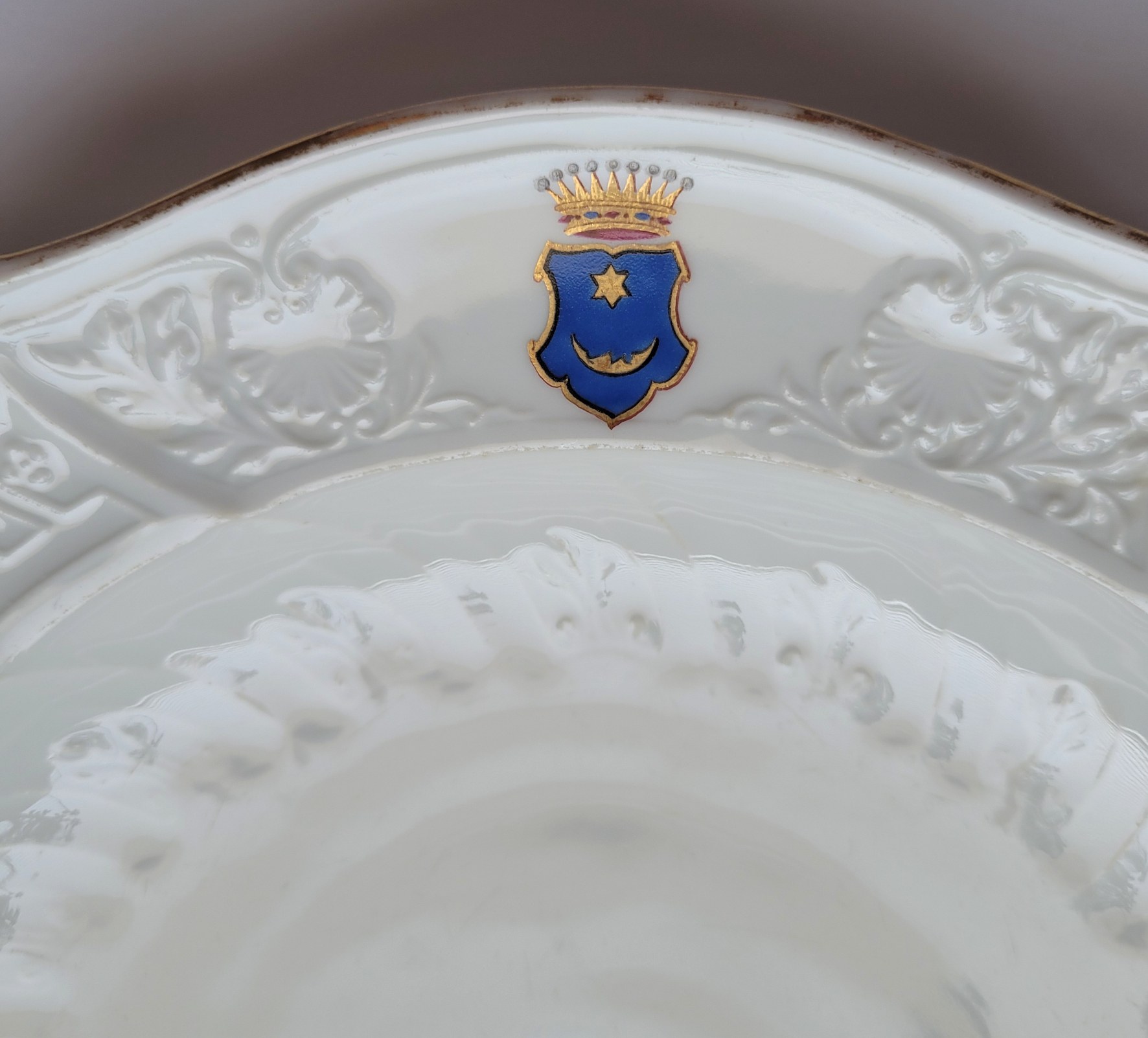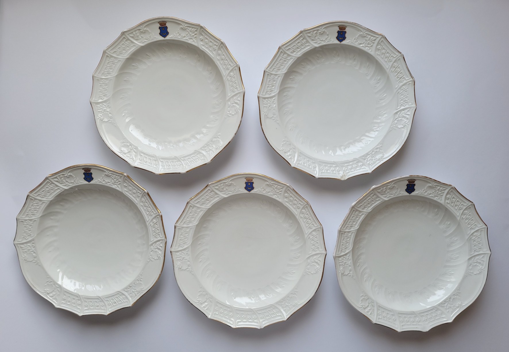 [HERB LELIWA] Zestaw 5 porcelanowych talerzy głębokich, dużych, z herbem Leliwa pod koroną hrabiowską. Manufaktura porcelany F&M (Fischer & Mieg), Pirkenhammer, 1853-1873. Talerze z białej porcelany z reliefami na kołnierzu oraz z niebieską tarczą herbową ze złotą obwódką, nad herbem 9-pałkowa korona hrabiowska, krawędzie talerzy obwiedzione złotym paskiem, na spodzie sygnatura manufaktury w Pirkenhammer, na jednym wycisk F&M (Fischer & Mieg) z lat 1853-1873. Wymiary: średnica ok. 24,5 cm, wysokość ok. 3 cm.