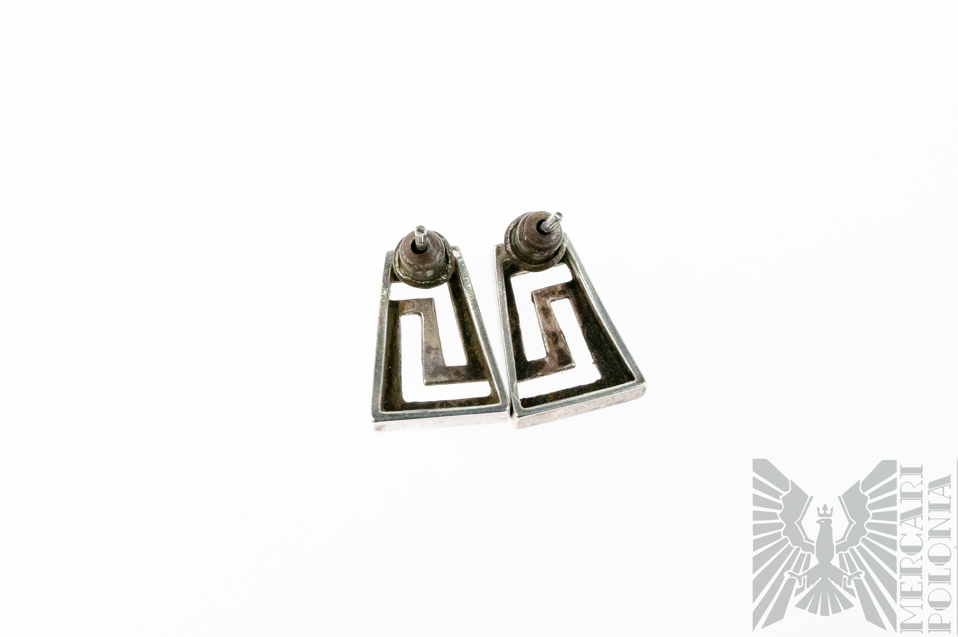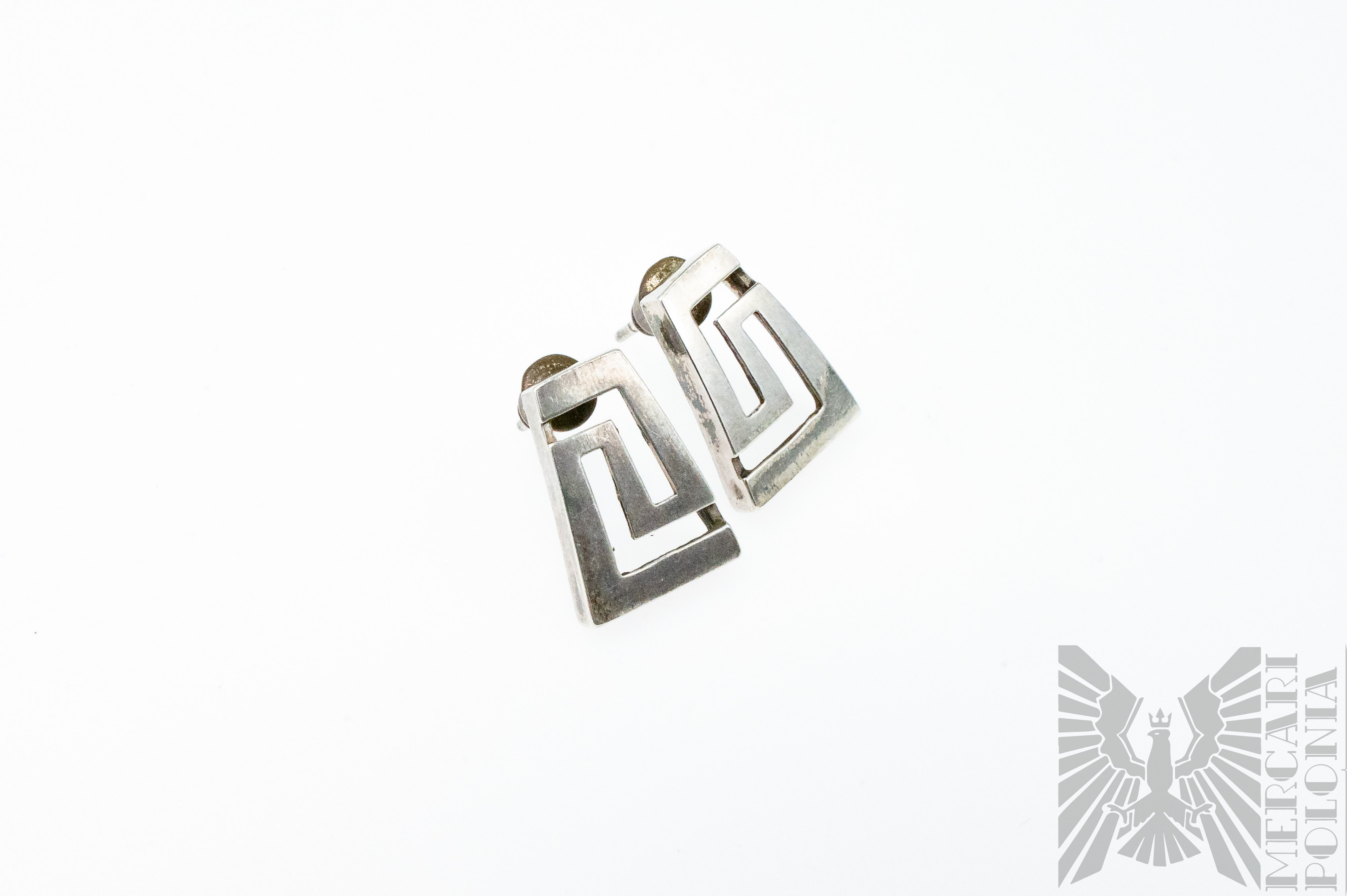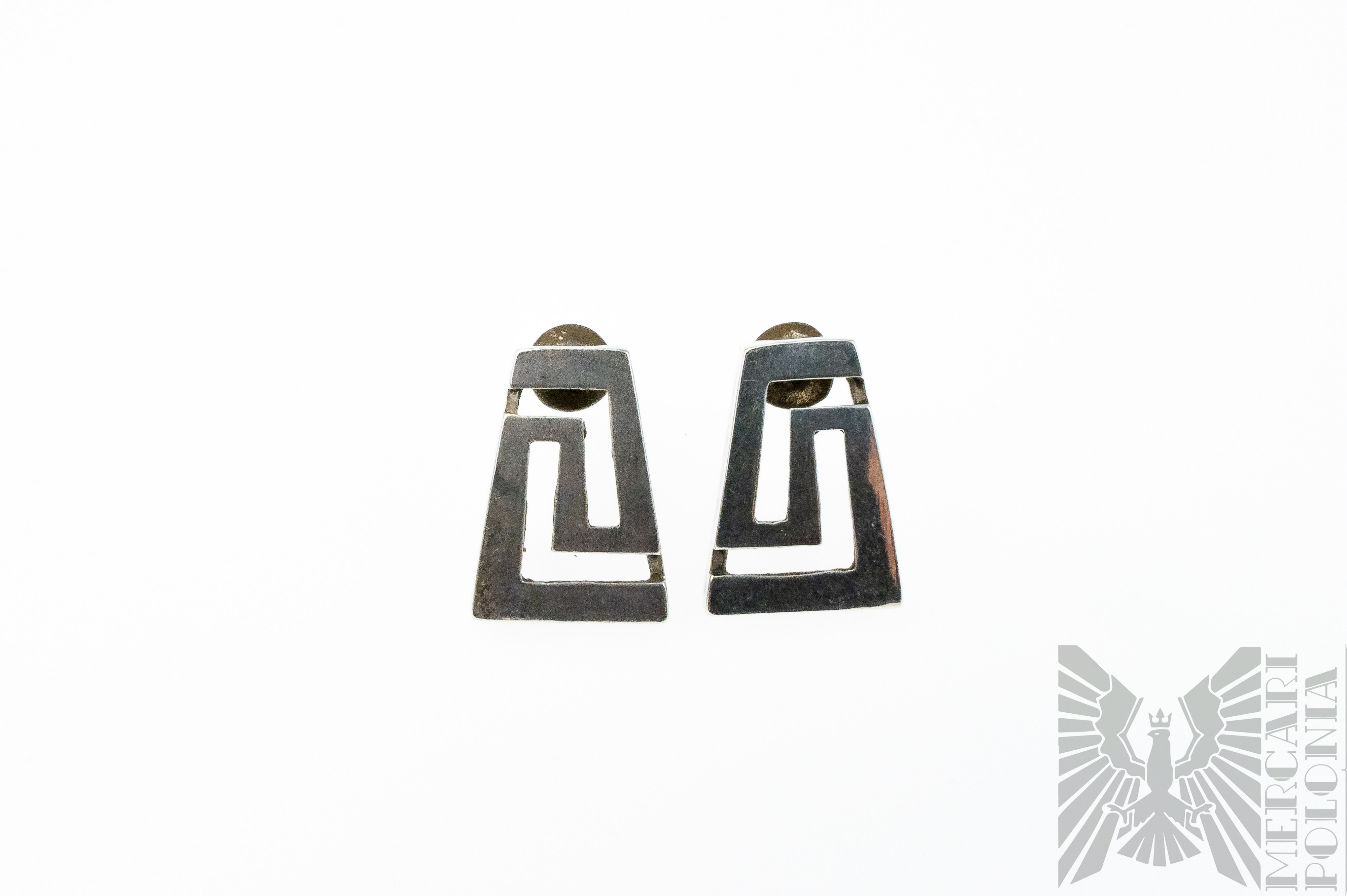 Trapezowe Kolczyki z Wzorem Greckim, Srebro 925, masa wyrobu 3.40 gram, wymiary 16x11 mm, zapięcie Sztyft