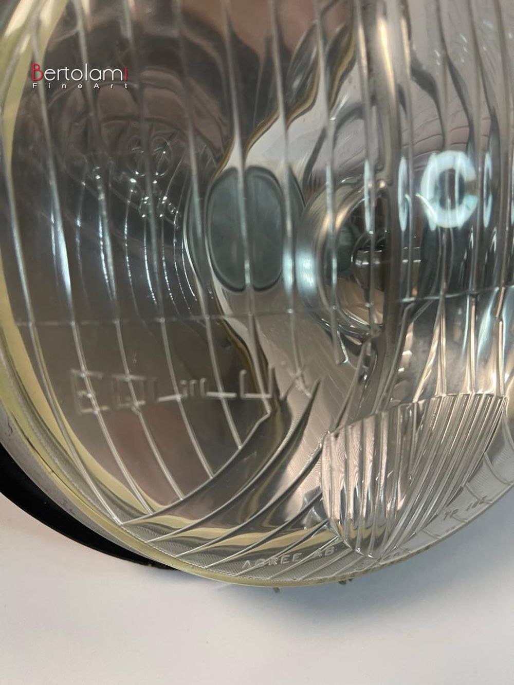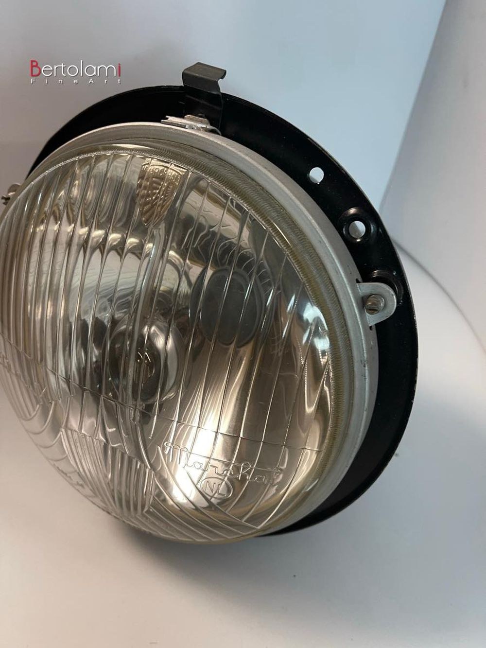 The headlights are Equilux model agree AB tp 485 with a large central low emblem. They come with a chrome-plated high central inner shield and a chrome-plated steel ring. The headlights are equipped with new, never mounted, black anodized dome-shaped supports that can be detached from the domes. The glass diameter is 20 cm, and the dome diameter is 23 cm. The overall depth of the headlights is 20 cm.
