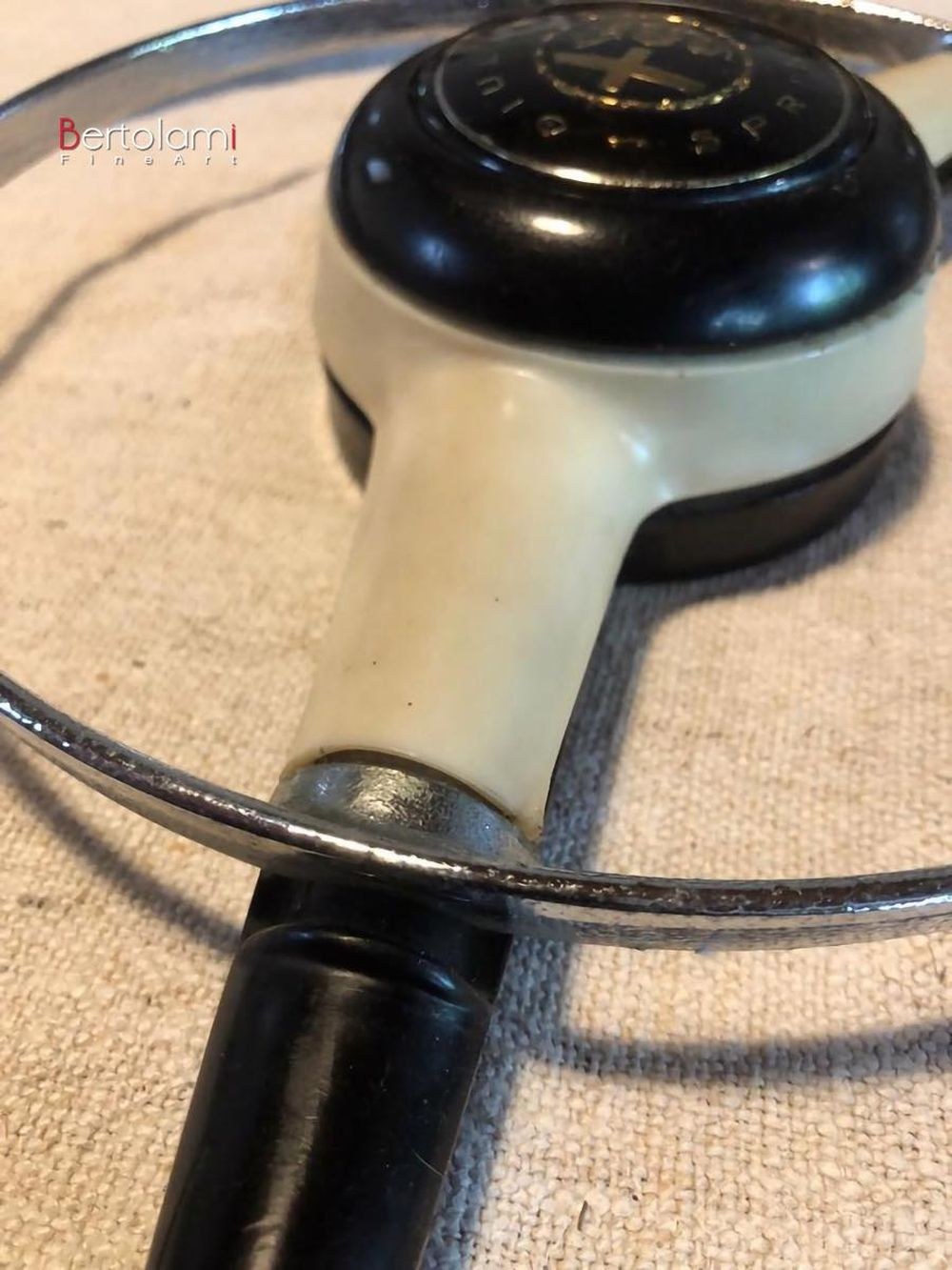 The Giulietta Sprint steering wheel from 1961 to 1965 is an original part that came as standard equipment on that model. It is made of bakelite and metal and has never been redone or refurbished. It can be fitted on all Giulietta Sprint and Spider models from that era, as well as on the Giulietta Berlina by replacing the steering wheel horn button with one labeled "Giulietta Sprint."
