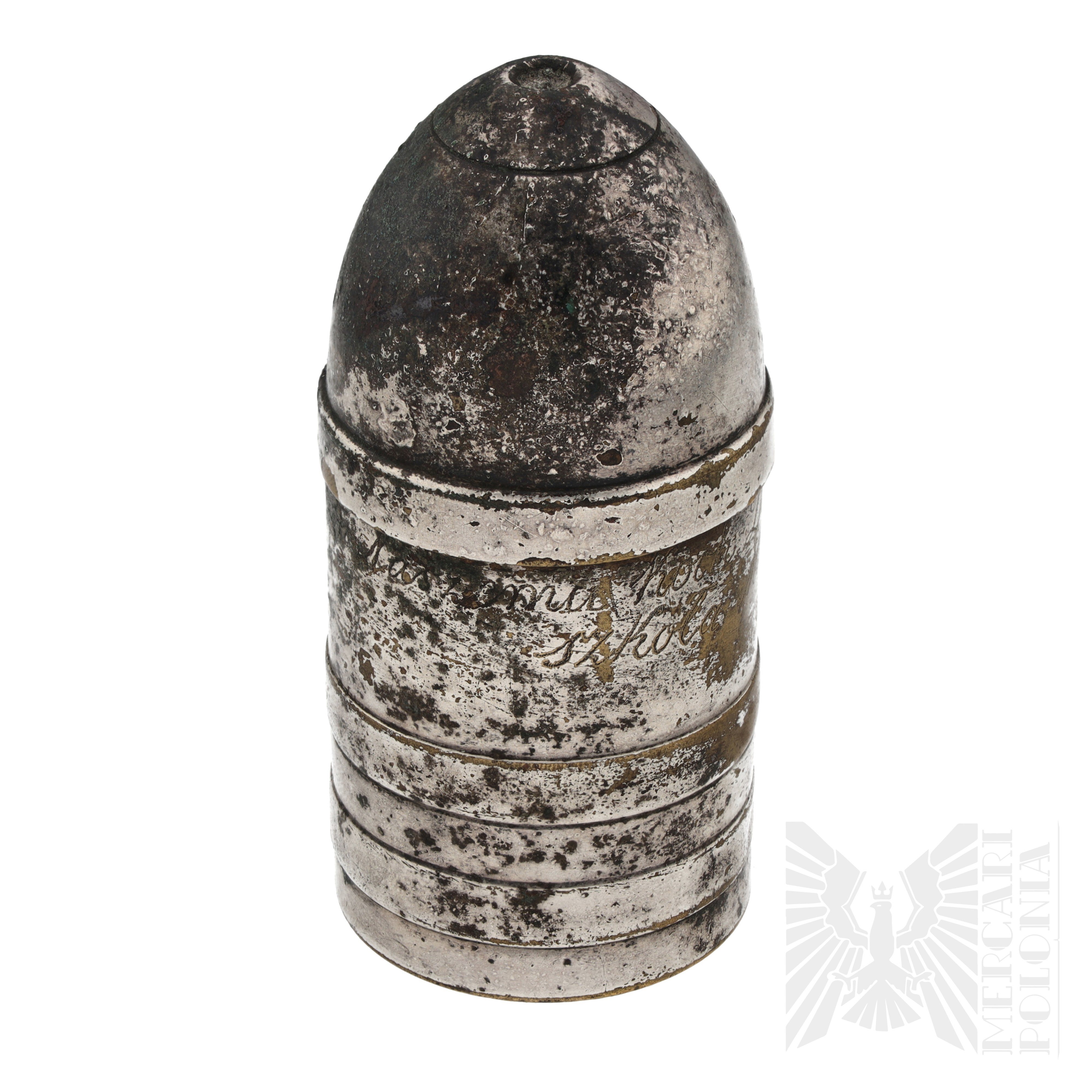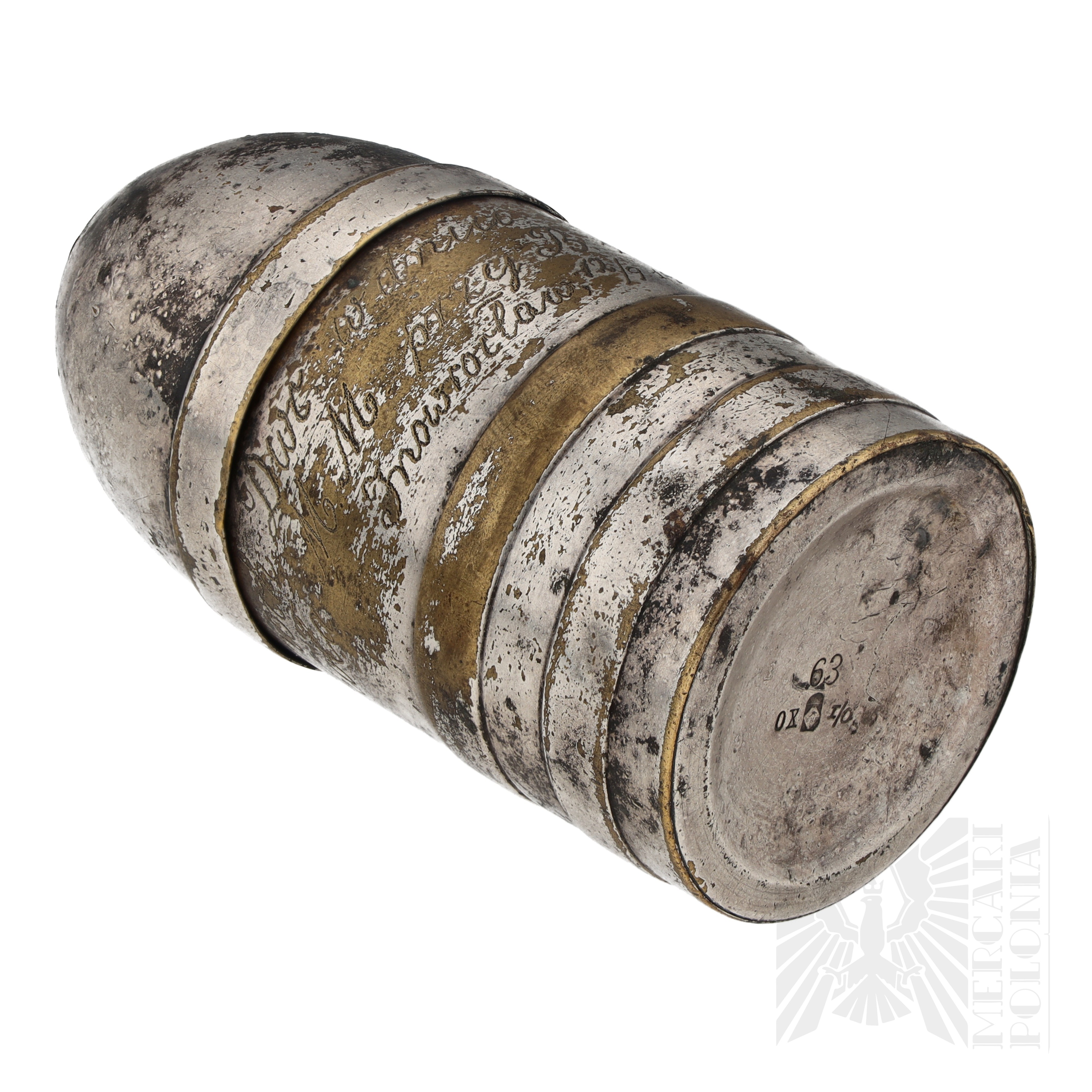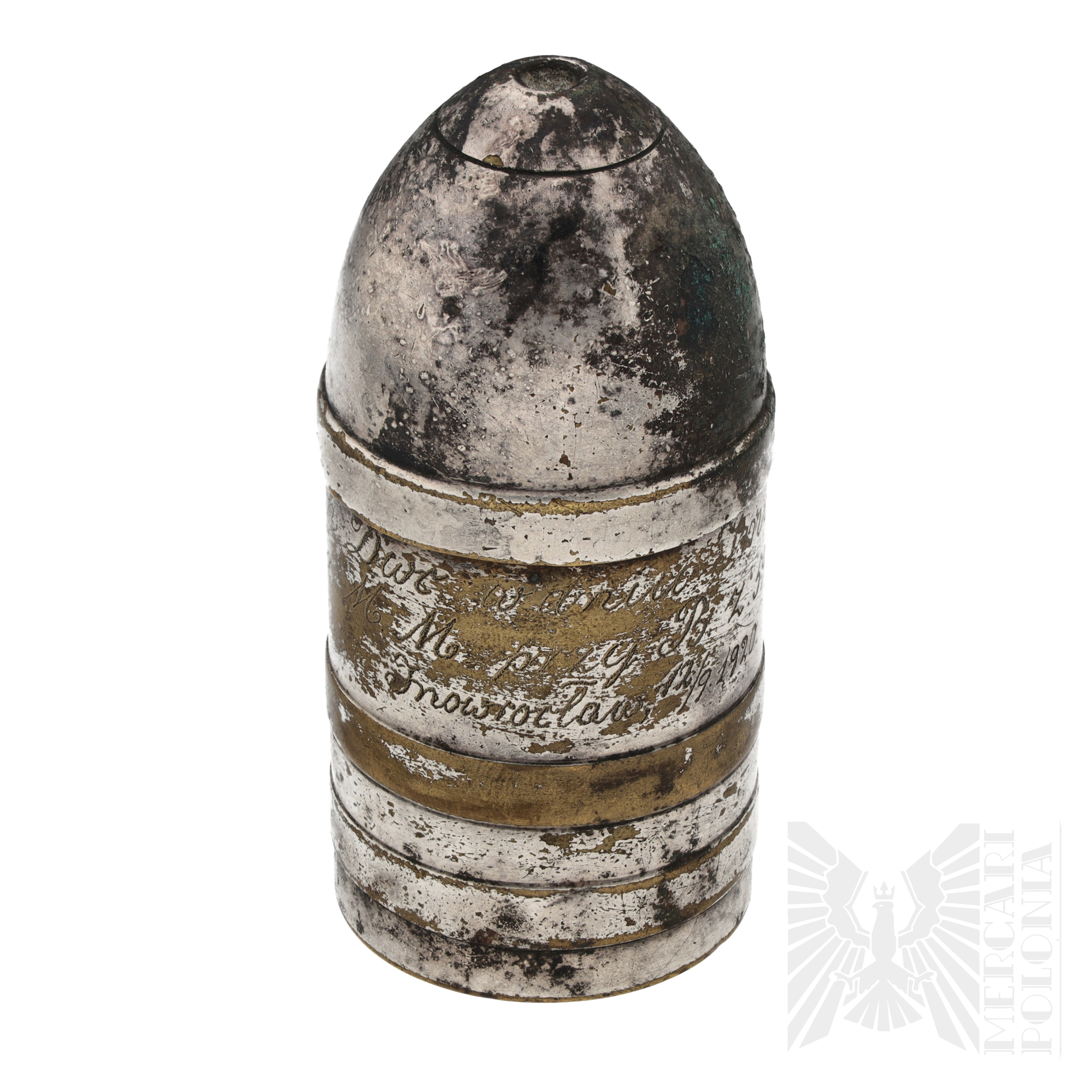 Kałamarz na atrament w kształcie pocisku artyleryjskiego, w środku szklana butelka na atrament i fragmenty korka. Widoczny wygrawerowany napis “Na pamiątkę koch Dwc w Dniu Imienin szkoła M M przy B. z. 59 pp. Inowrocław 12/9 1920.” Na dole sygnowany 63 OX I/O