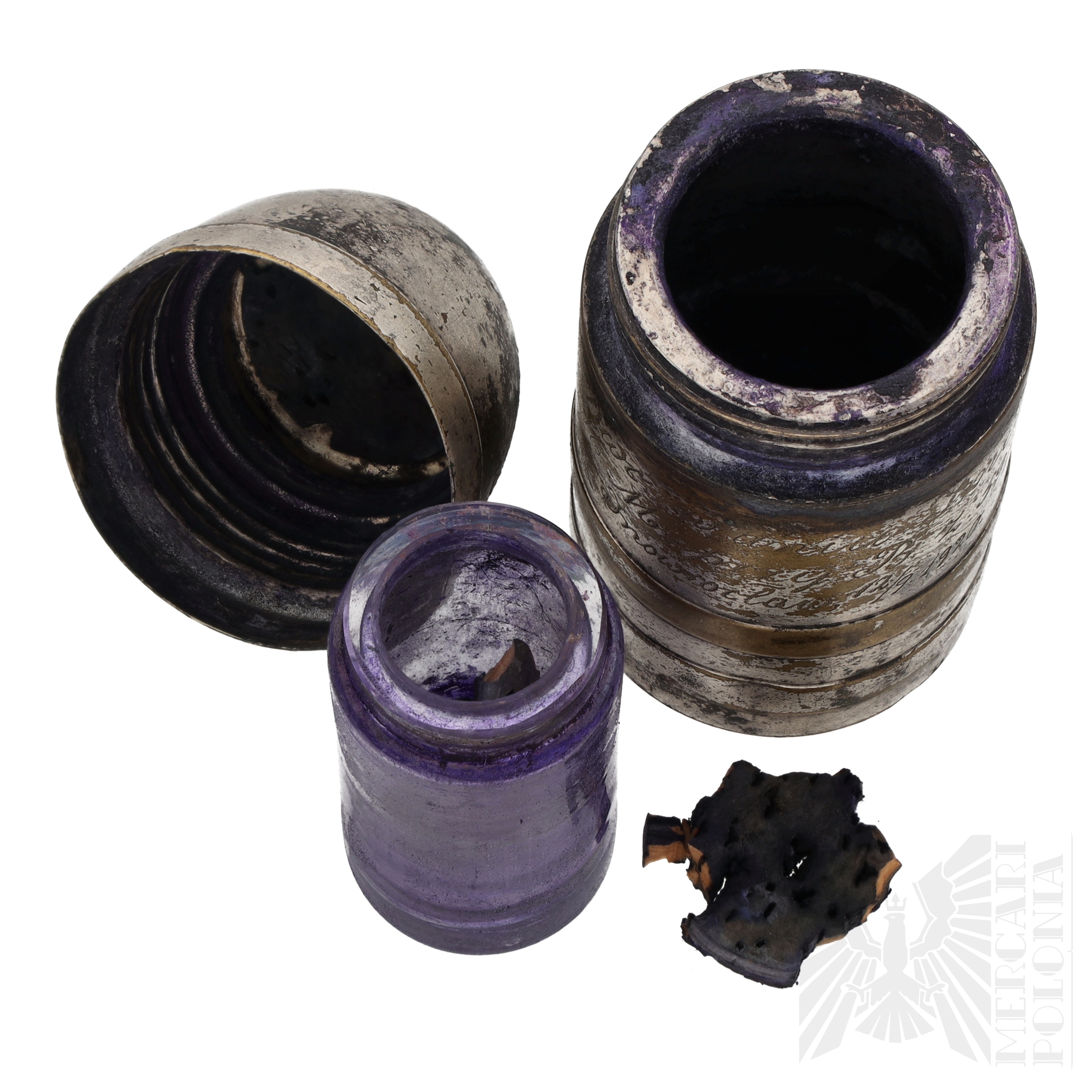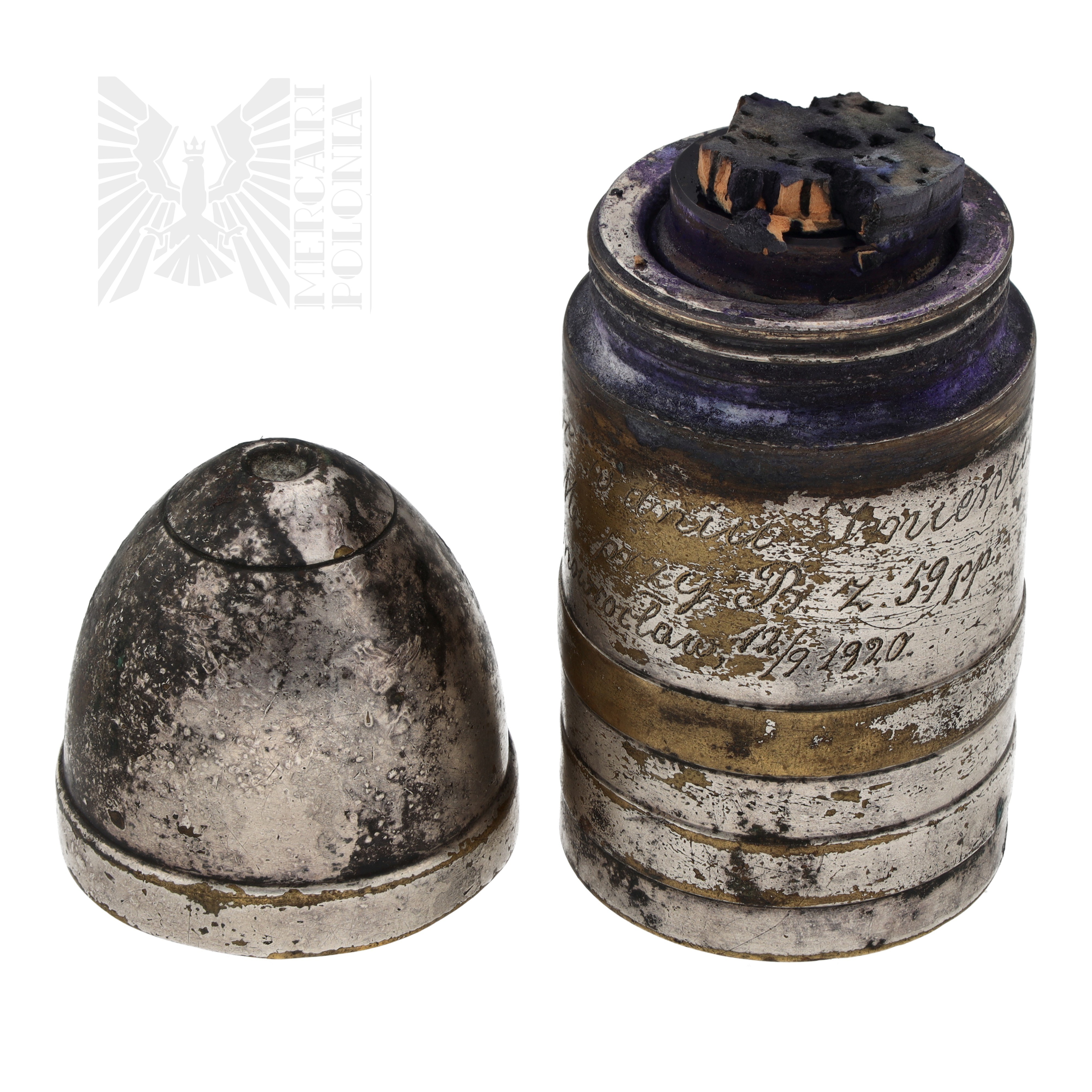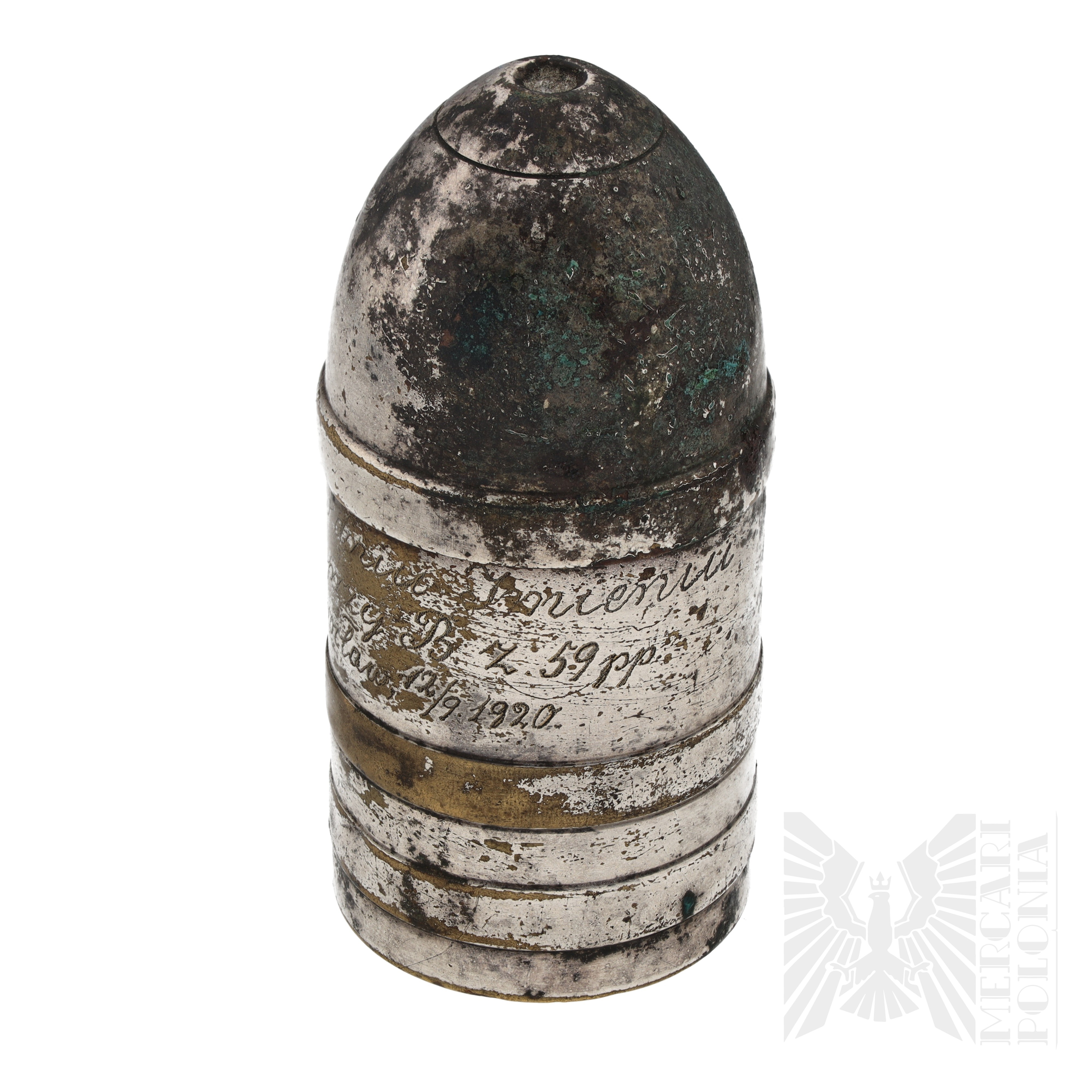 Kałamarz na atrament w kształcie pocisku artyleryjskiego, w środku szklana butelka na atrament i fragmenty korka. Widoczny wygrawerowany napis “Na pamiątkę koch Dwc w Dniu Imienin szkoła M M przy B. z. 59 pp. Inowrocław 12/9 1920.” Na dole sygnowany 63 OX I/O