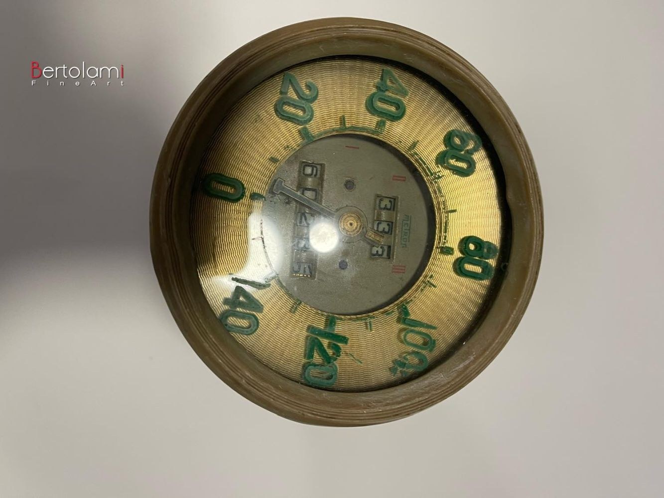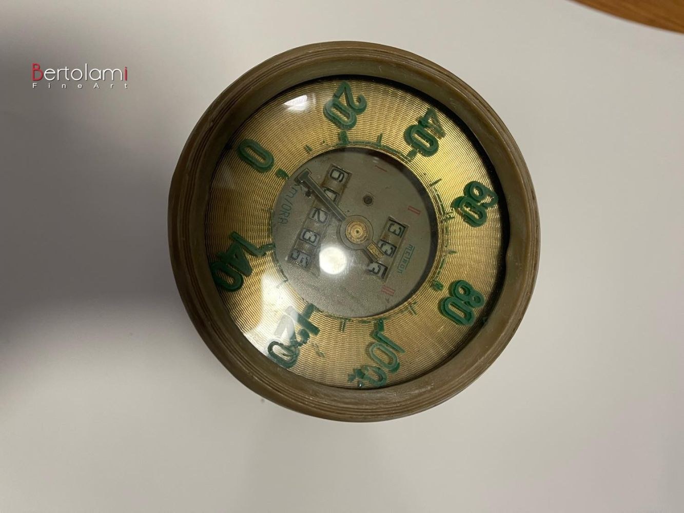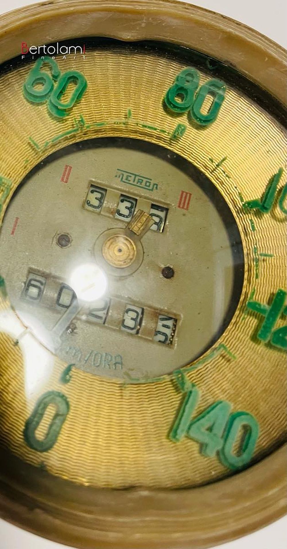 Classic gold-colored speedometer with fluorescent green speed indicatorScale range: 180 km/hCurrent mileage: 60,233 kmBrand: MetroPreserved, some discoloration on the numbers