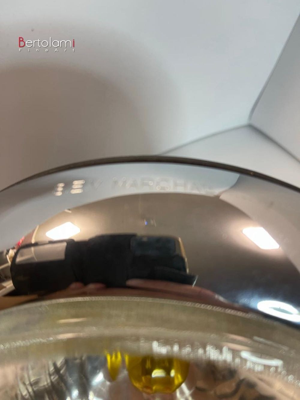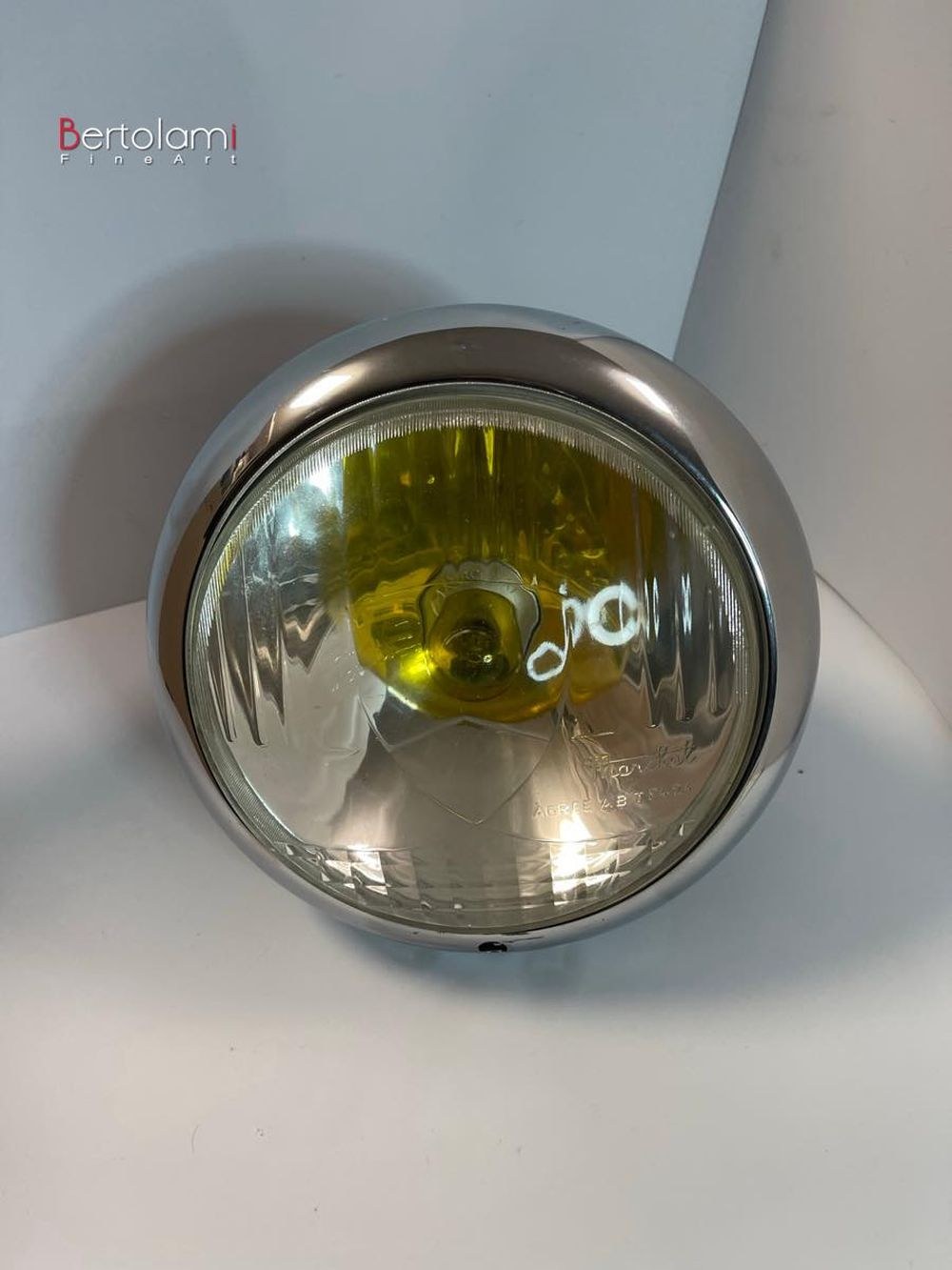 Complete with chrome-plated steel frameFrame diameter: 22.5 cm, internal diameter: 18 cm, marked Sev MarchallGlass diameter: 18 cmGlass code: agree ab tp 424Black painted anodized steel headlight support, complete with rubber gaskets, diameter: 22 cmEquipped with a yellow bulbHeadlights suitable for Lancia AureliaNew and unusedAdditionally, 6 anodized turquoise bolts have been added.