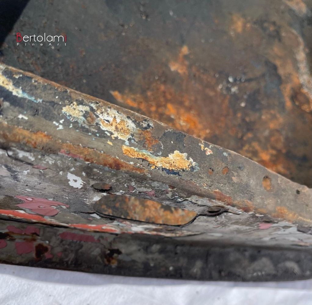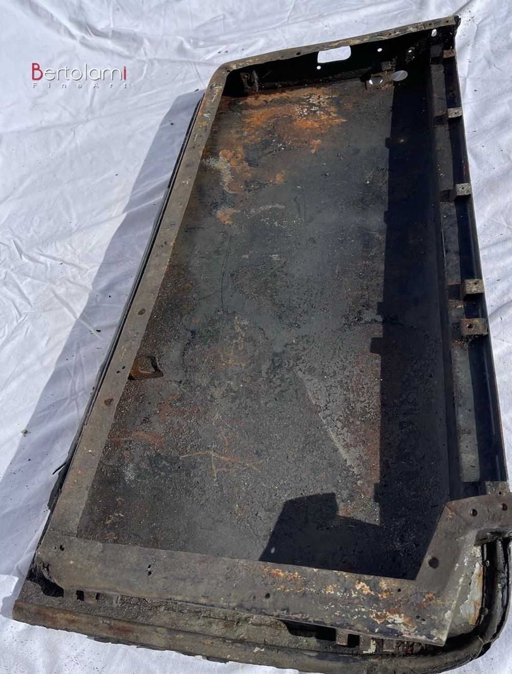 Original door made entirely of steelThe door is still in its original paint, but it requires restoration due to age-related defectsGood foundation for restorationThe door is stripped of all movable and fixed parts, and only the steel frame is present.