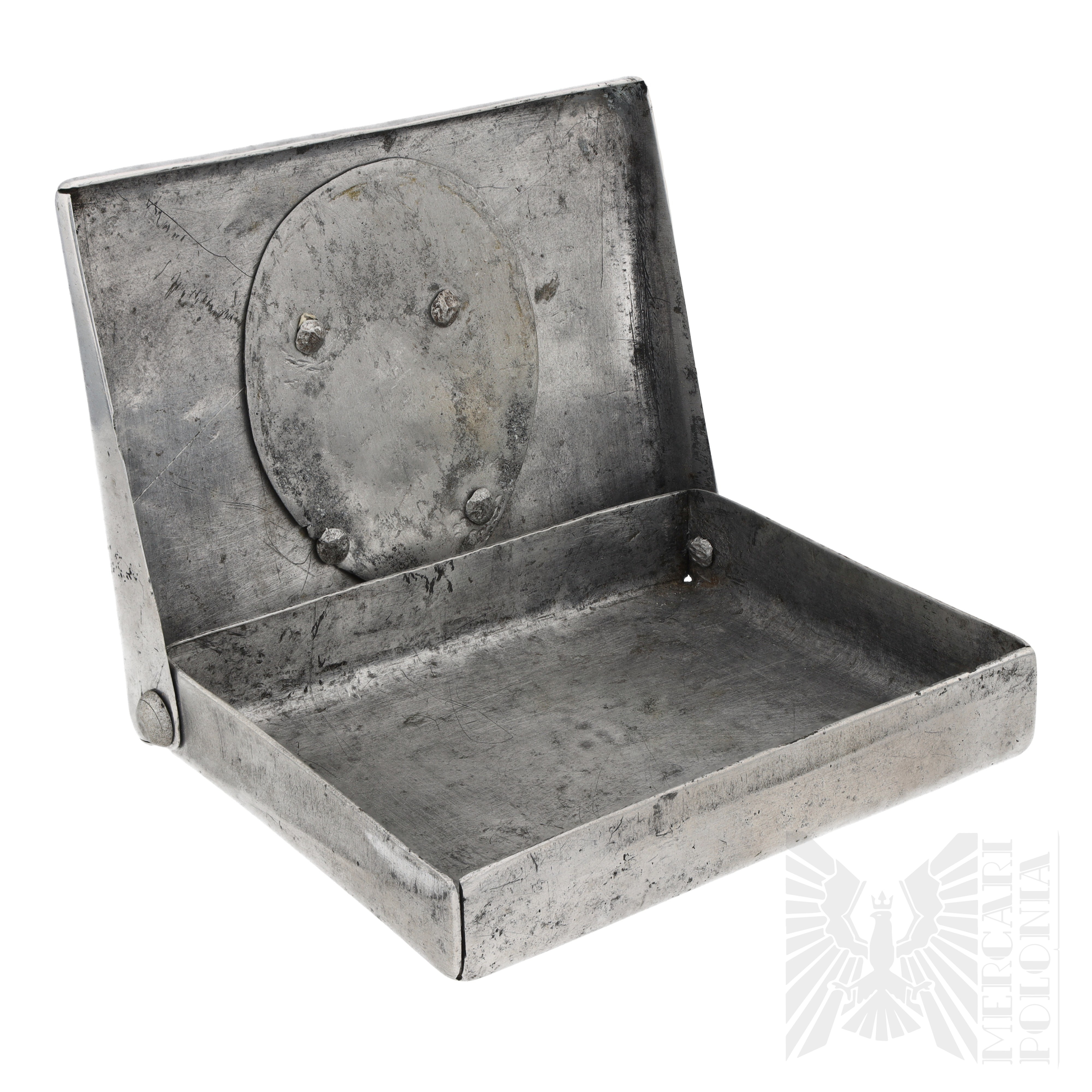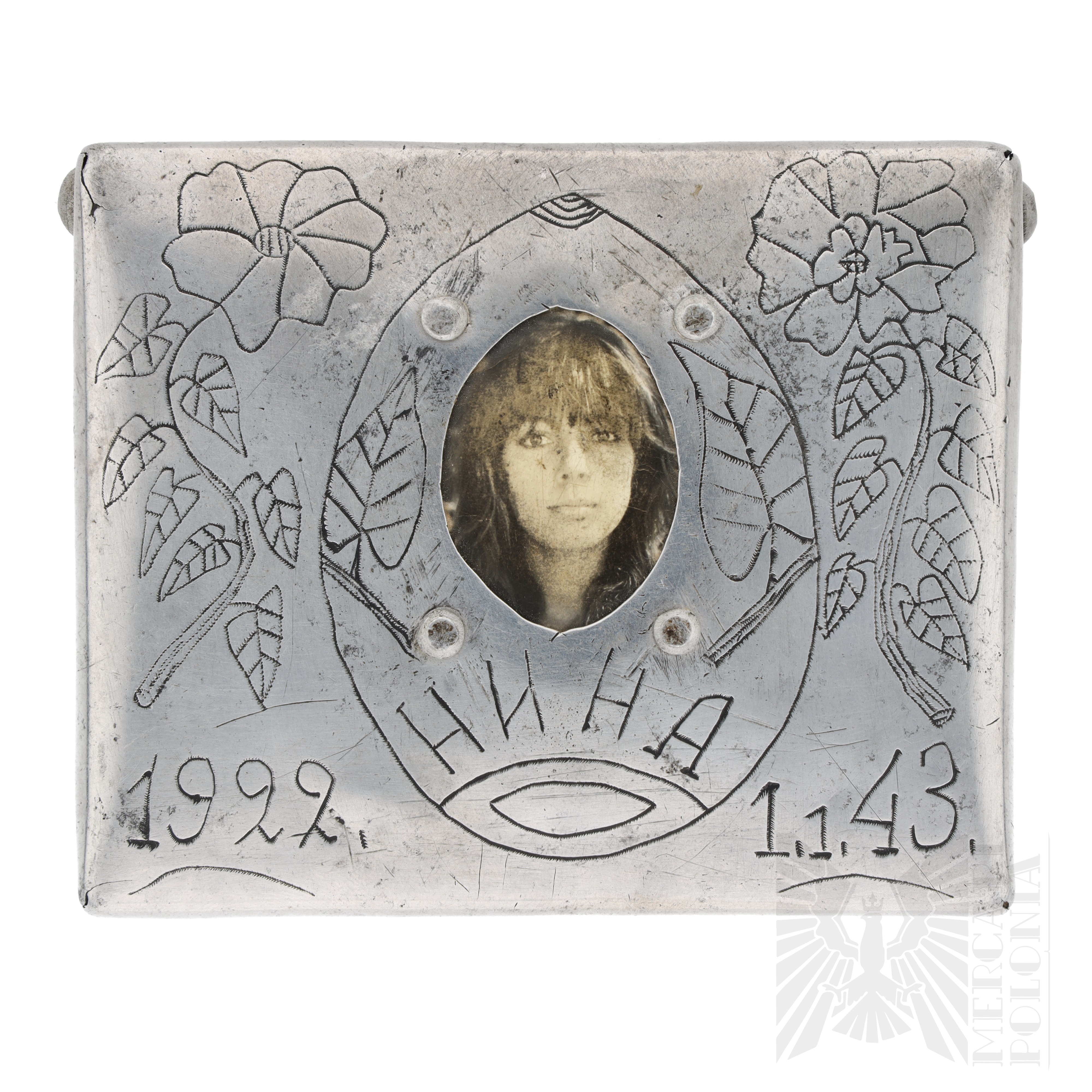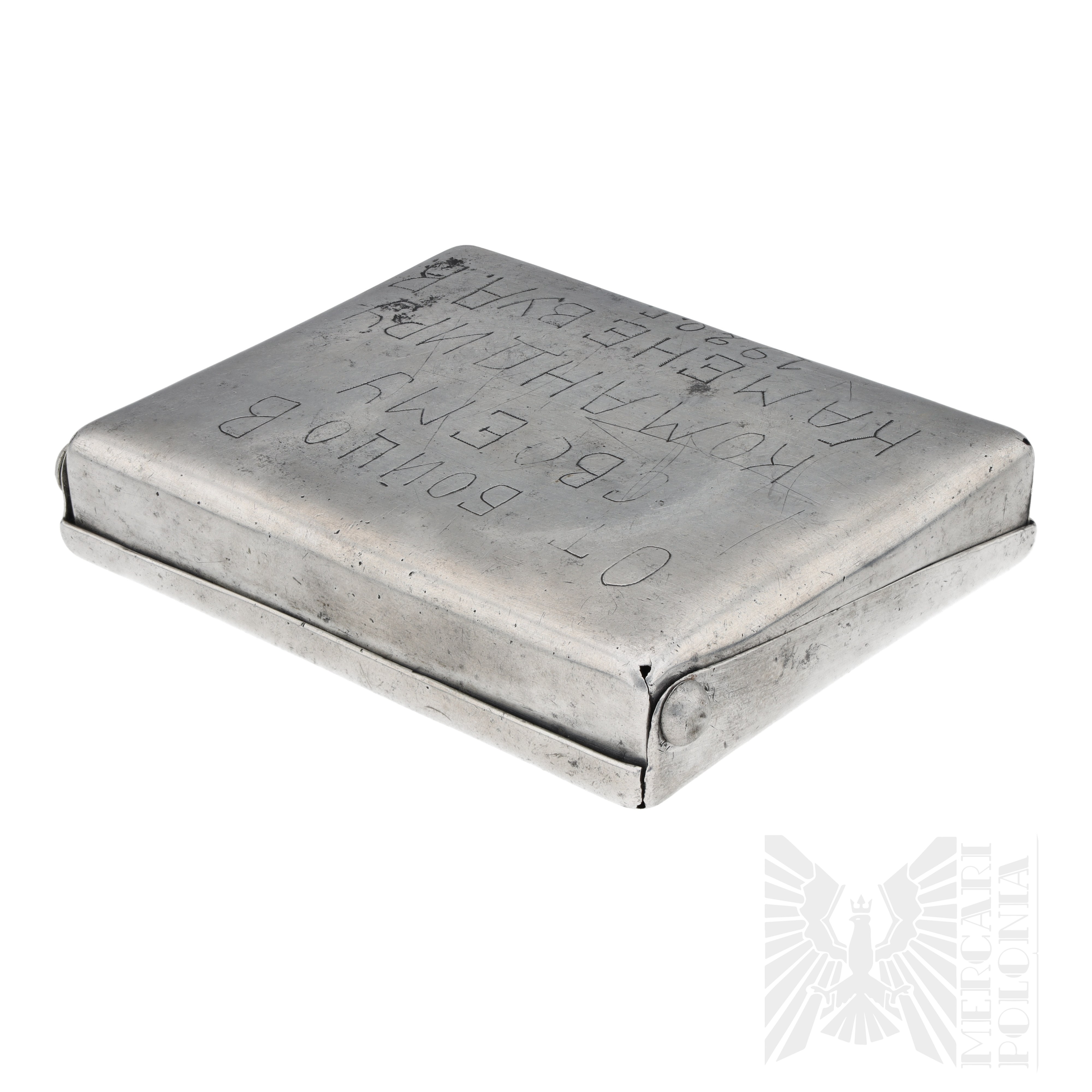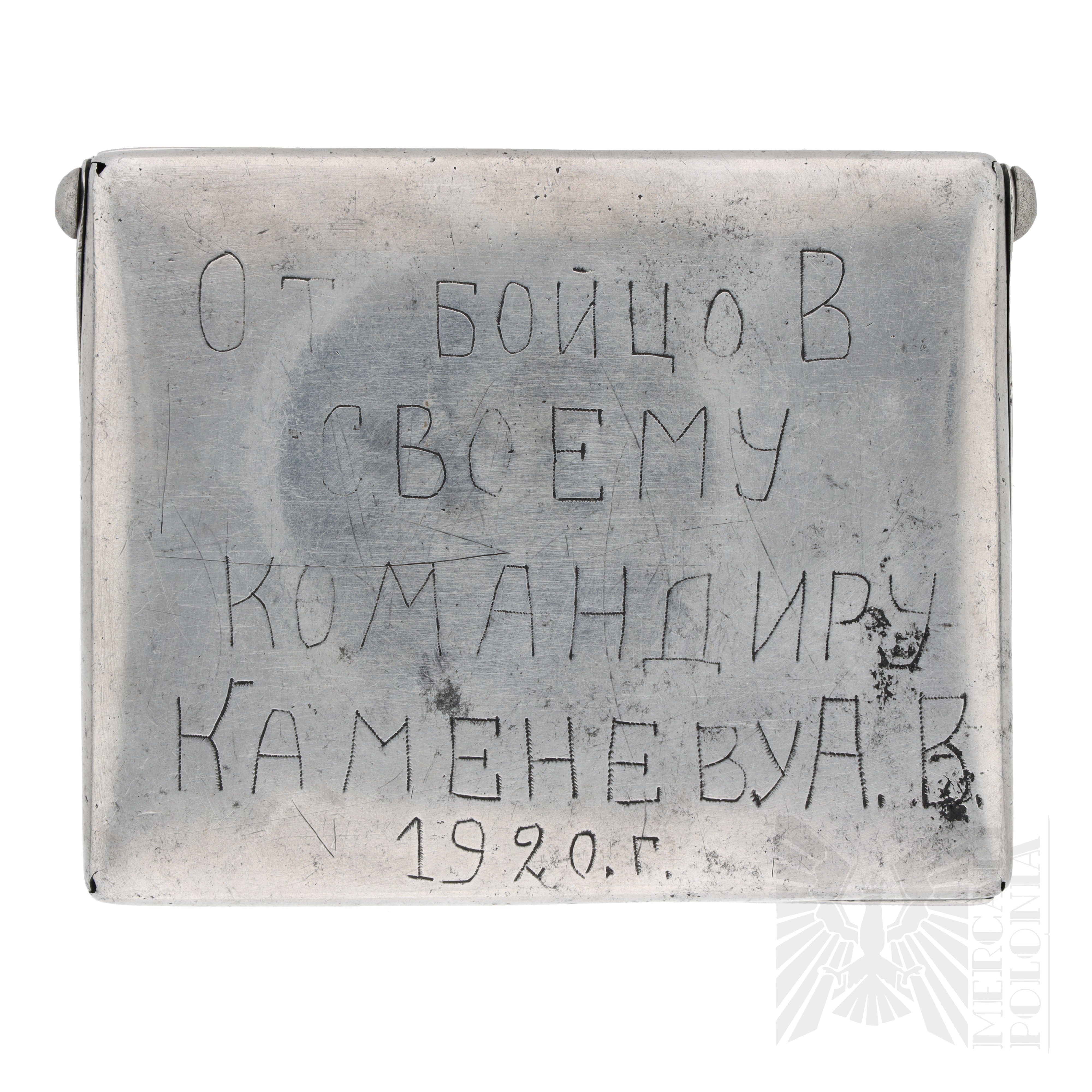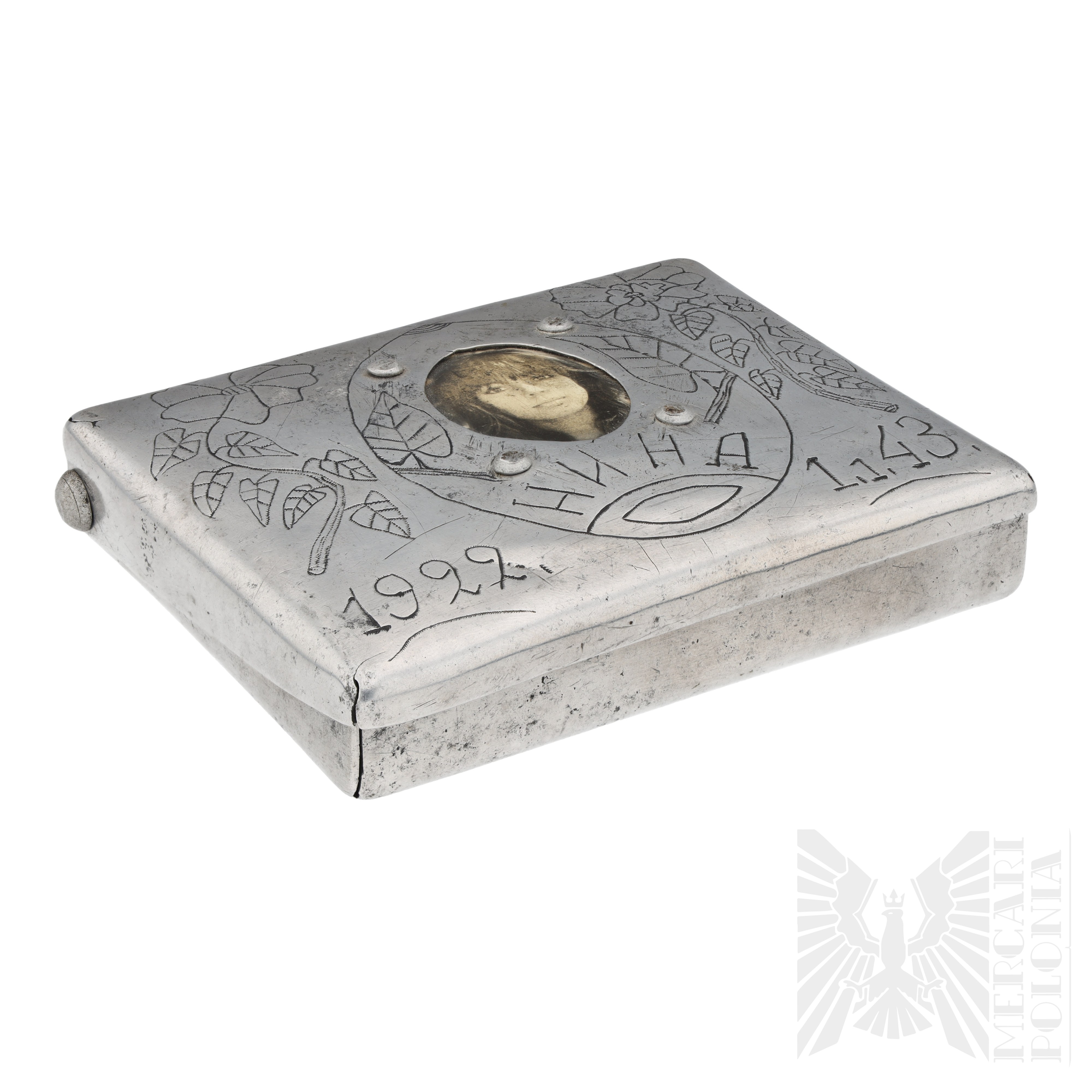 Przykład tak zwanej sztuki okopowej. Papierośnica wykonana ręcznie przez żołnierza Armii Czerwonej. Ozdobiona florystycznymi wzorami po bokach, w centralnej części umiejscowione zdjęcie kobiety z podpisem "Anna". Na dole po bokach daty “1922” i “1.1.1943”. Na rewersie wygrawerowane „Od żołnierzy dla swojego dowódcy Kamieniewa A.W. 1920 r.”