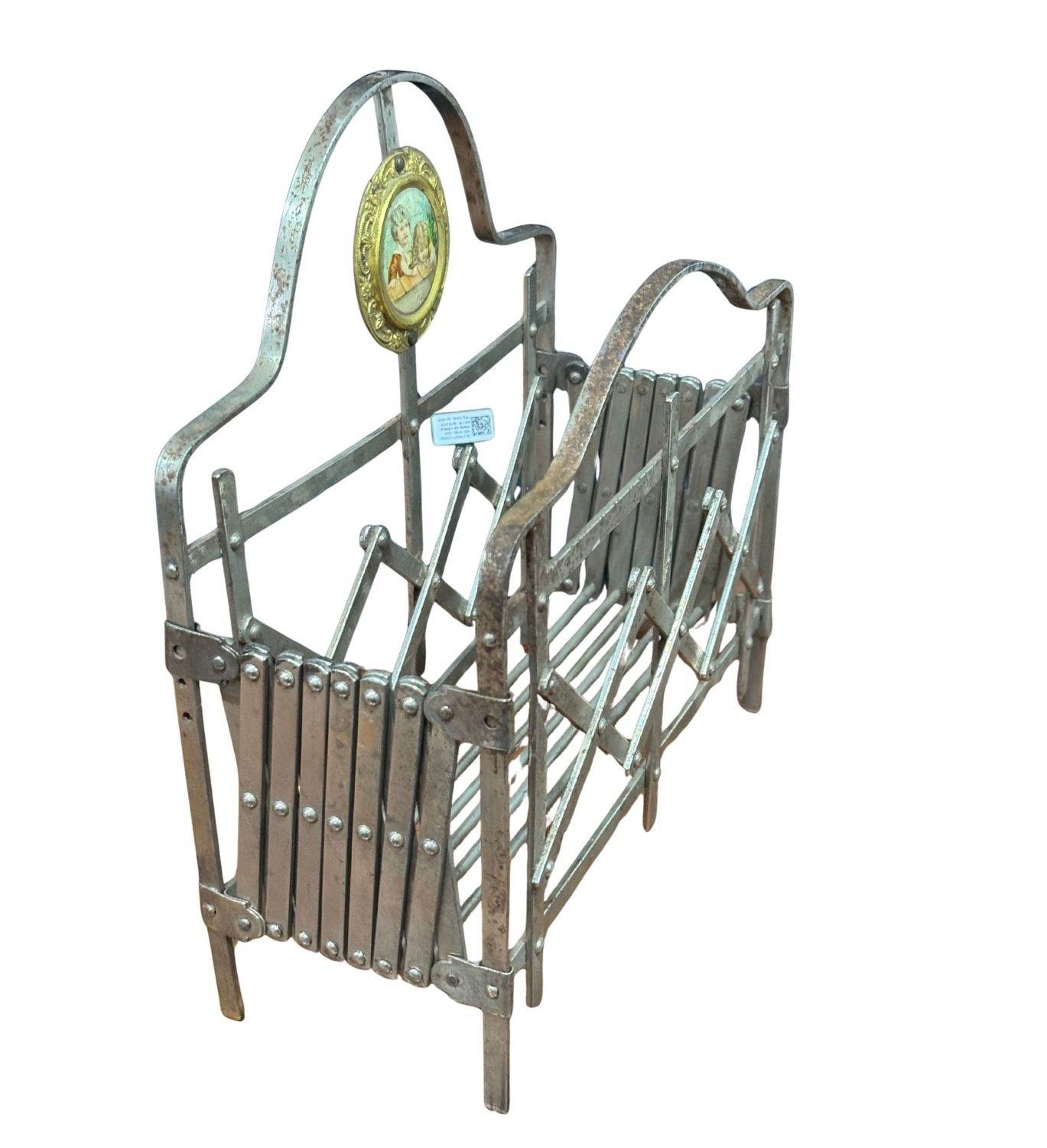 Extendable metal cradle for the Baby Jesus with a small miniature depicting two children. Fully extended: 50x23 cm. In good condition with slight signs of wear, as shown in the attached photos.