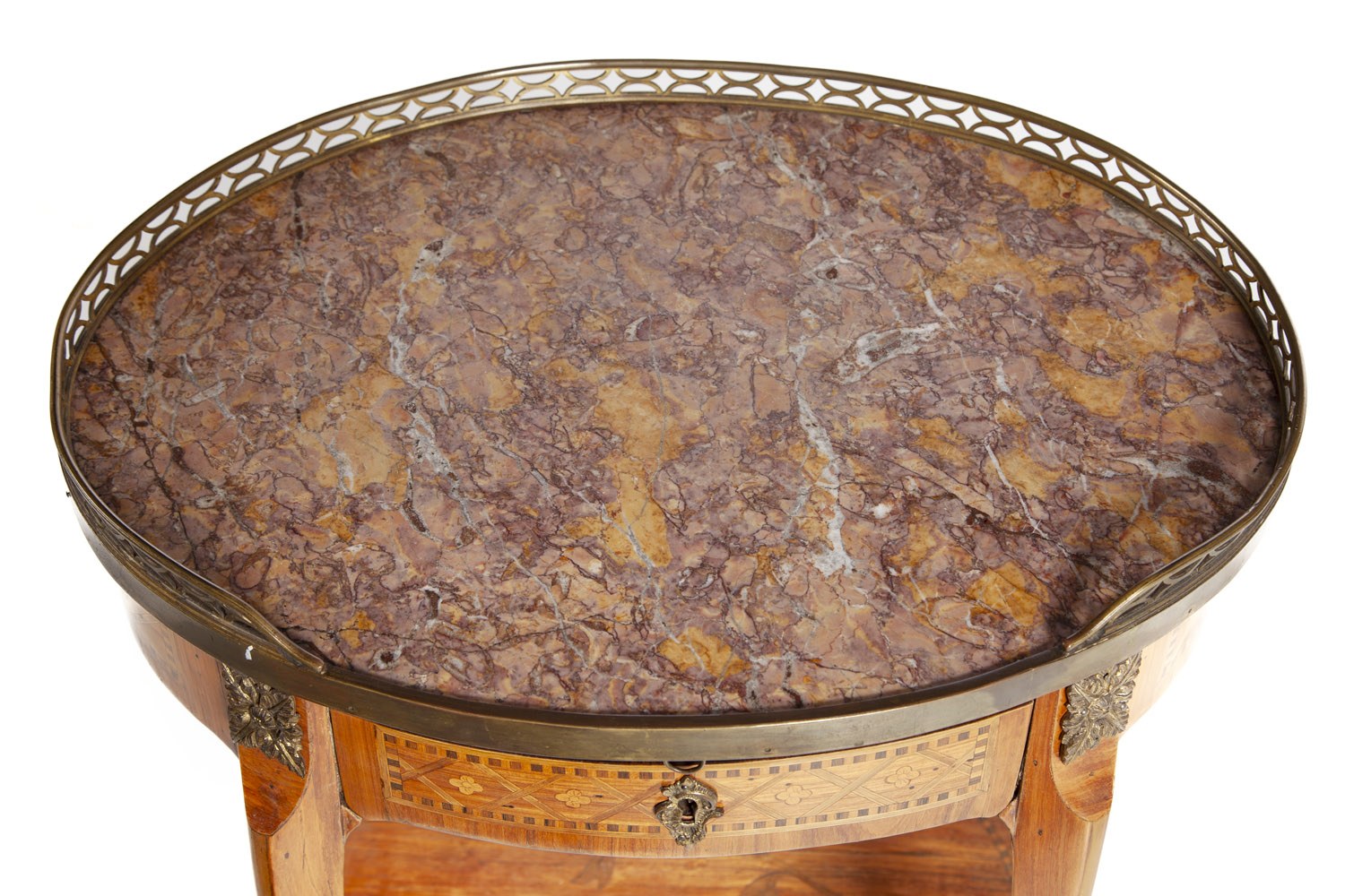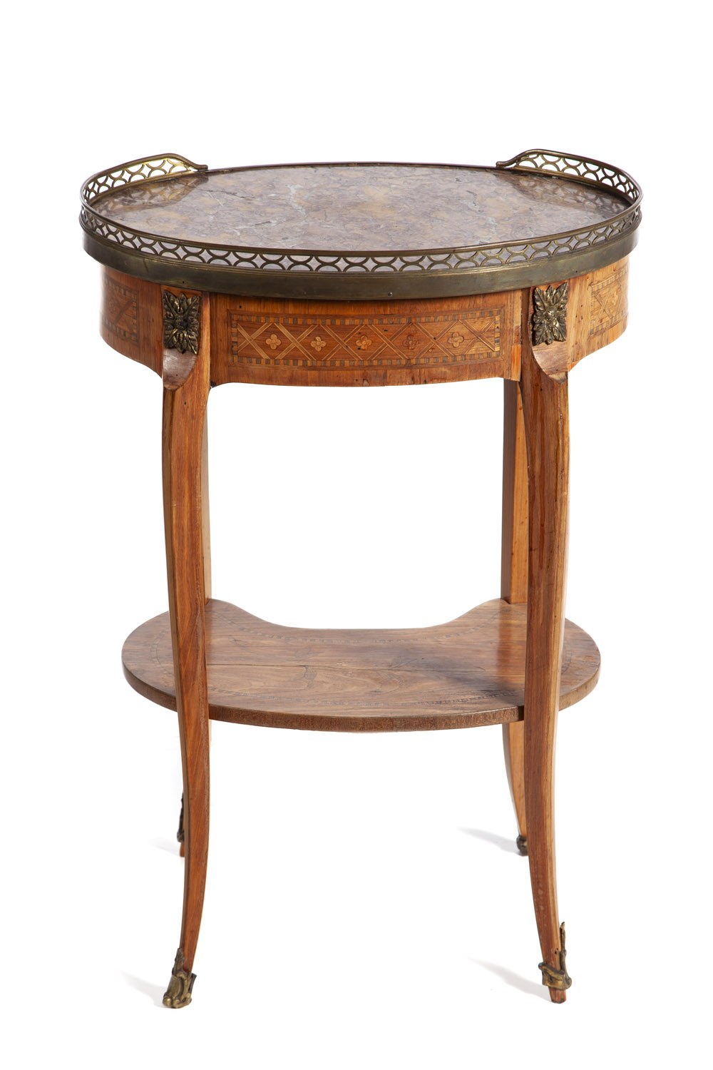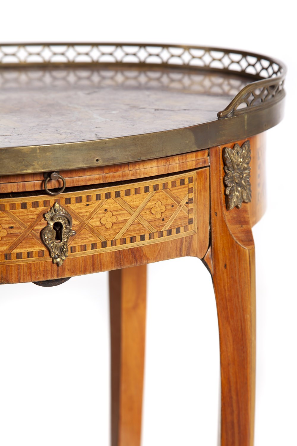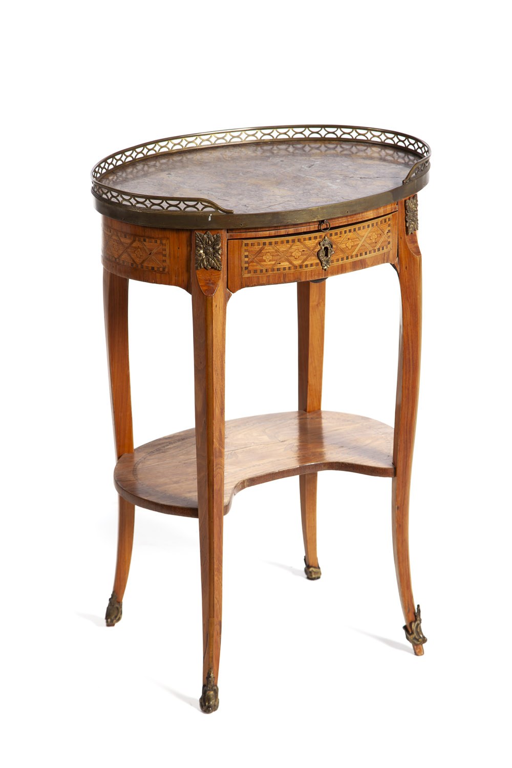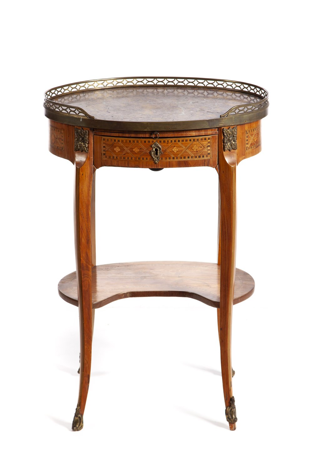 fornir z drzewa różanego, intarsja na licu i półce, blat marmurowy z mosiężną galeryjką, okucia i ornamenty mosiężne