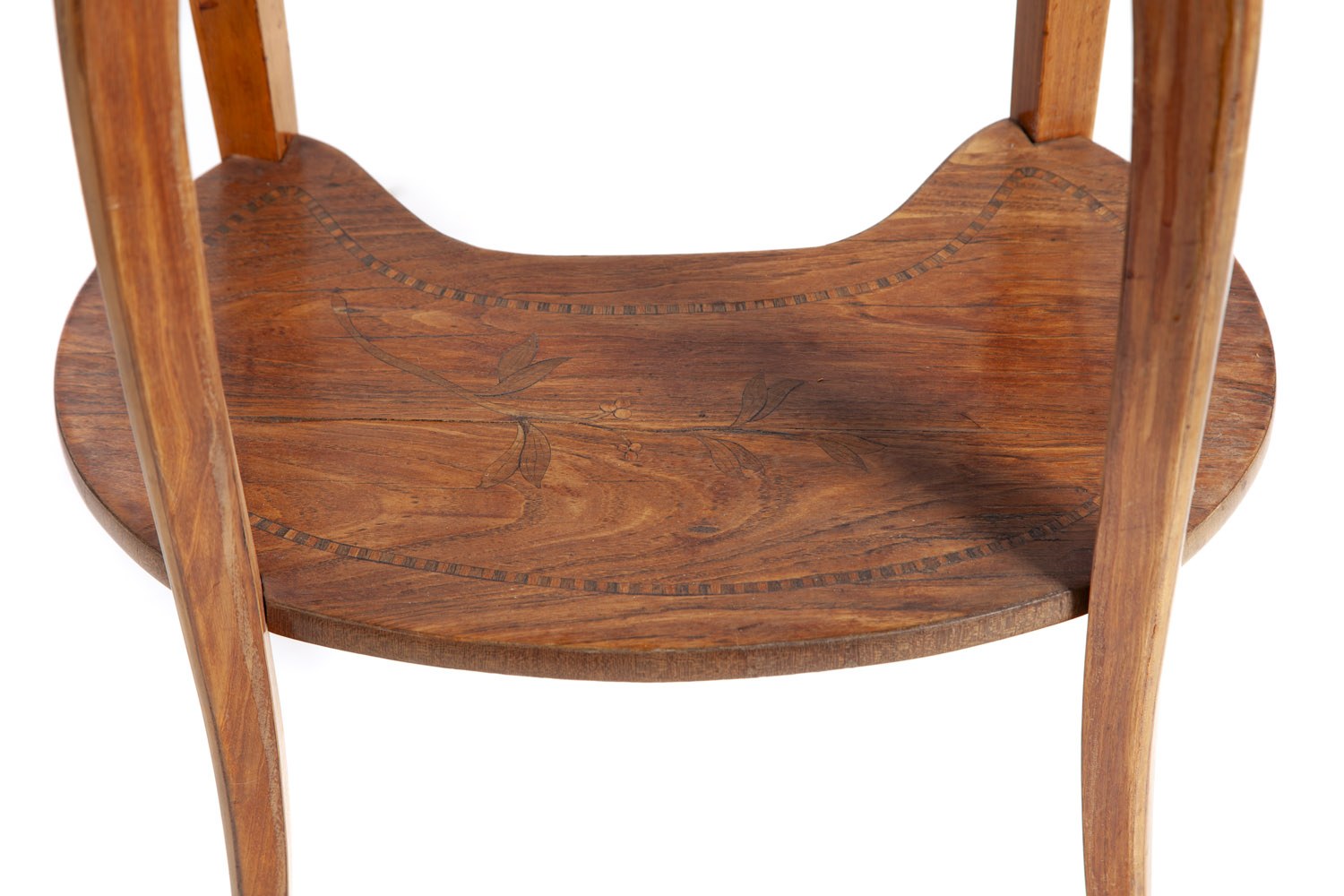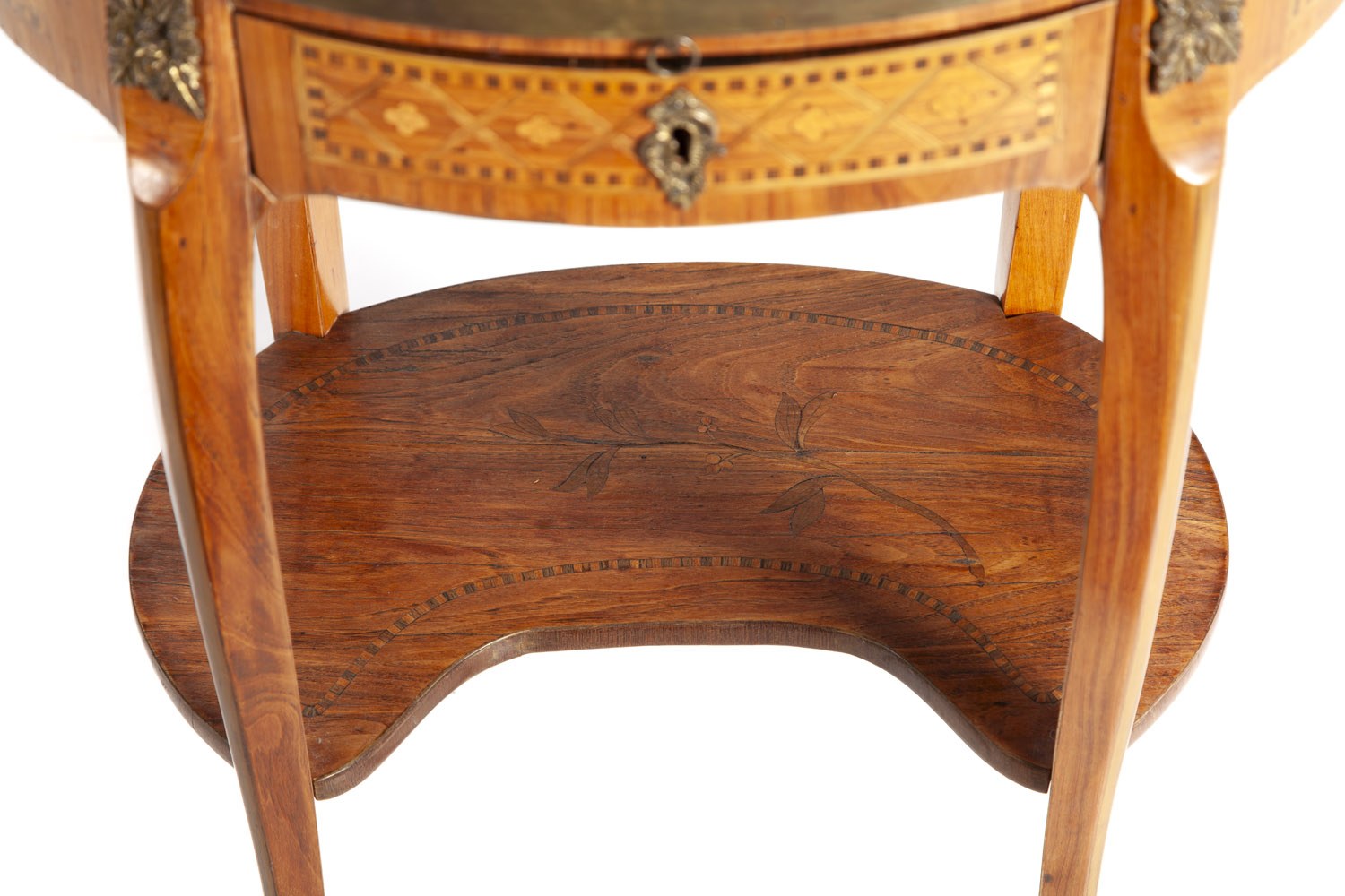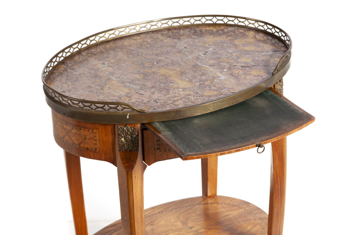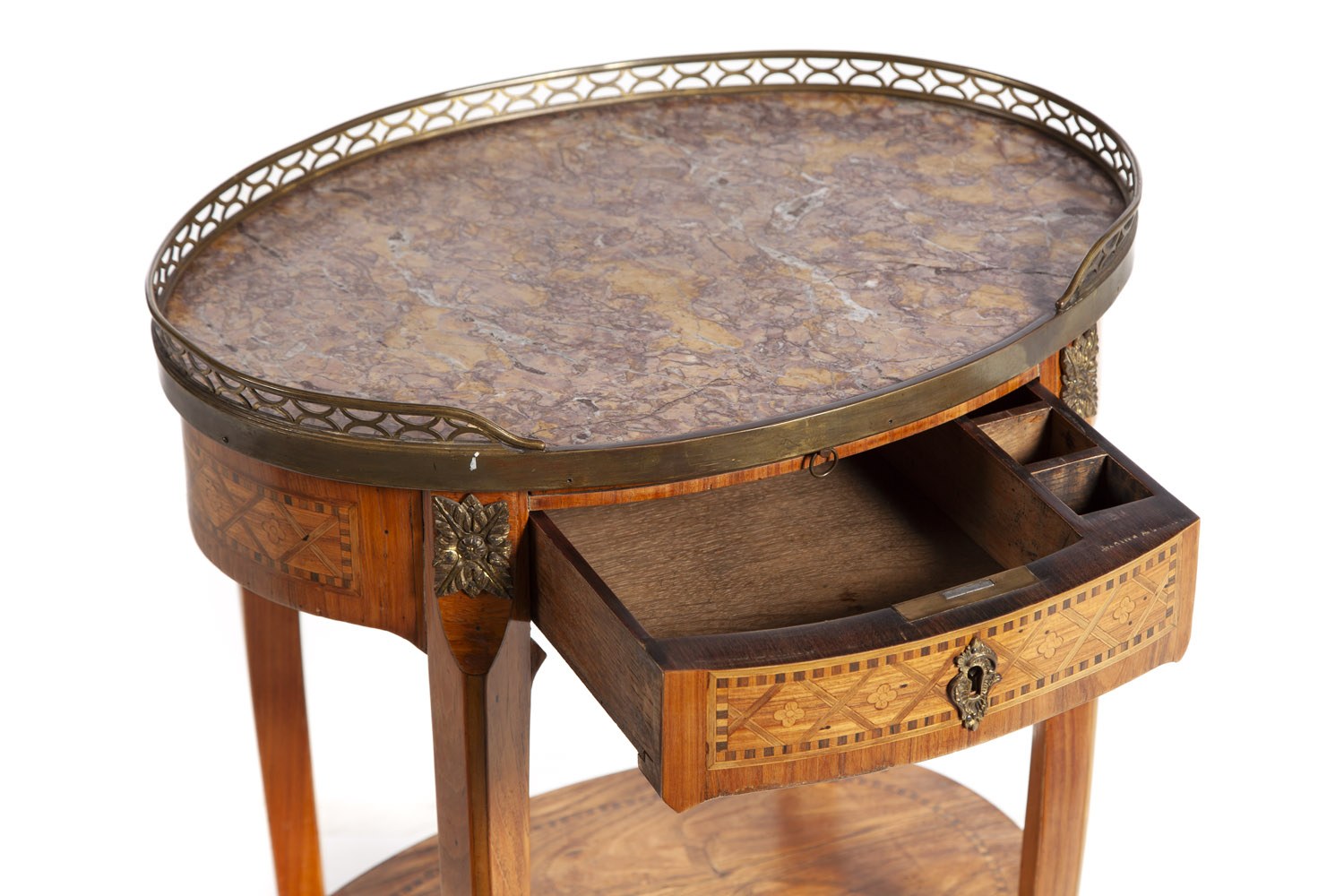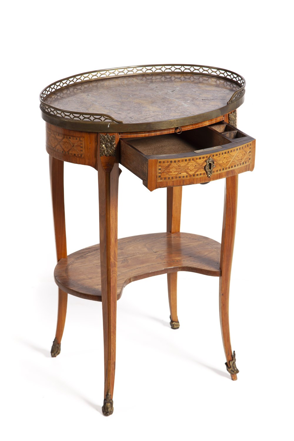 fornir z drzewa różanego, intarsja na licu i półce, blat marmurowy z mosiężną galeryjką, okucia i ornamenty mosiężne