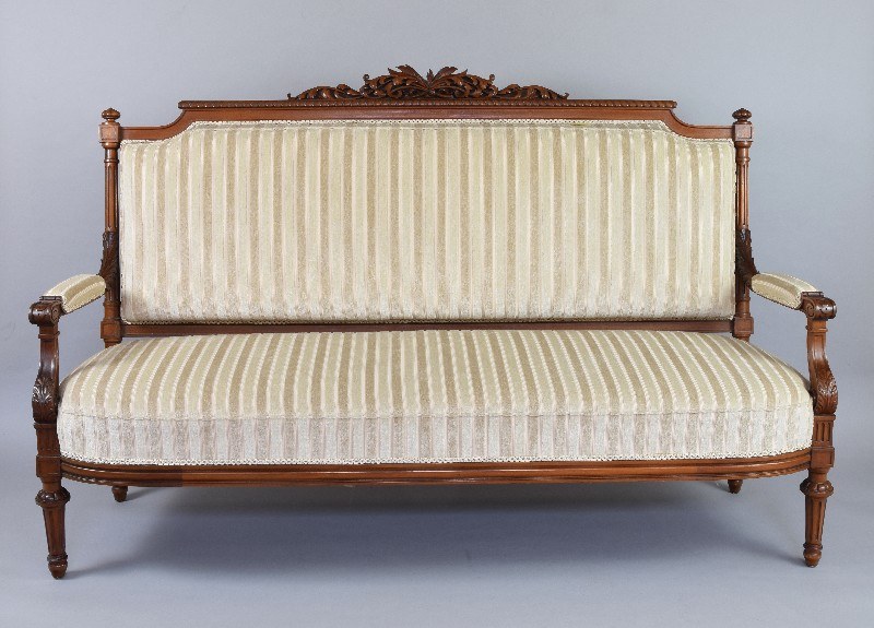 Masywna, z tapicerowanym prostym siedzeniem zaokrąglonym lekko od frontu i oparciem wypiętrzonym nieznacznie po środku, którego górny ramiak zwieńczono rzeźbionymi liśćmi, z poręczami z wyściełanymi podłokietnikami, wsparte na esownicach pokrytych płaskorzeźbionymi liśćmi, wsparta na czterech tralkach, kanelowanych, zbieżnych ku dołowi.