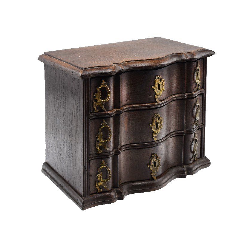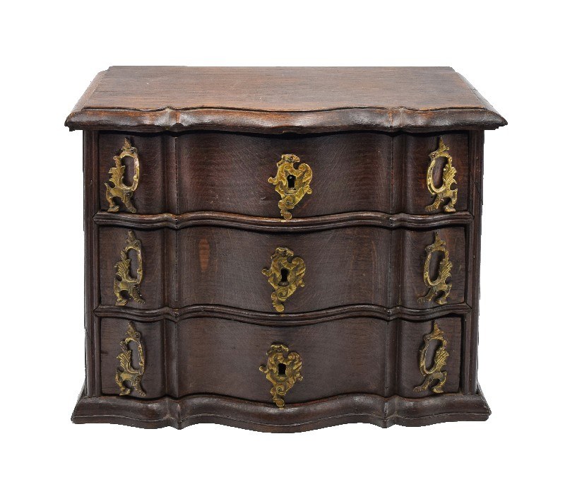 Miniaturowe meble były wykonywane, jako meble dla lalek, ale także modele mebli oferowane przez wykonawców klientom, by mogli zorientować się w formie i funkcji, lub też, jako sprzęty do przechowywania biżuterii, bibelotów, czy utensyliów, np. do pisania, i innych celów. Prezentowana komódka naśladuje formy komód niemieckich z połowy XVIII wieku.