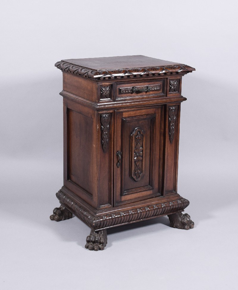 drewno barwione na ciemny brąz, uchwyt mosiężny83 x 60 x 42,8 cm.