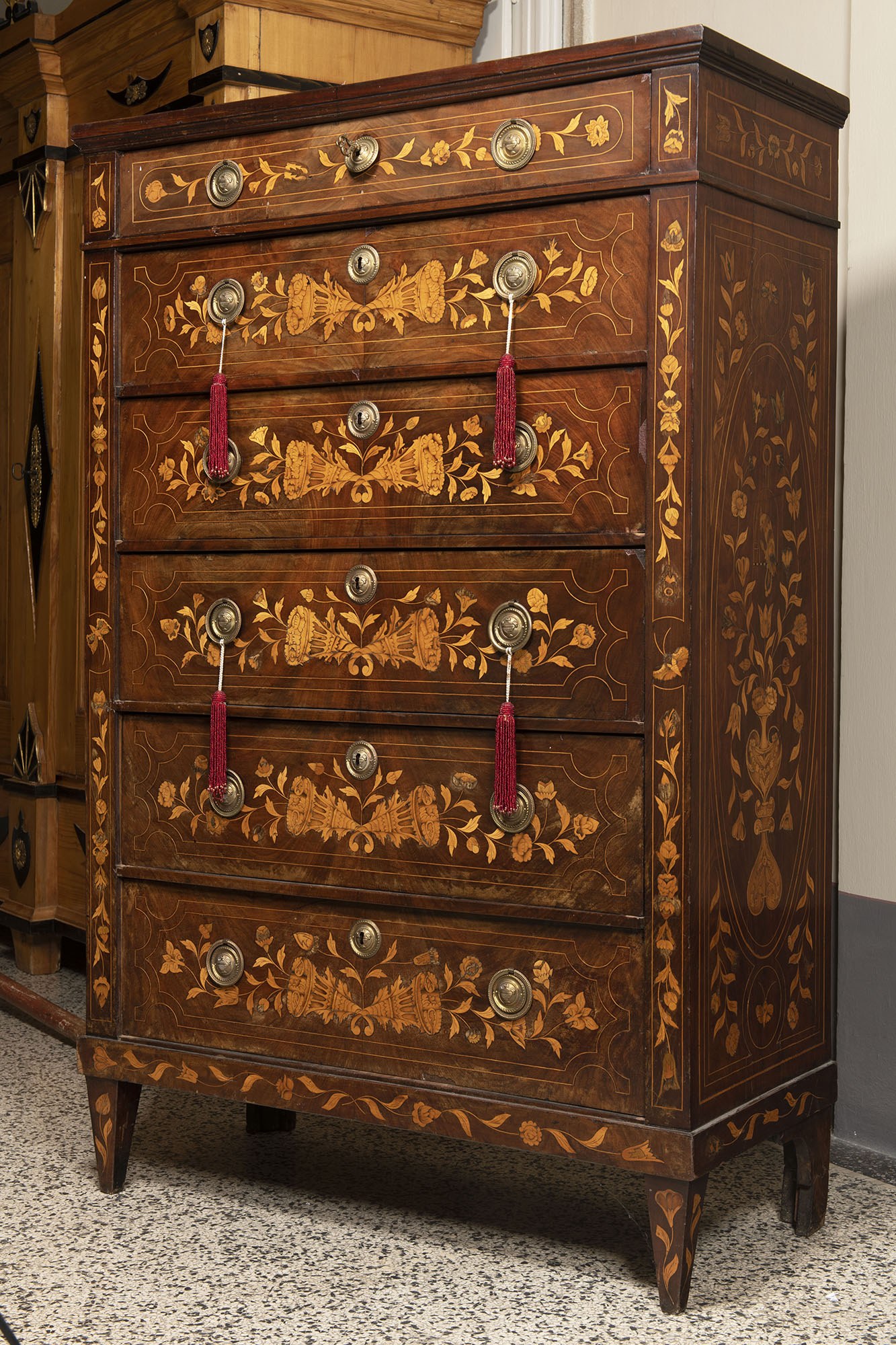 Very Nice Chest of Drawers, 19th Century, body with 6 drawers, rich floral inlays, H 153 cm, W 98 cm, D 45 cm