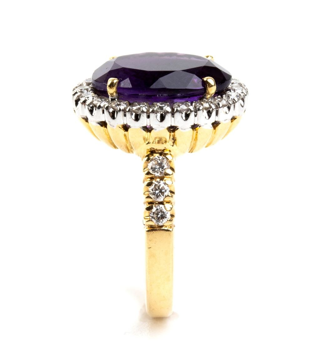 18k yellow gold, set with amethyst framed by diamonds. N. 26 round shape brilliant cut diamonds approx. 0.80 ct, F-G, IF-VVS. Hallmarked "750 - 120 PG".