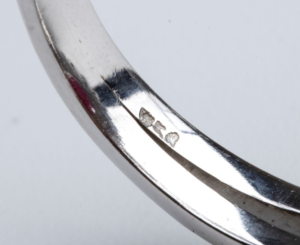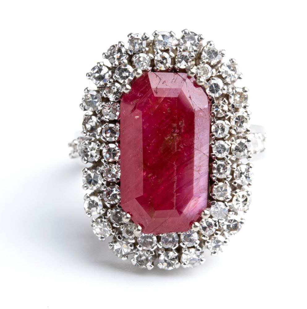 18k white gold, embellished by a central ruby surrounded by two rows of diamonds.