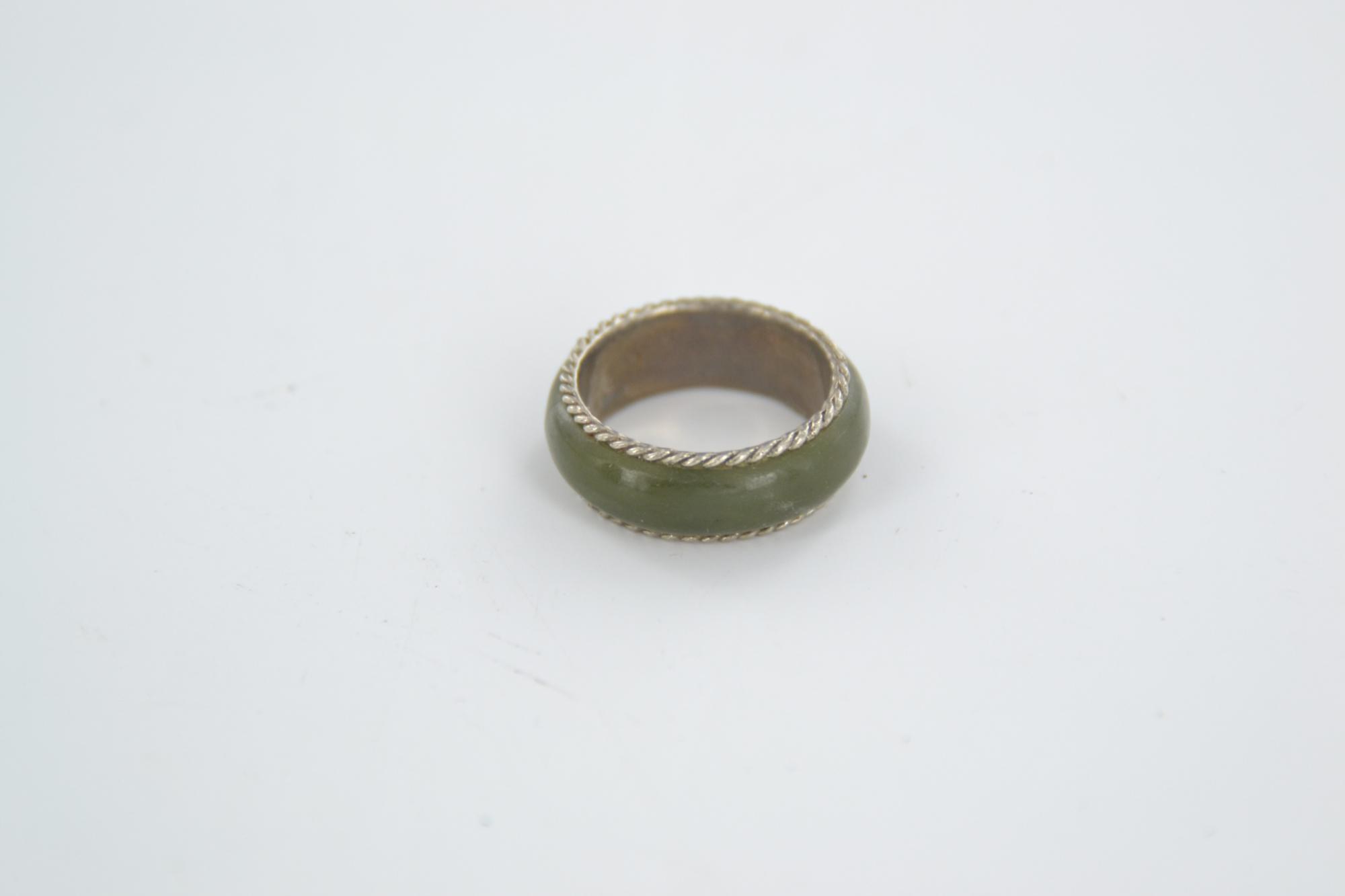 Fantazyjny pierścionek-obrączka w kolorze zielonym, z fantazyjnie uformowaną obwódką.