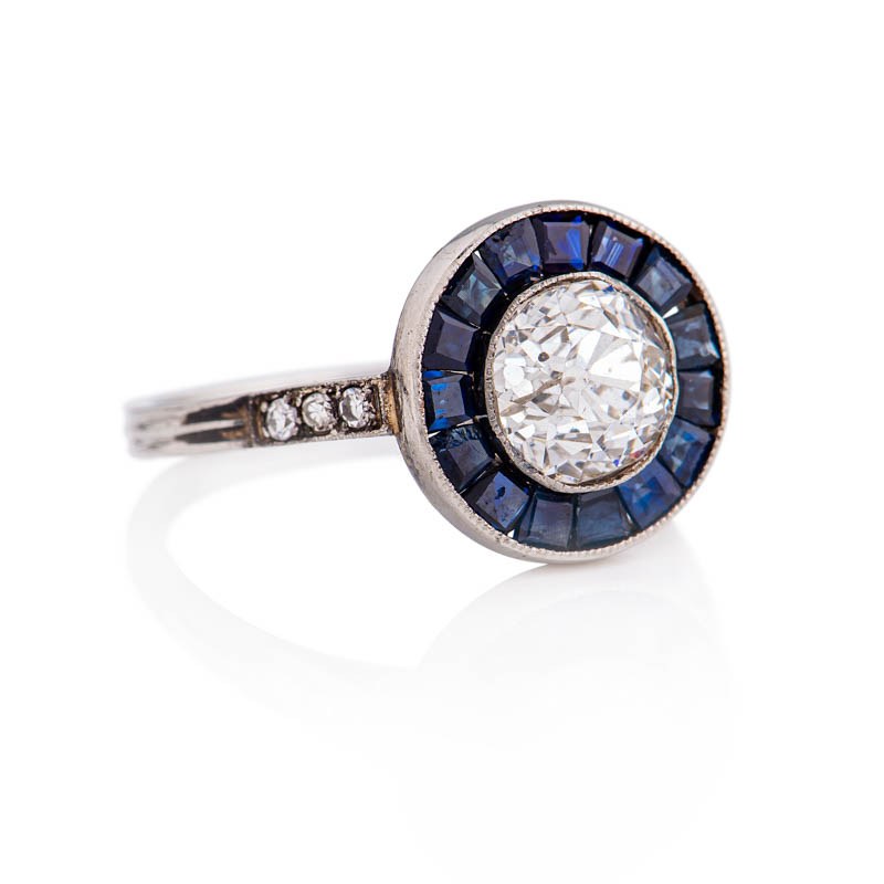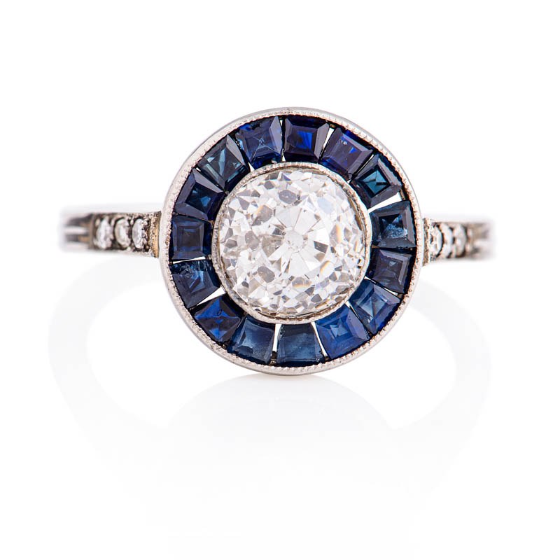 platyna, 1 szt. diament ~ 1,50 ct K/P1, 15 szt. szafirów w szlifach carré ł. ~ 0,30 ct, 6 szt. diamentów w szlifach 8/8 ł. ~ 0,07 ct, masa: 3,90 g; rozmiar: 16; stan zachowania: 1 szt. szafir uszkodzony