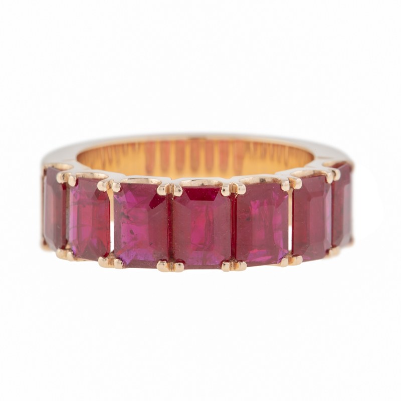 różowe złoto pr. ~ 0,750, 7 szt. rubinów w szlifie szmaragdowym ł. ~ 3,33 ct, masa: 9,10 g; rozmiar: 14