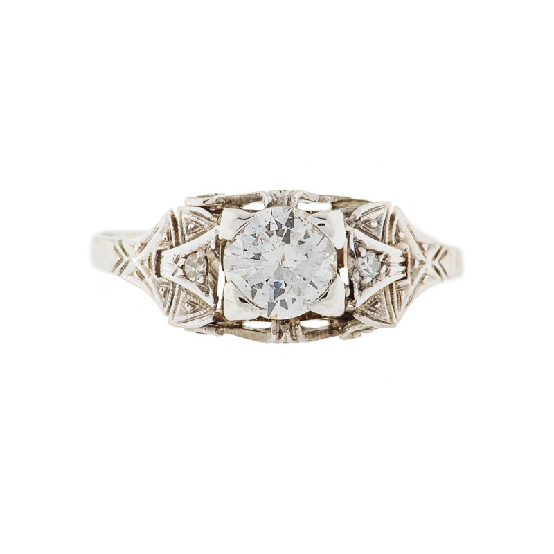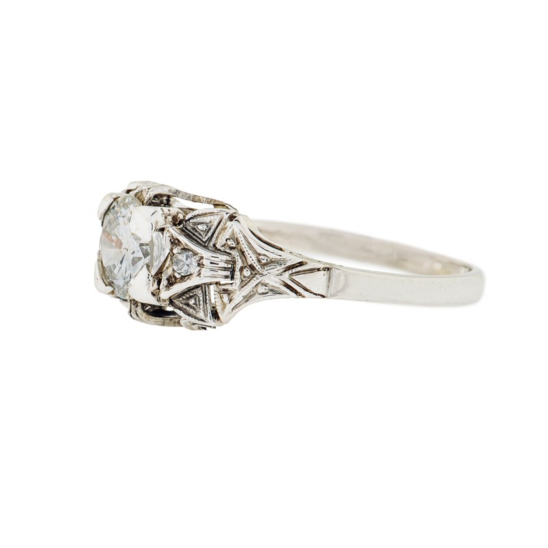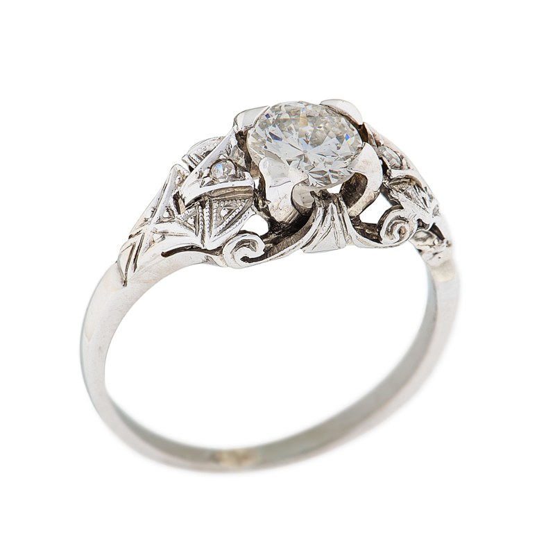 białe złoto pr. ~ 0,585, rodowane, grawerowanie, 1 szt. brylant ~ 0,59 ct H/Si2, 2 szt. diamentów w szlifie 8/8 ł. ~ 0,02 ct H/Si2-P1, masa: 2,25 g; rozmiar: 11