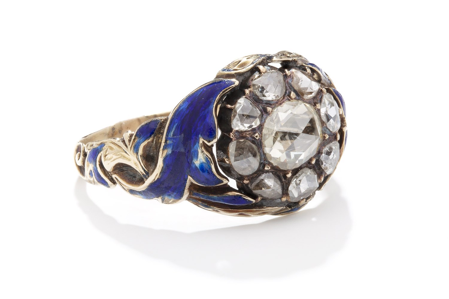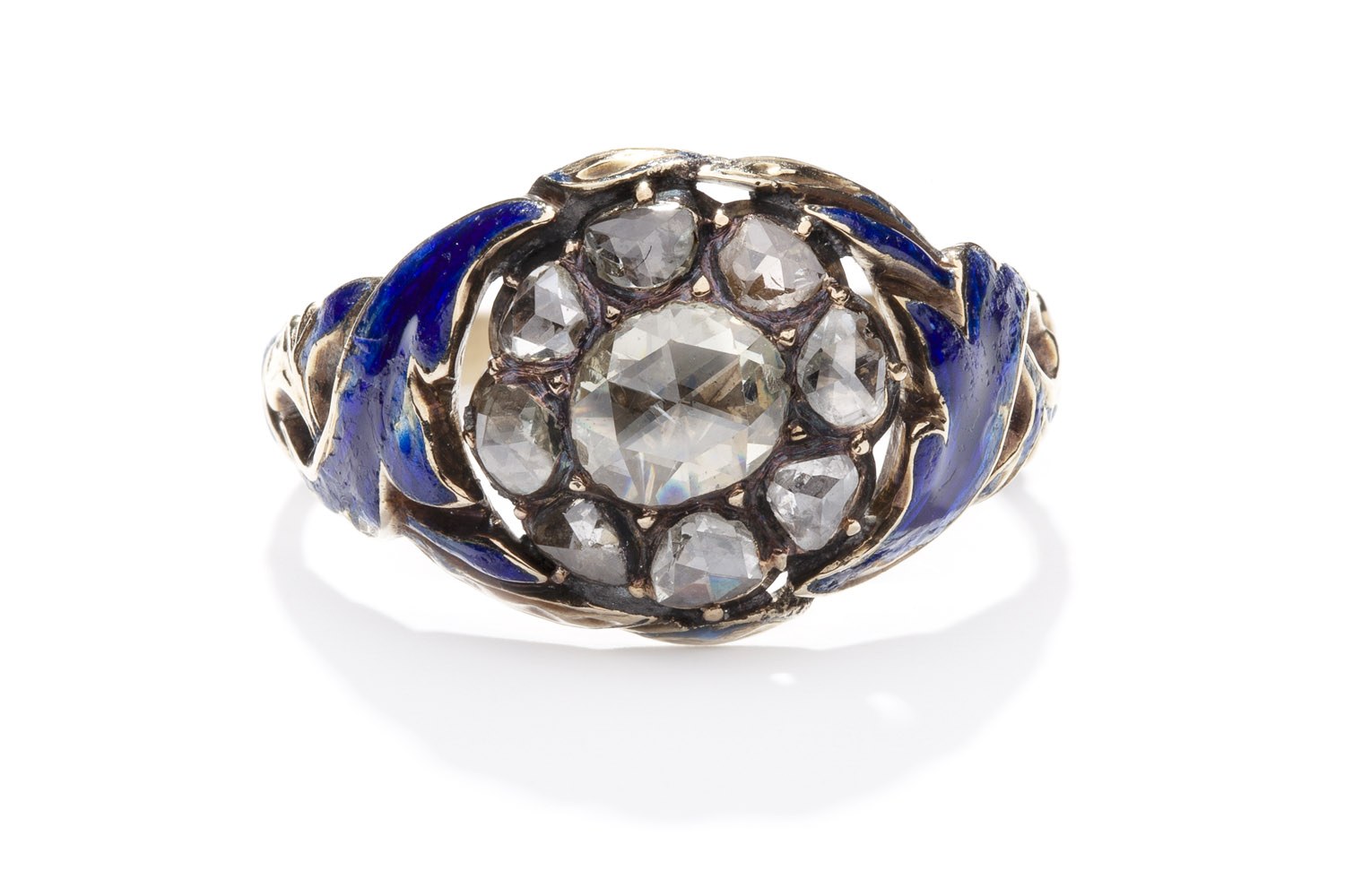 złoto pr. ~ 0,300 i ~ 0,450, metal, 9 rozet diamentowych ł. ~ 0,76 ct H-M/P, masa: 3,54 g, rozmiar: 16*