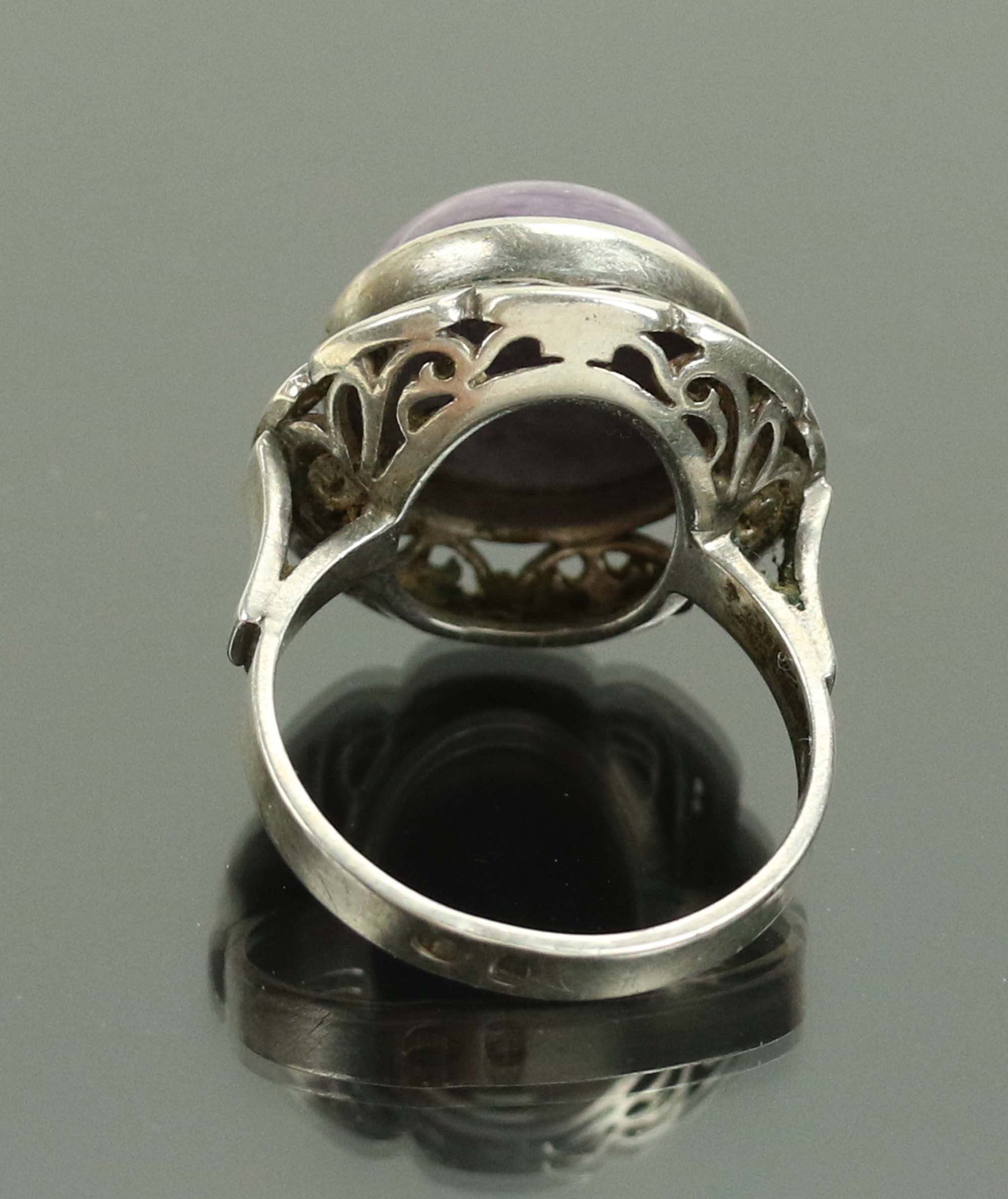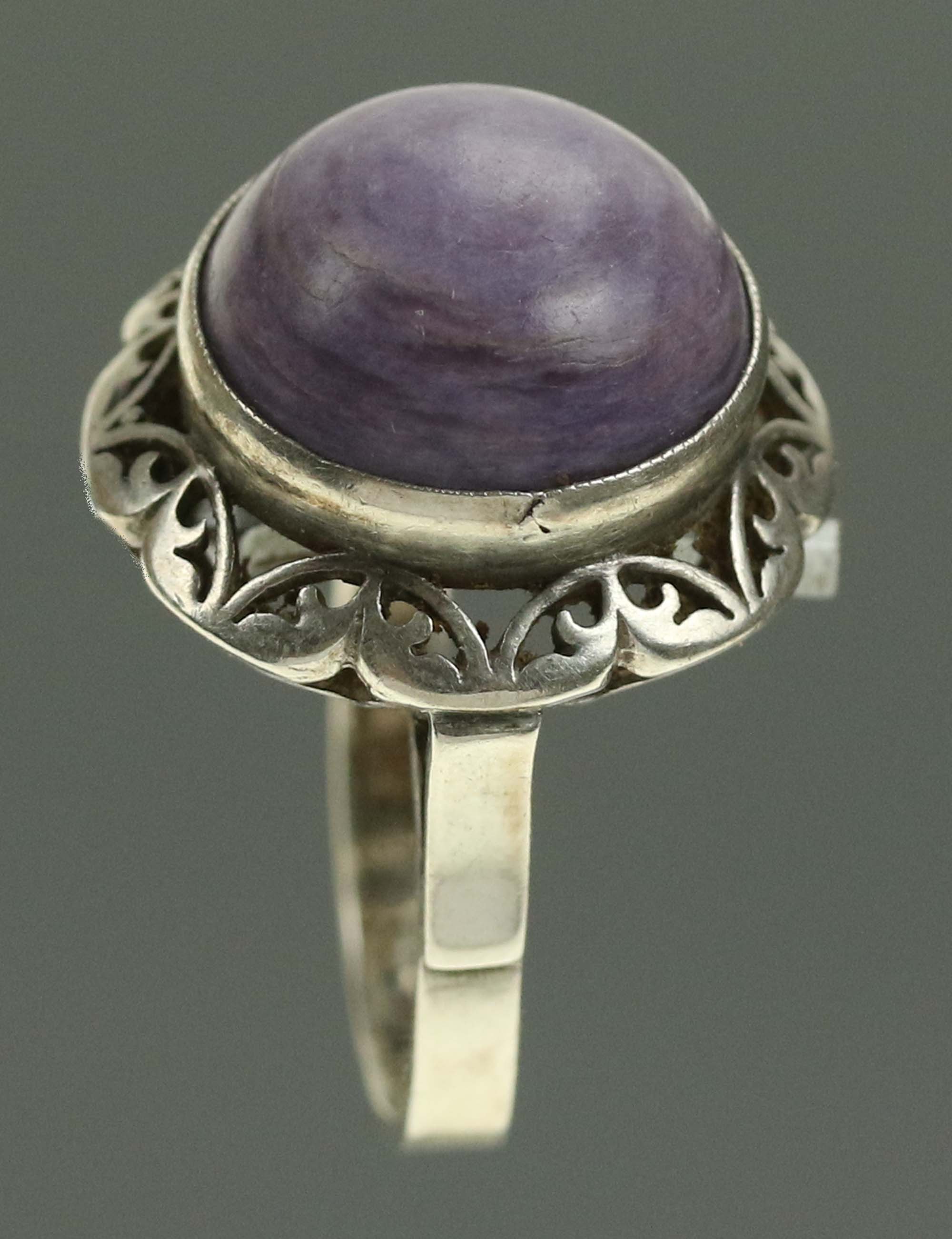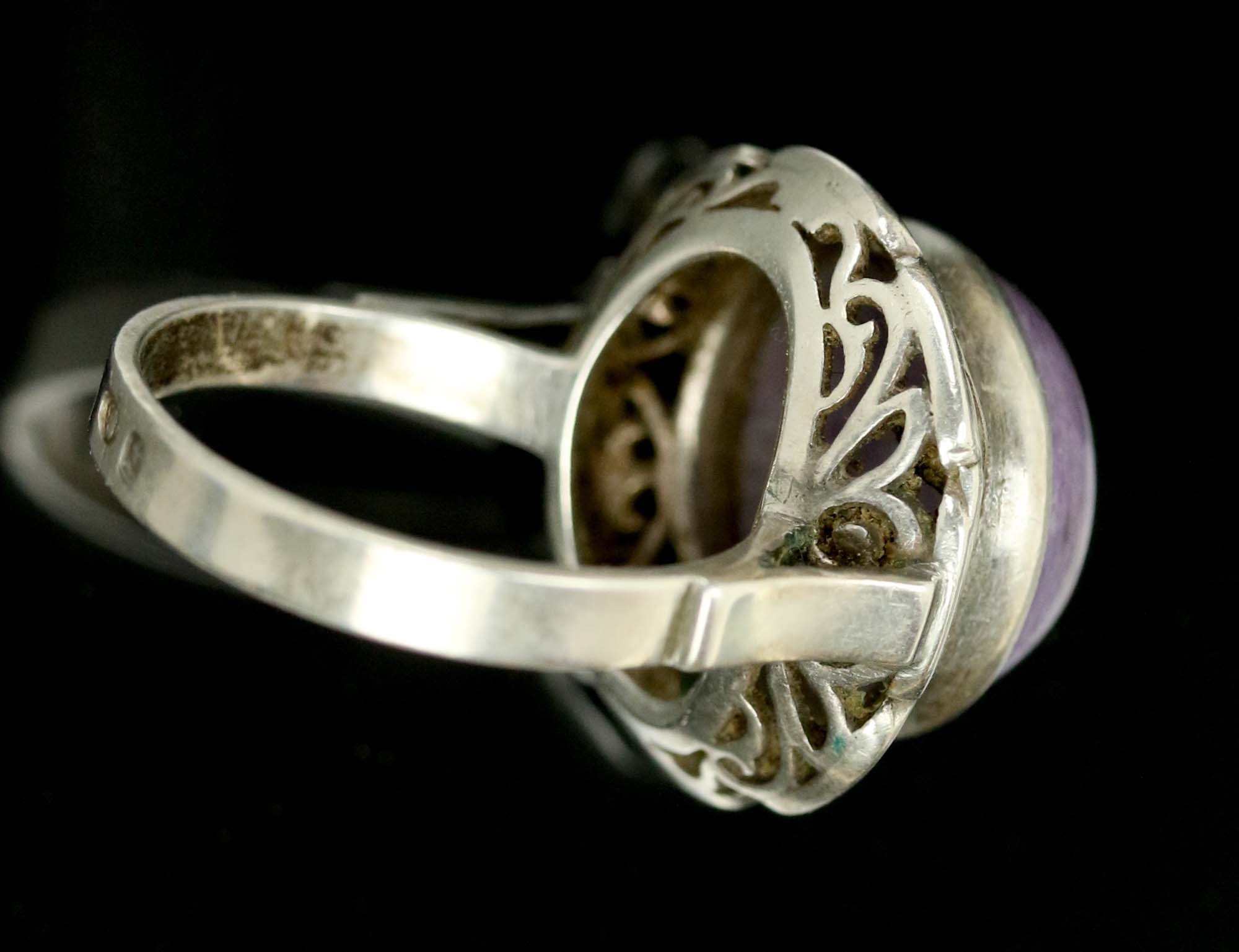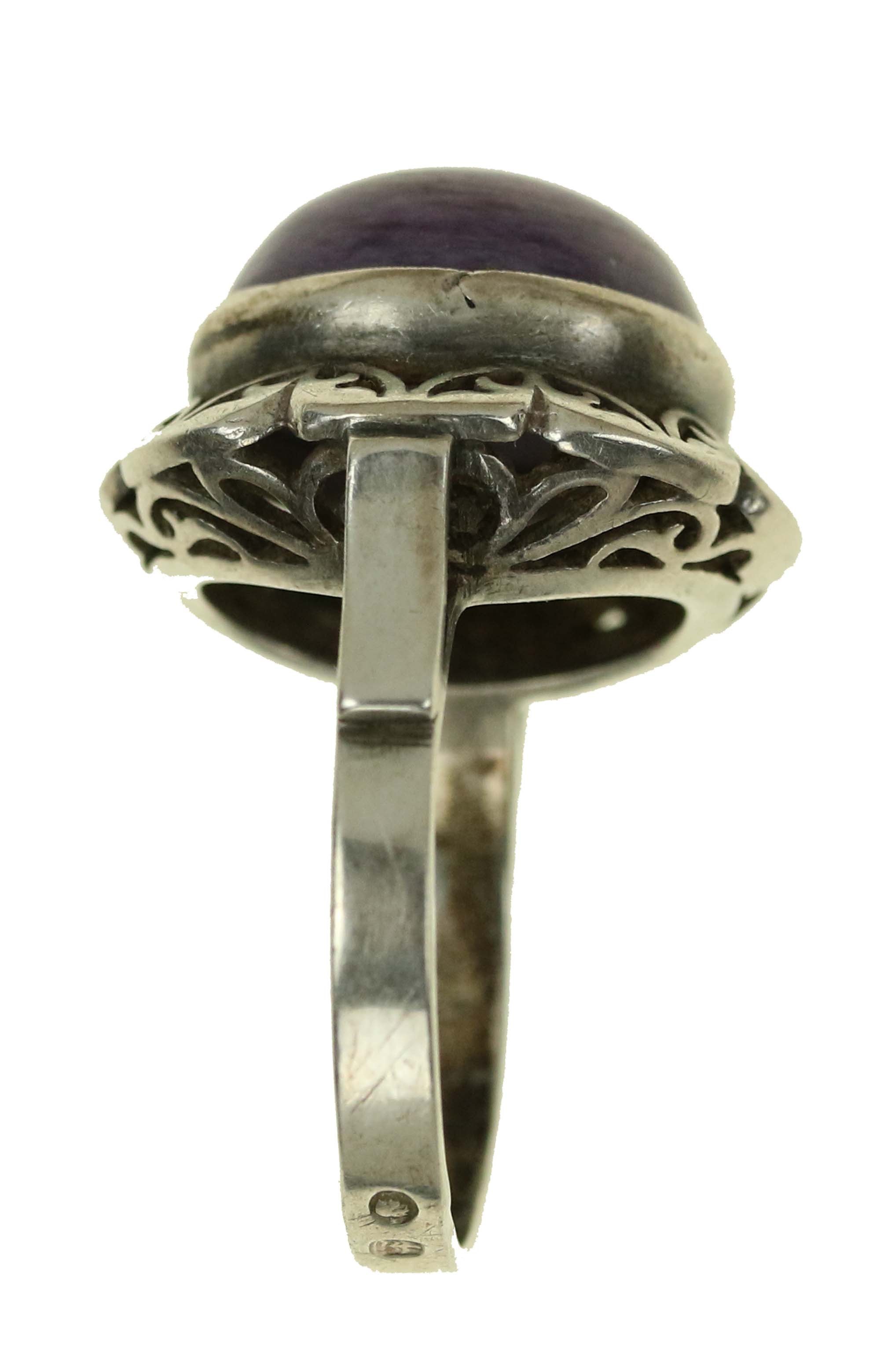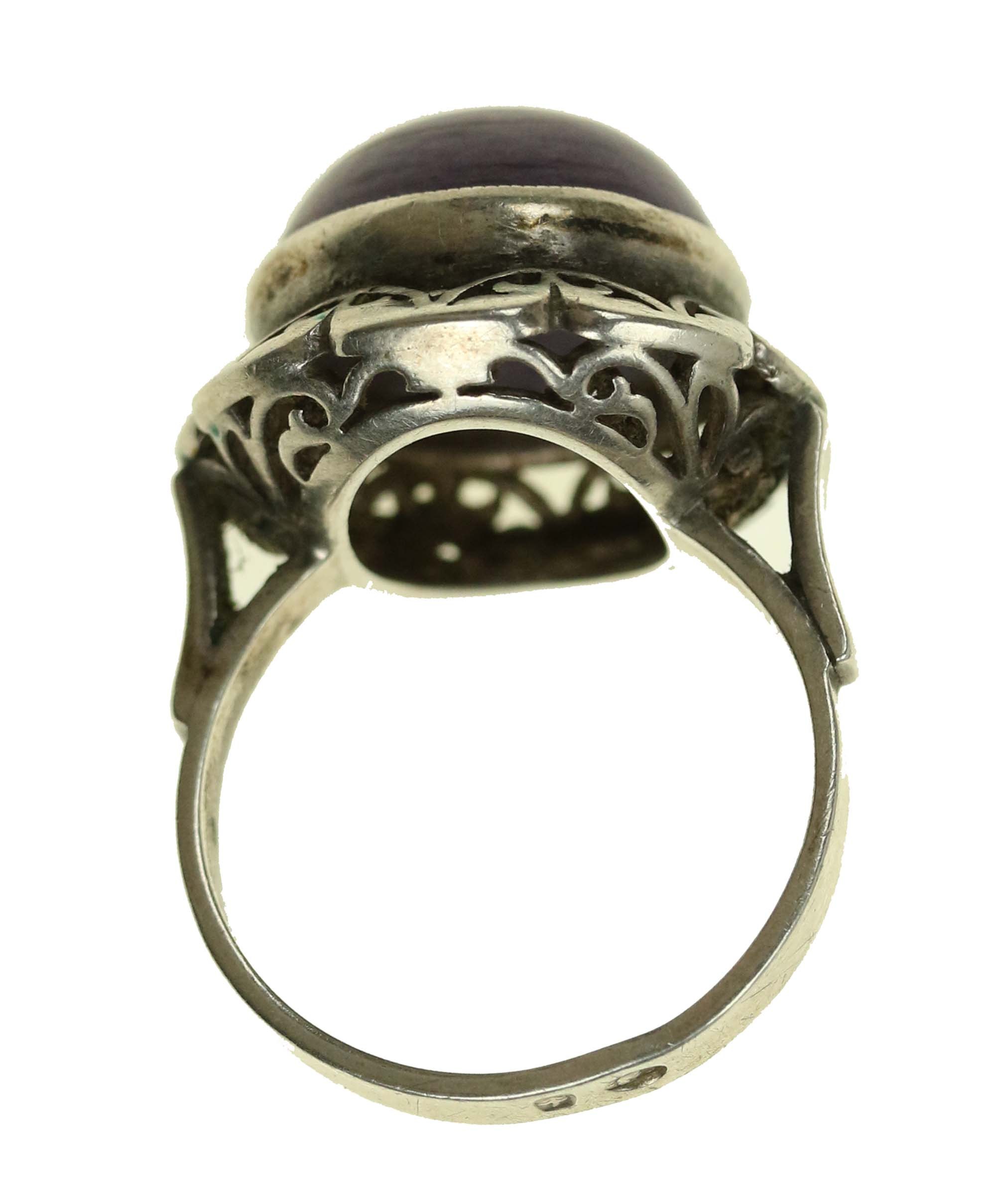 Pierścionek z fioletowym kamieniem, WARMET. Srebro, widoczna sygnatura wytwórcy oraz próba srebra "3" po 1962 r. Średnica pierścionka 19 mm, średnica górki 20 mm, średnica kamienia 15 mm. Waga 6,8 g.