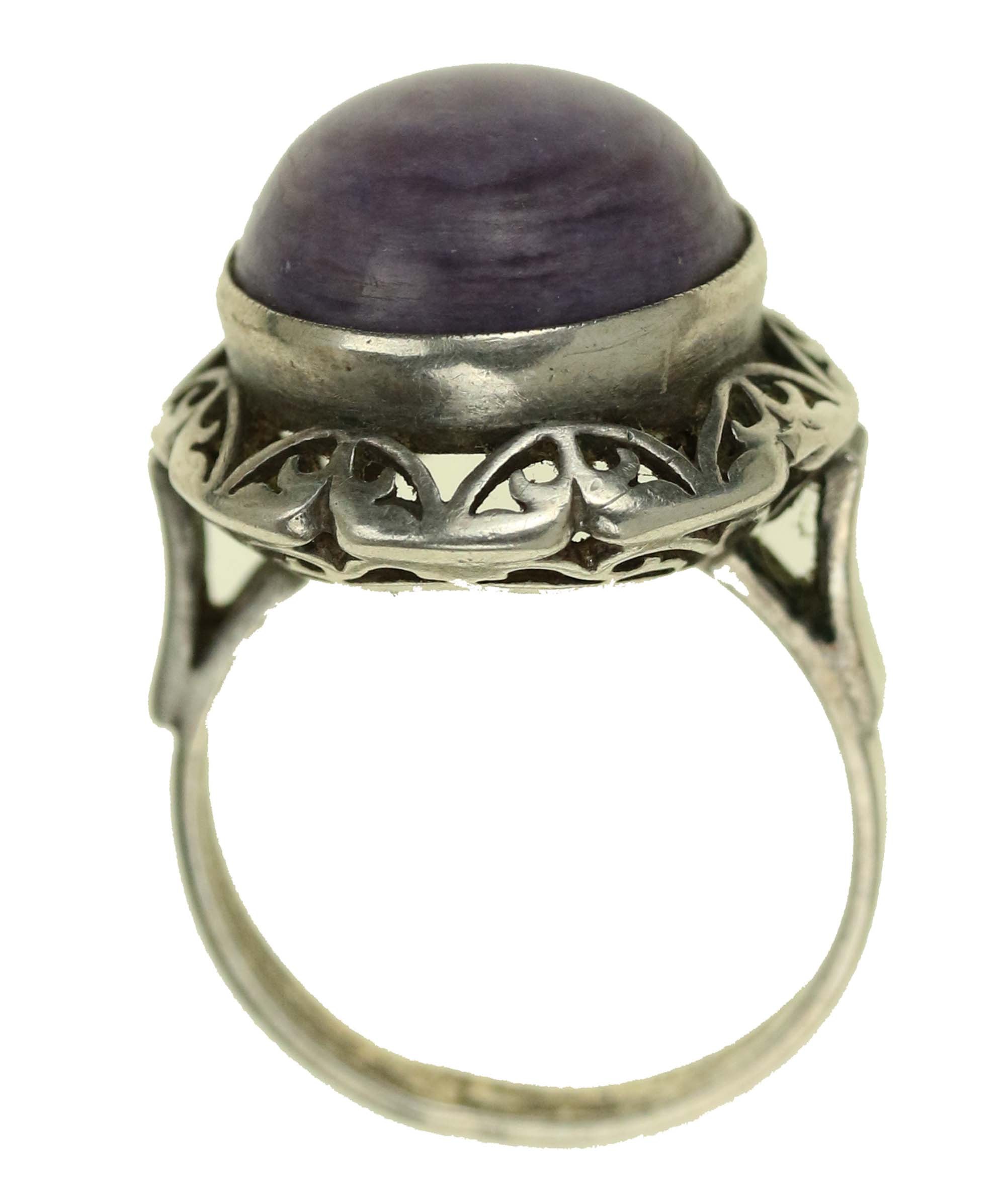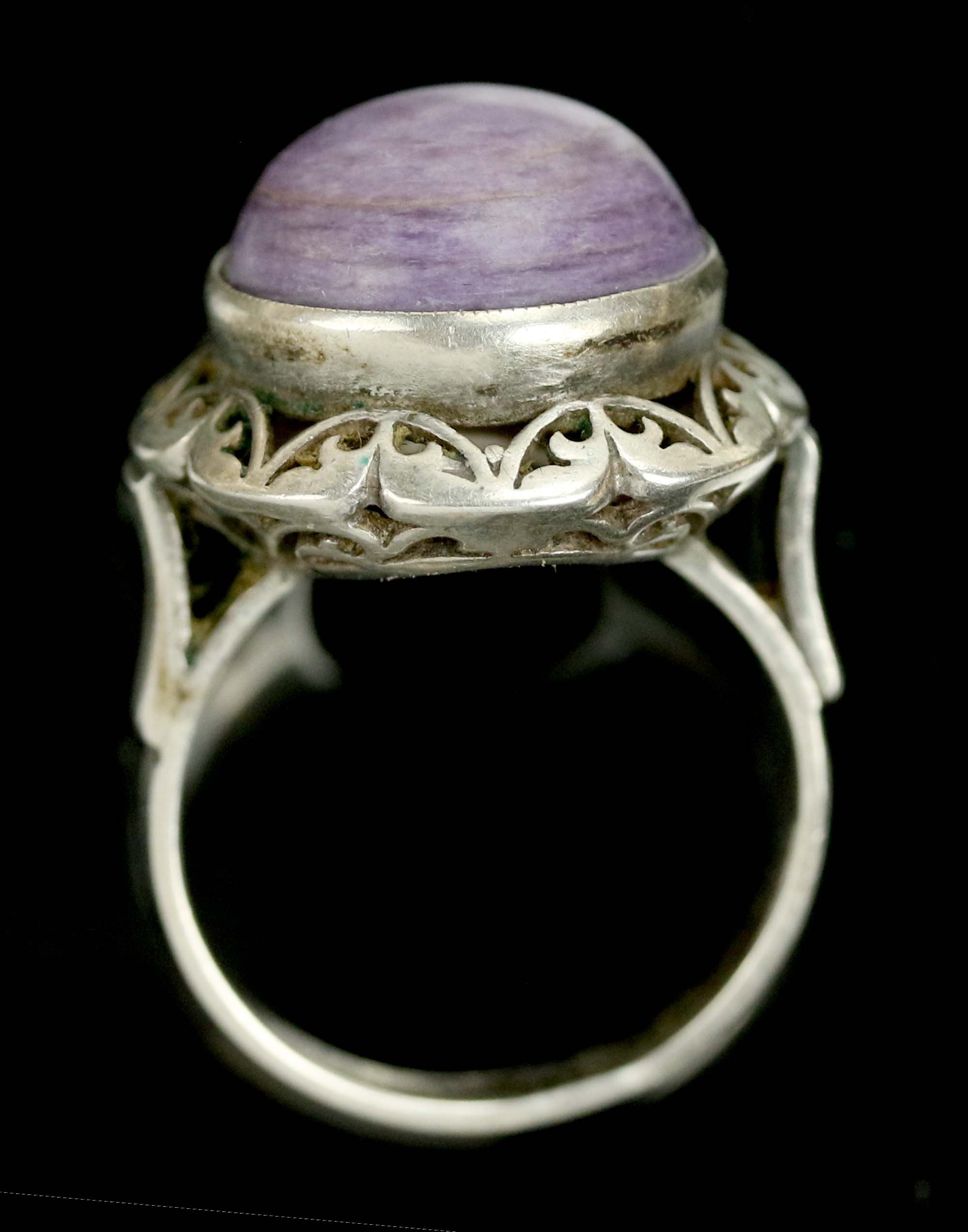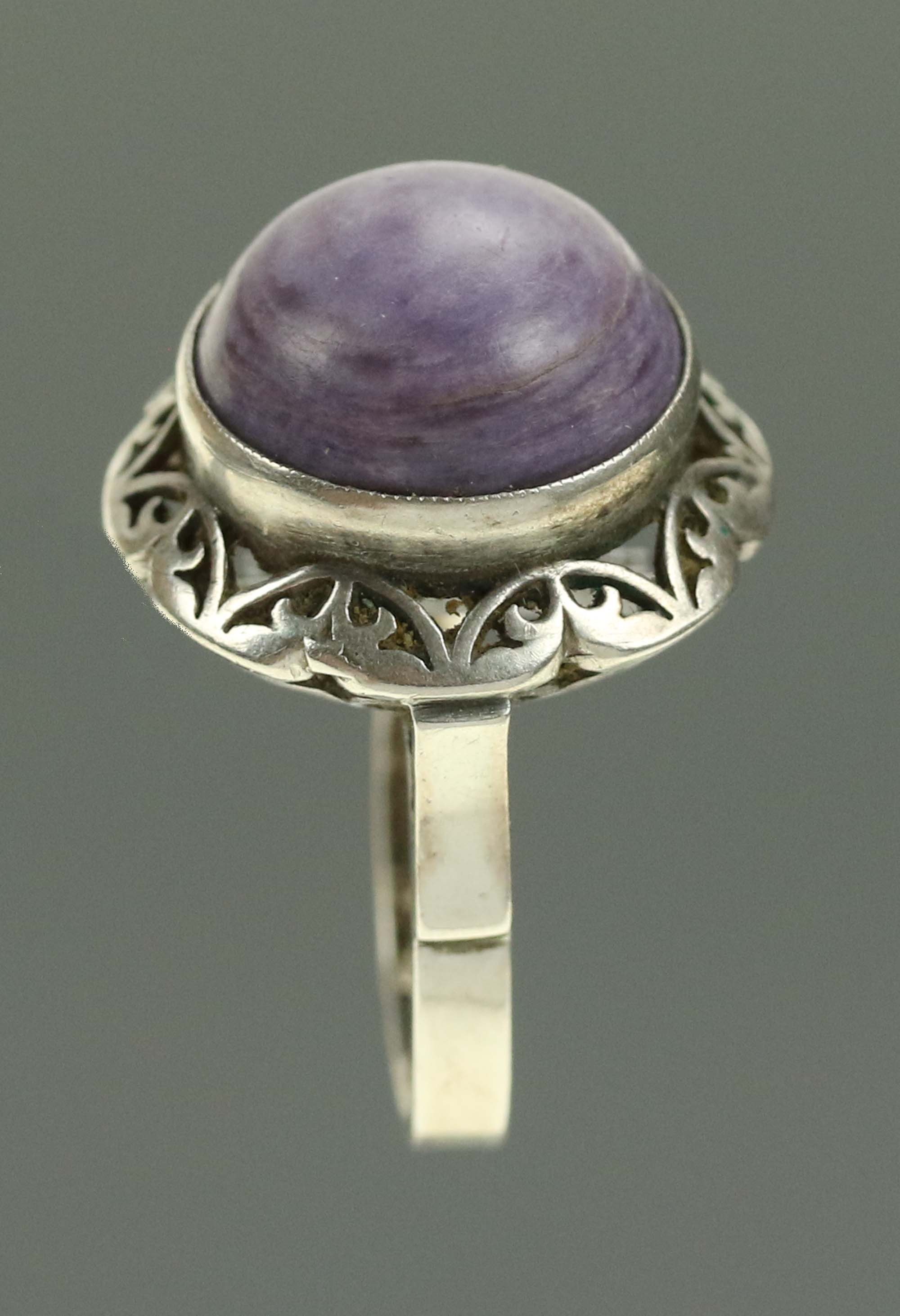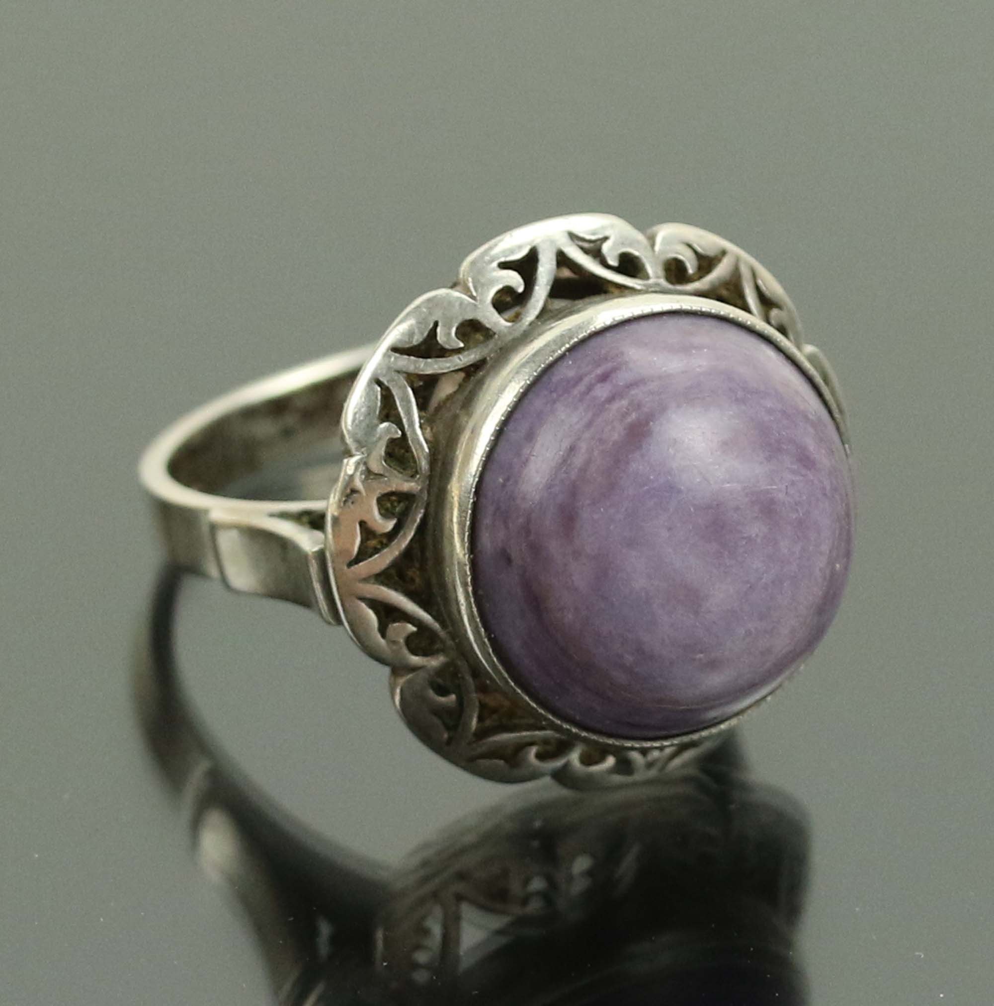 Pierścionek z fioletowym kamieniem, WARMET. Srebro, widoczna sygnatura wytwórcy oraz próba srebra "3" po 1962 r. Średnica pierścionka 19 mm, średnica górki 20 mm, średnica kamienia 15 mm. Waga 6,8 g.