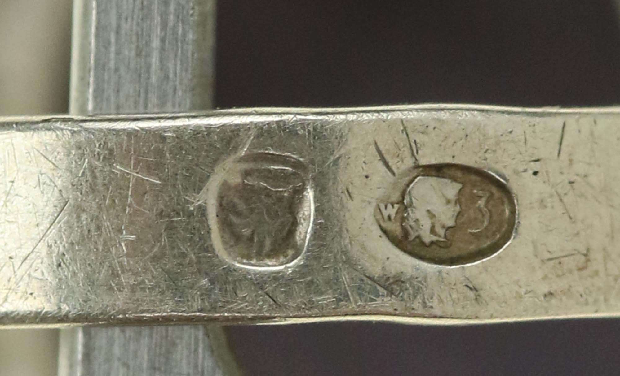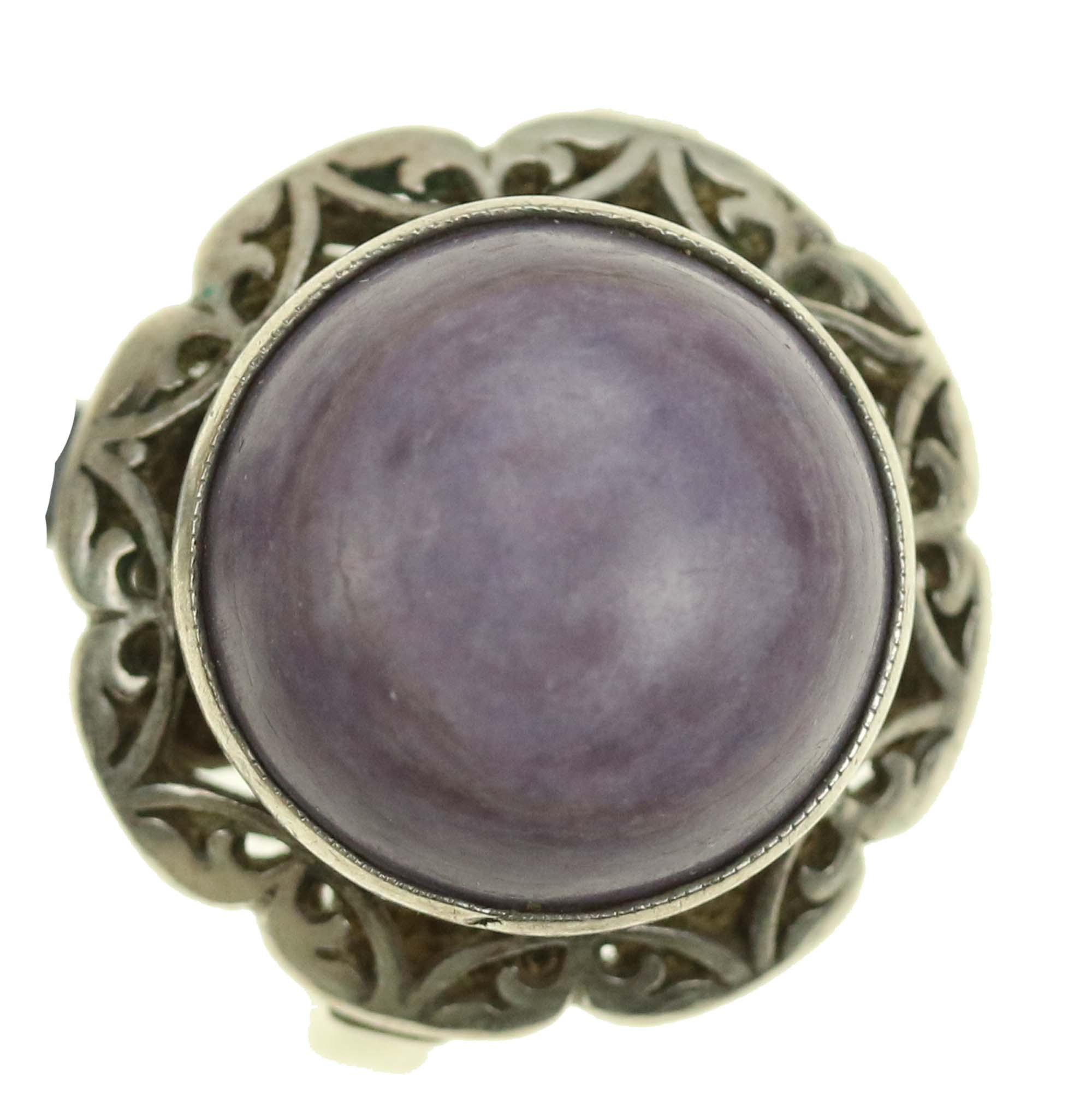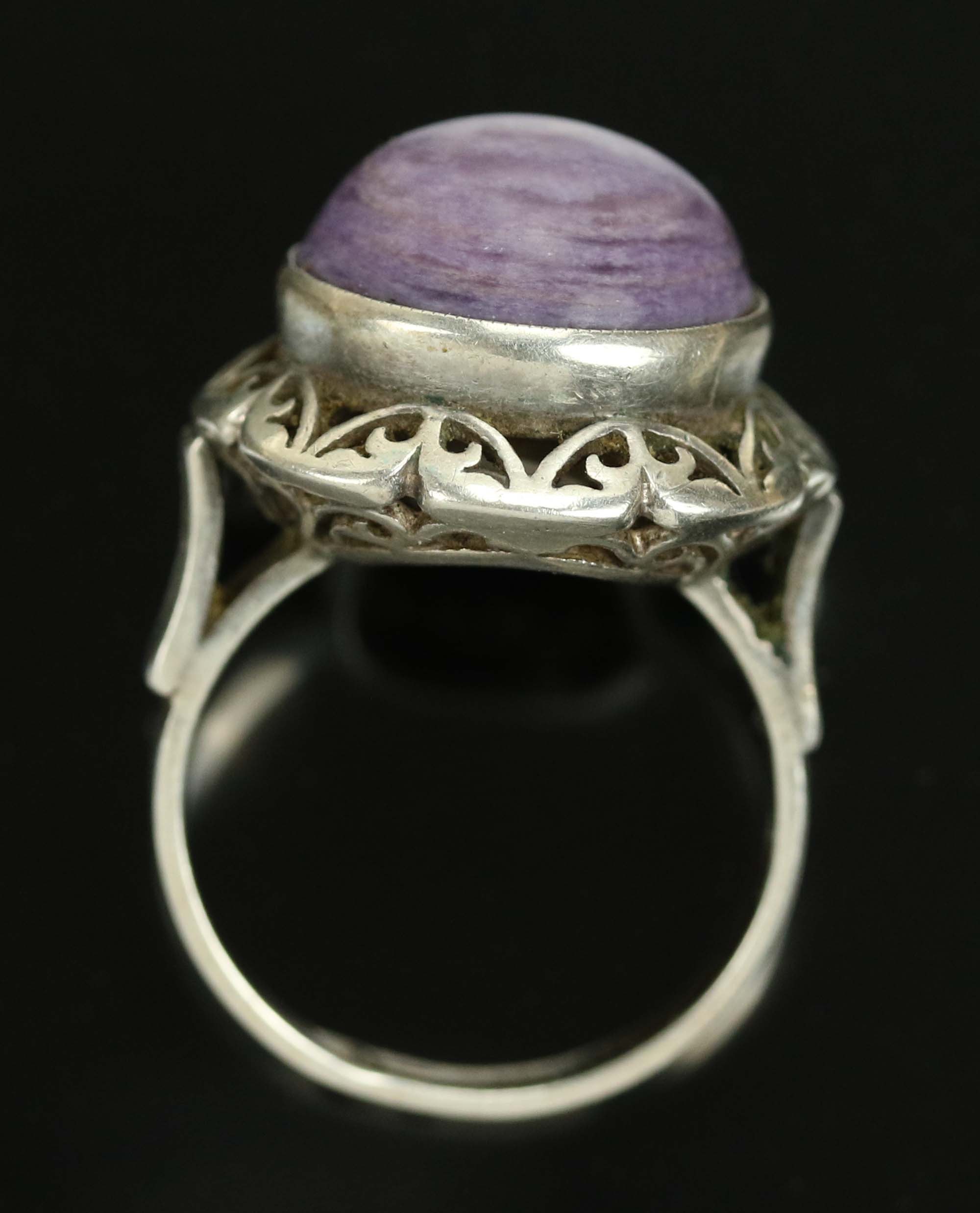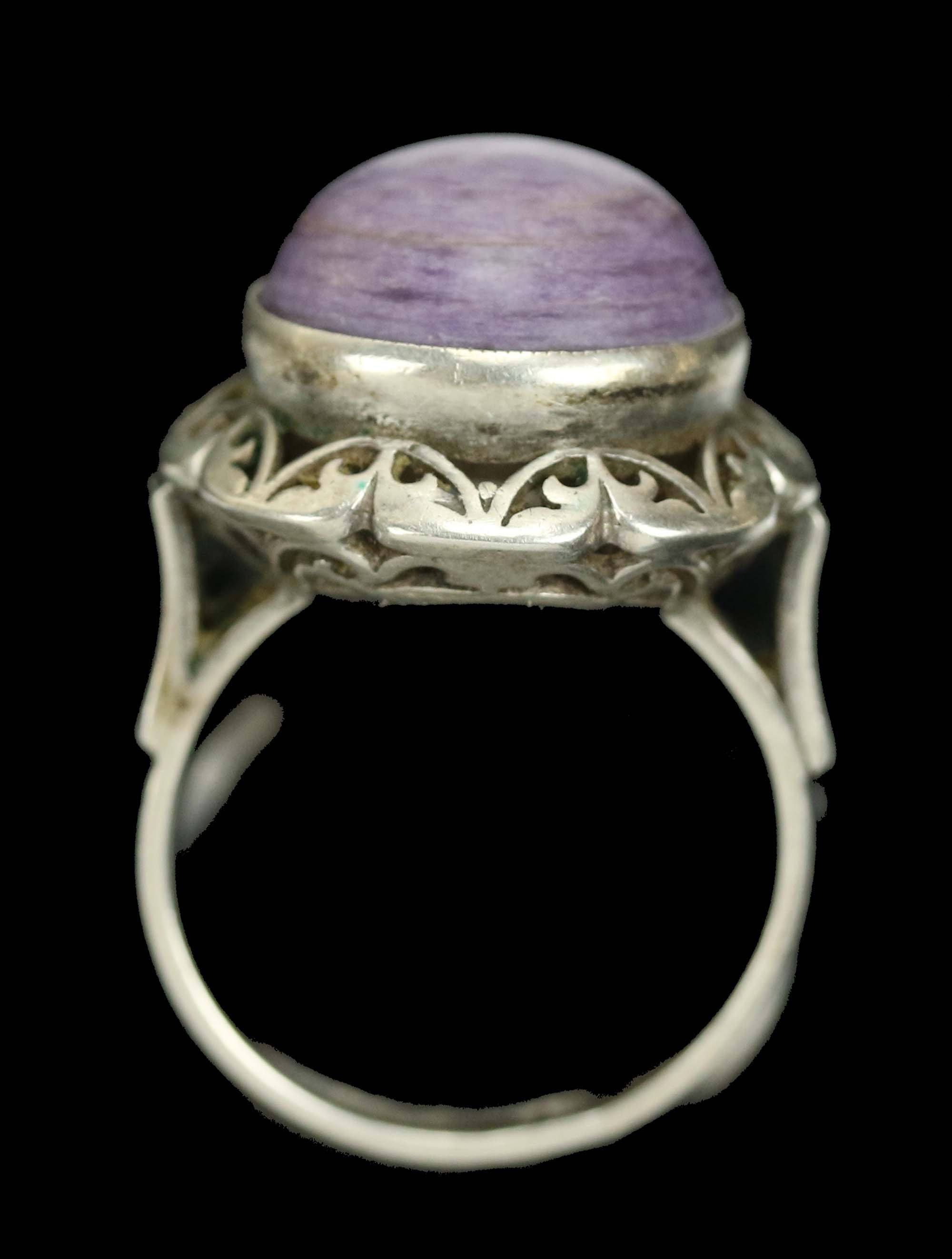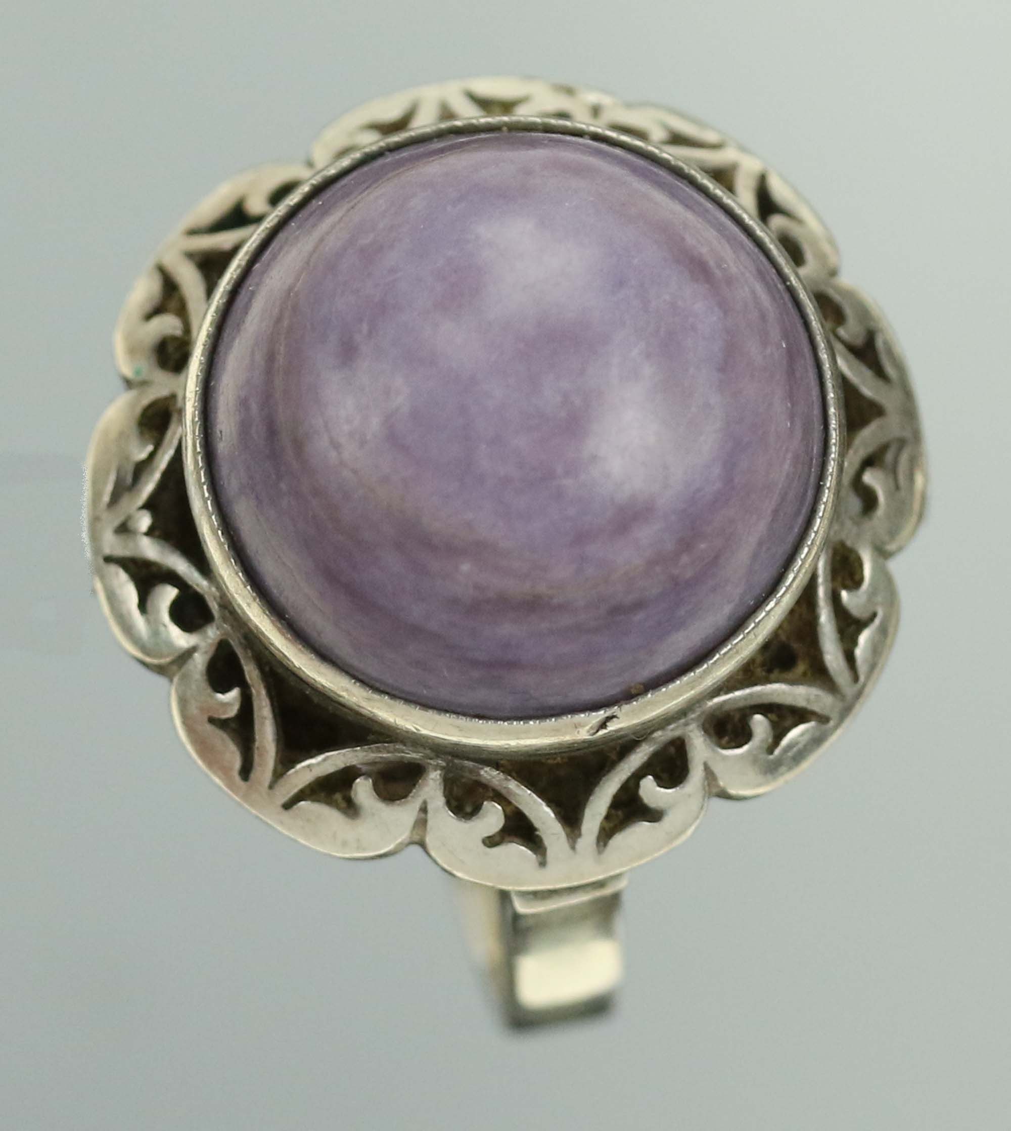 Pierścionek z fioletowym kamieniem, WARMET. Srebro, widoczna sygnatura wytwórcy oraz próba srebra "3" po 1962 r. Średnica pierścionka 19 mm, średnica górki 20 mm, średnica kamienia 15 mm. Waga 6,8 g.