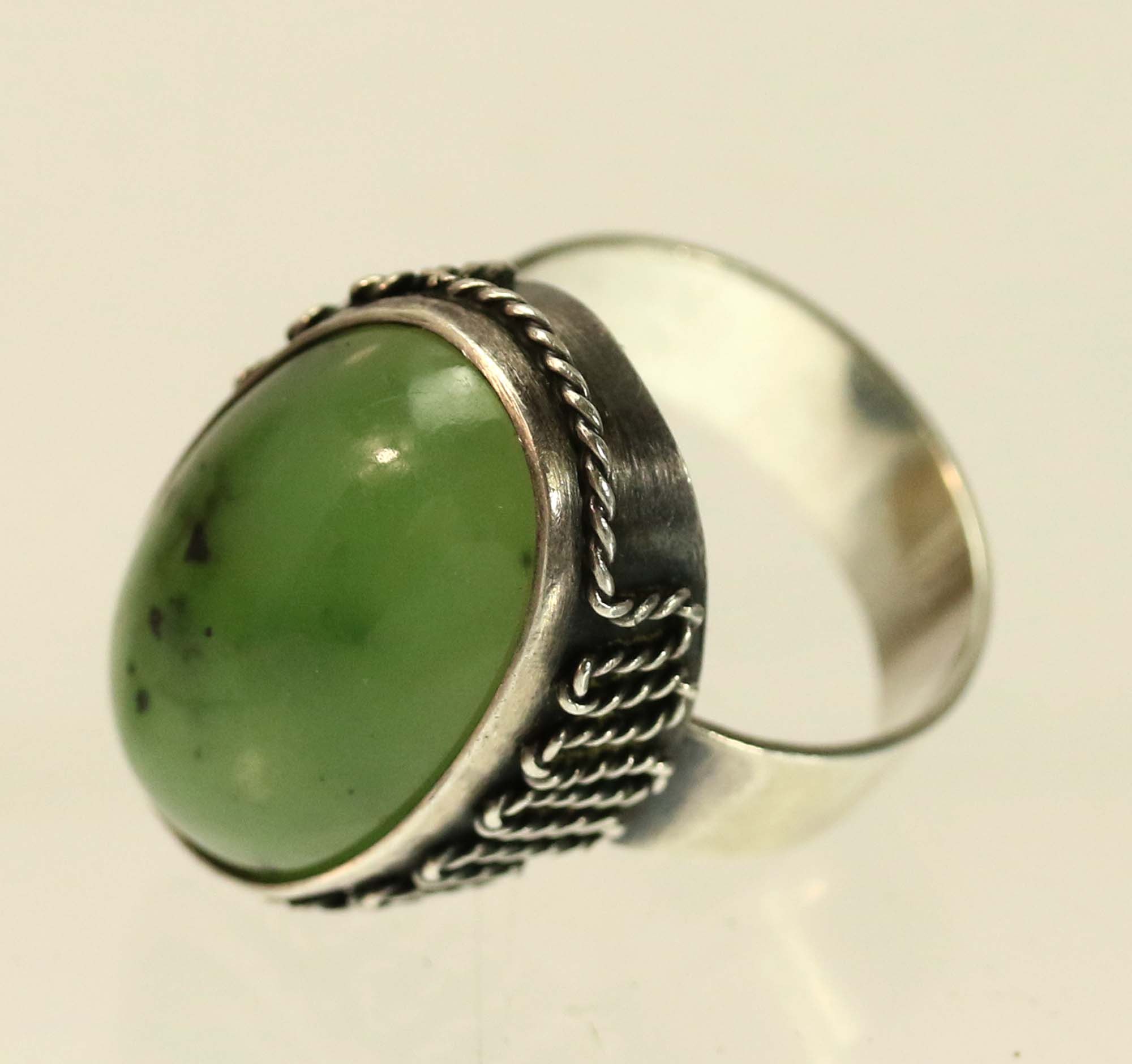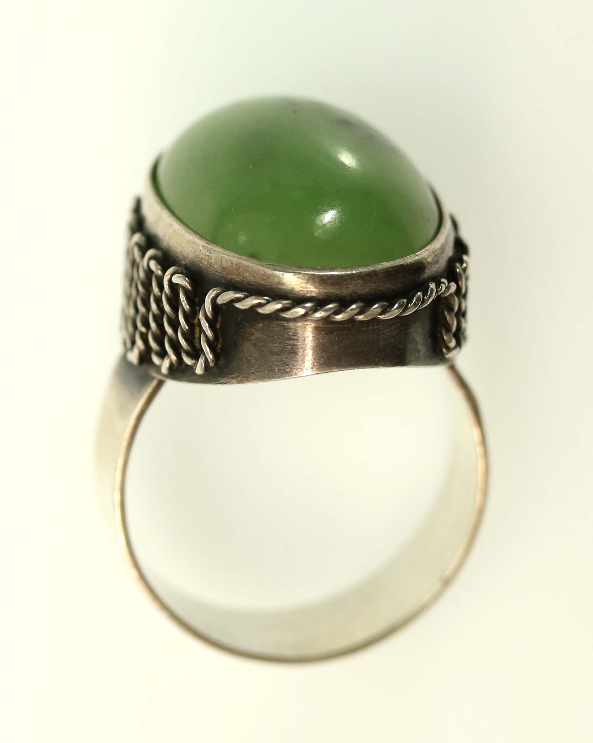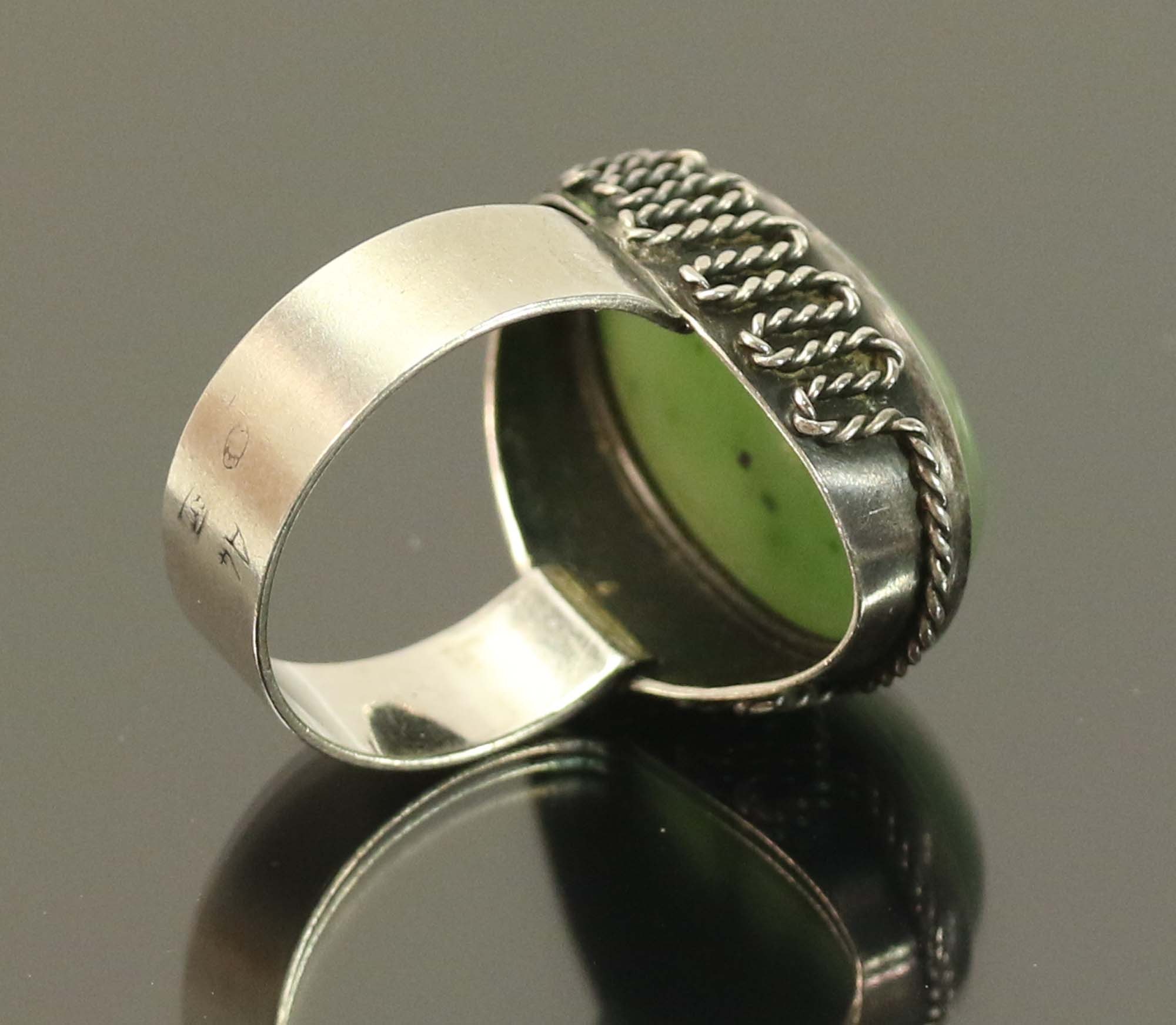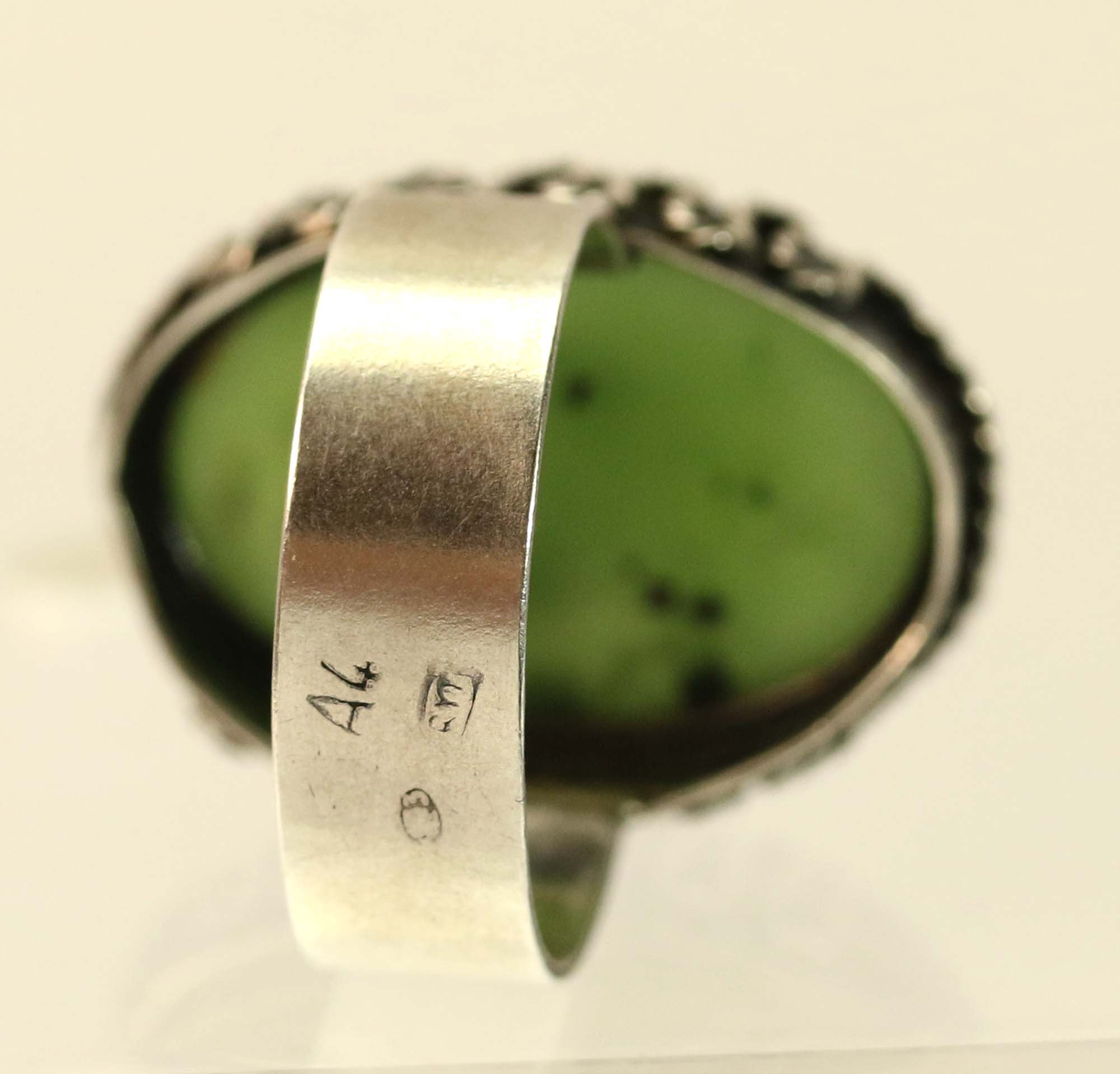 Pierścionek z nefrytem, Rytosztuka. Srebro, widoczna cecha wytwórcy oraz dodatkowa cecha "A4" oraz próba srebra "3" po 1962 r. Wym. górki 27 x 19 mm, średnica pierścionka 20 mm, waga 10 g