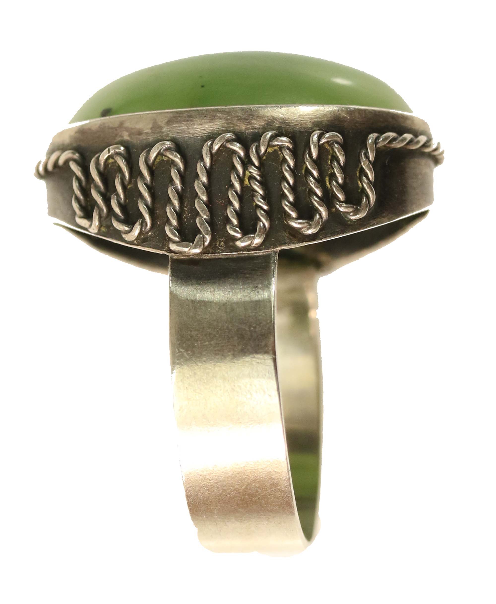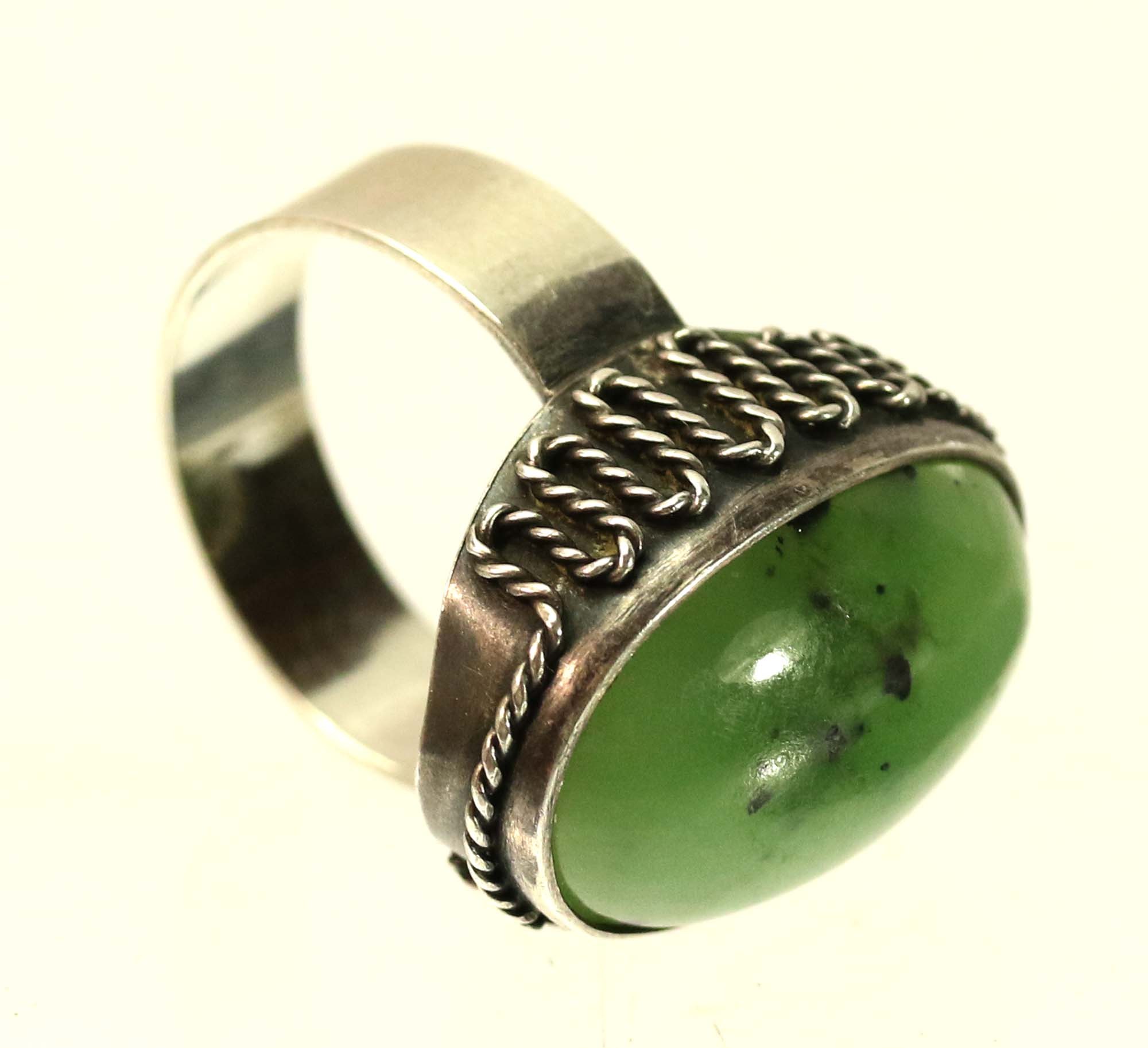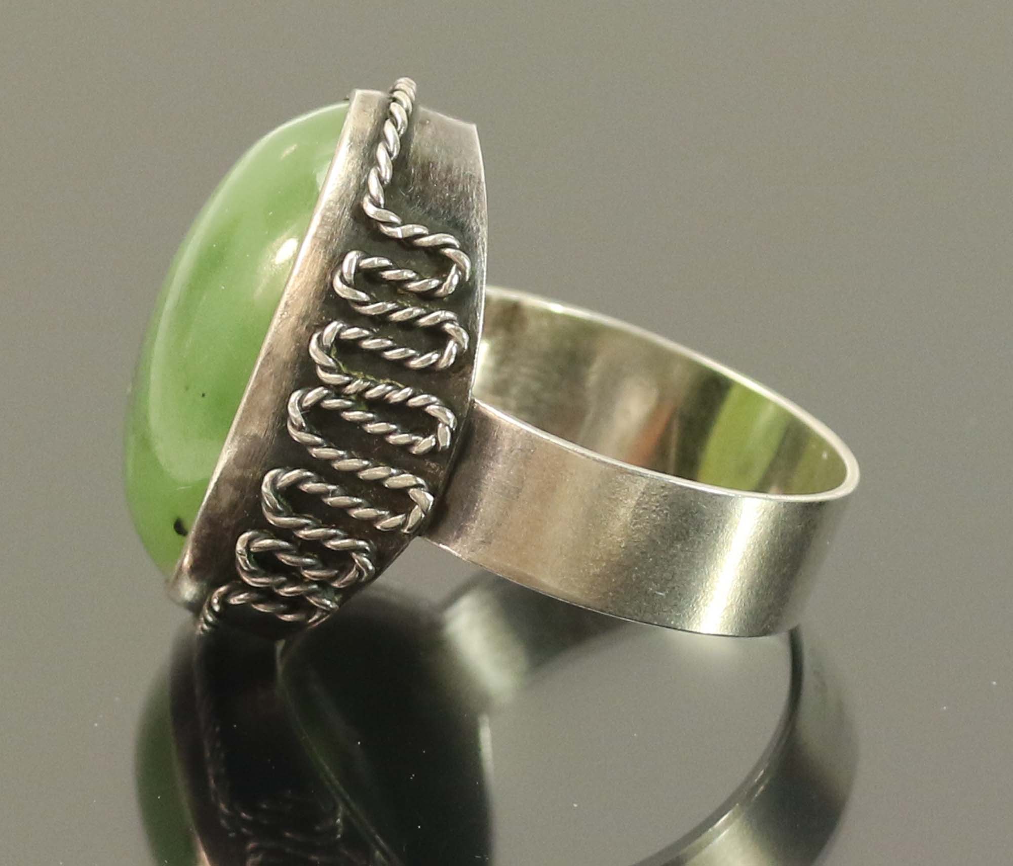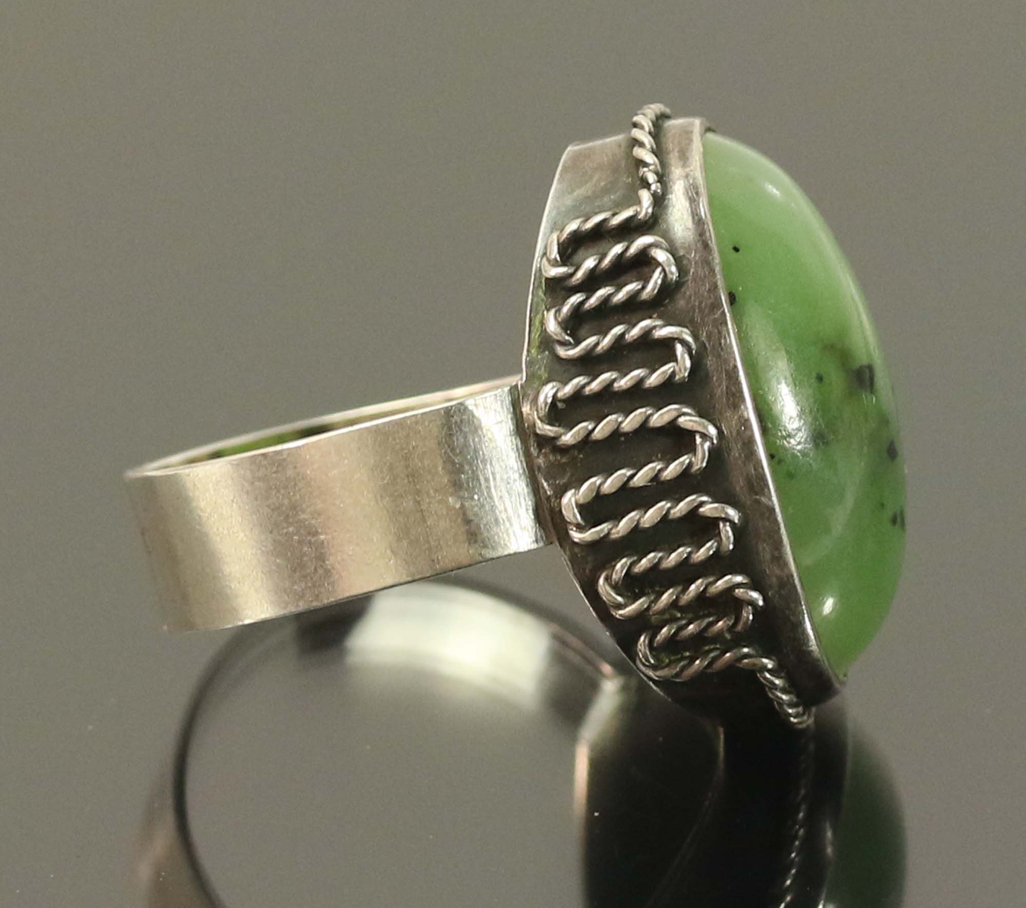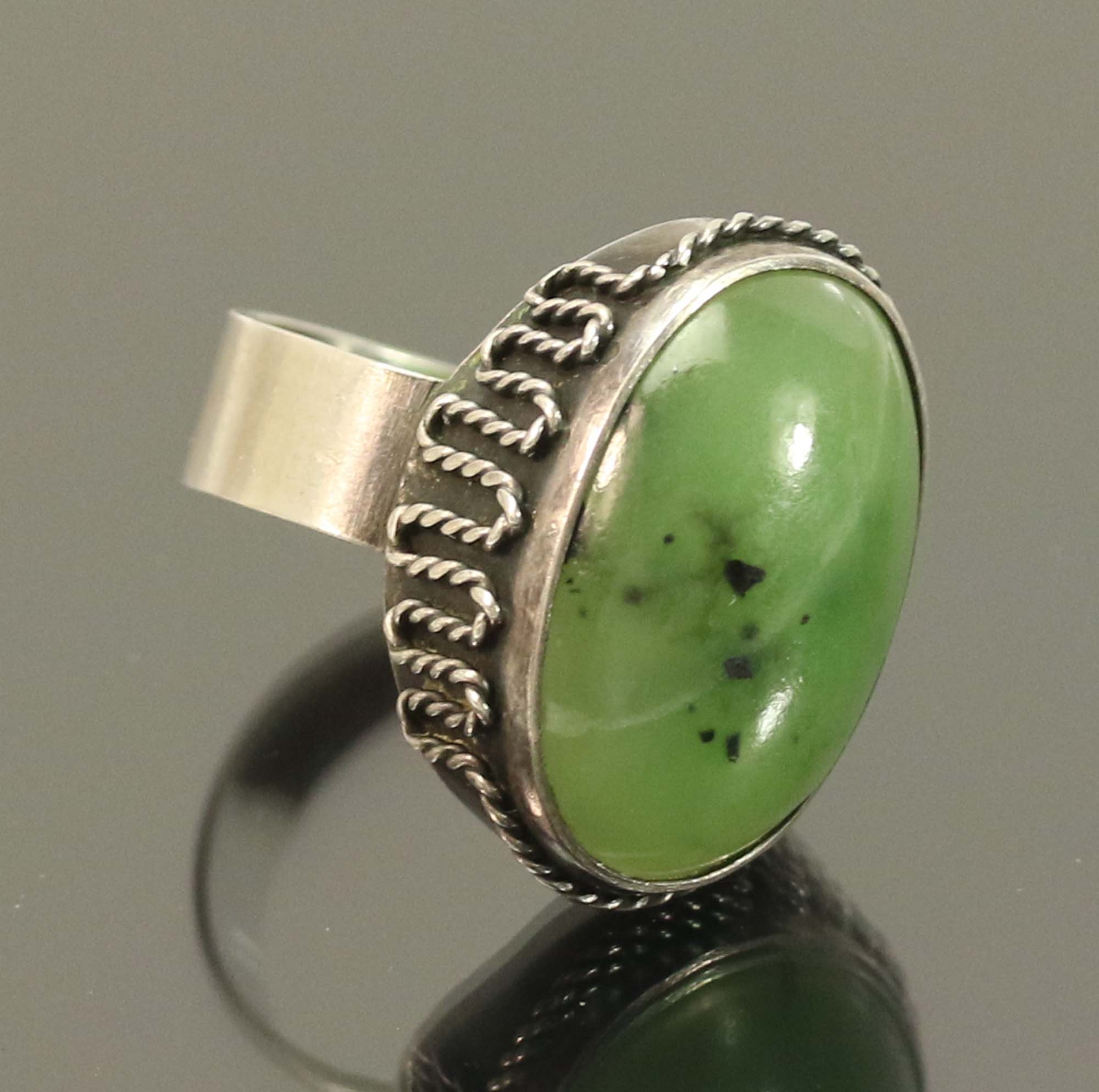 Pierścionek z nefrytem, Rytosztuka. Srebro, widoczna cecha wytwórcy oraz dodatkowa cecha "A4" oraz próba srebra "3" po 1962 r. Wym. górki 27 x 19 mm, średnica pierścionka 20 mm, waga 10 g