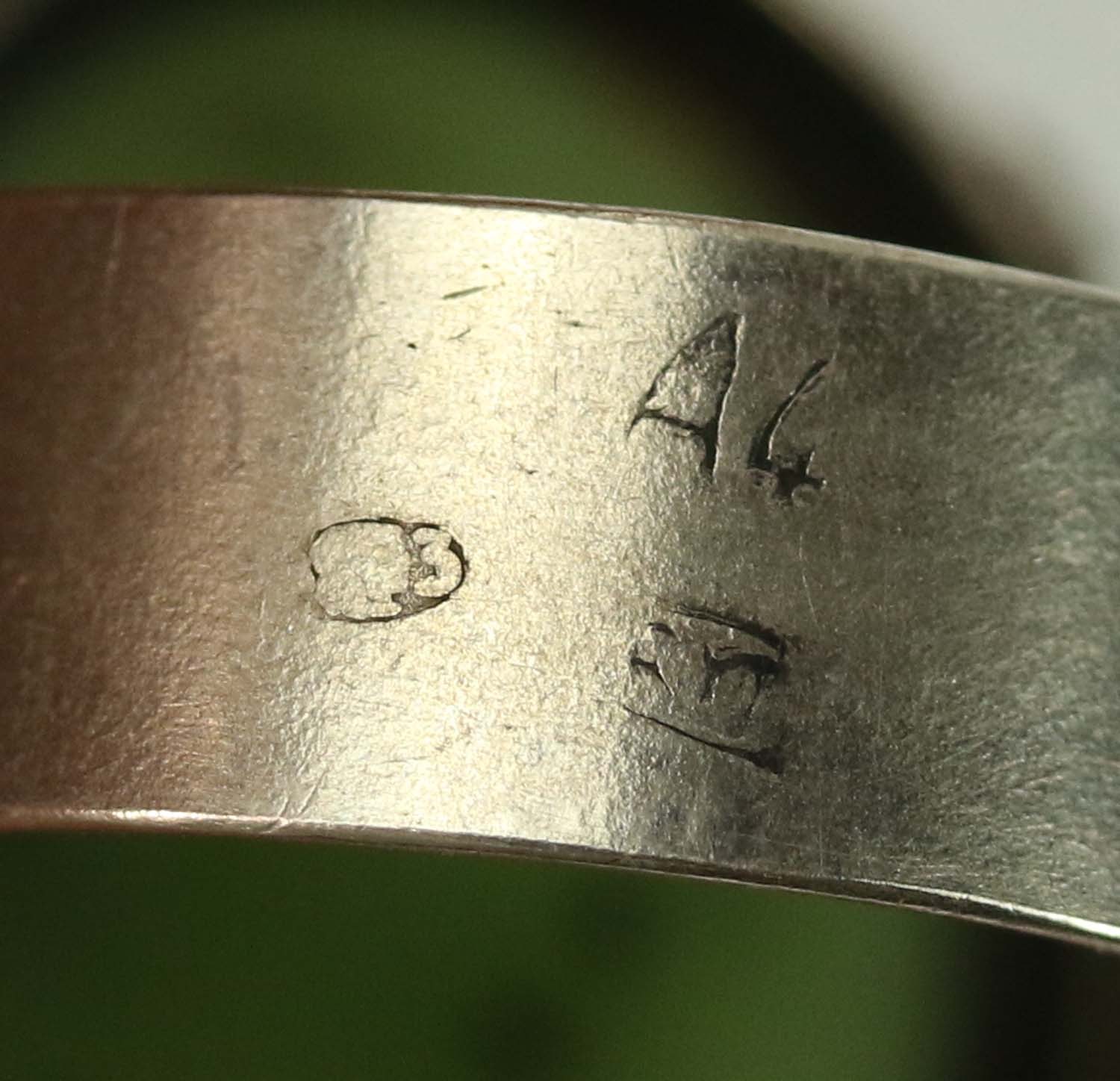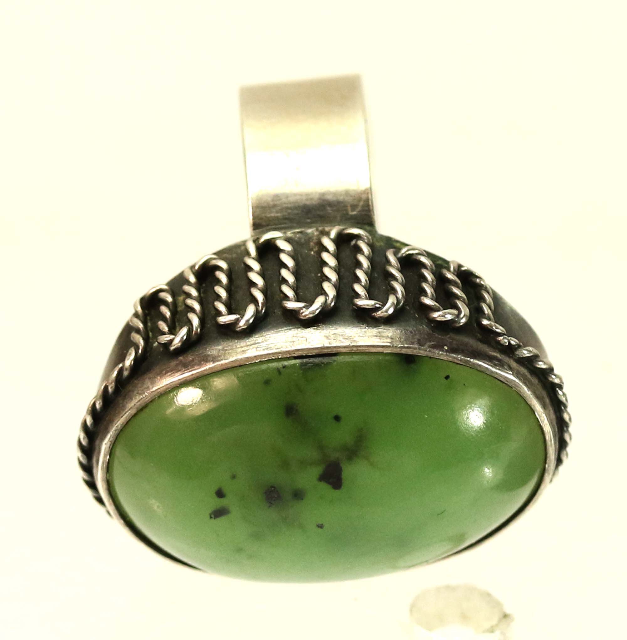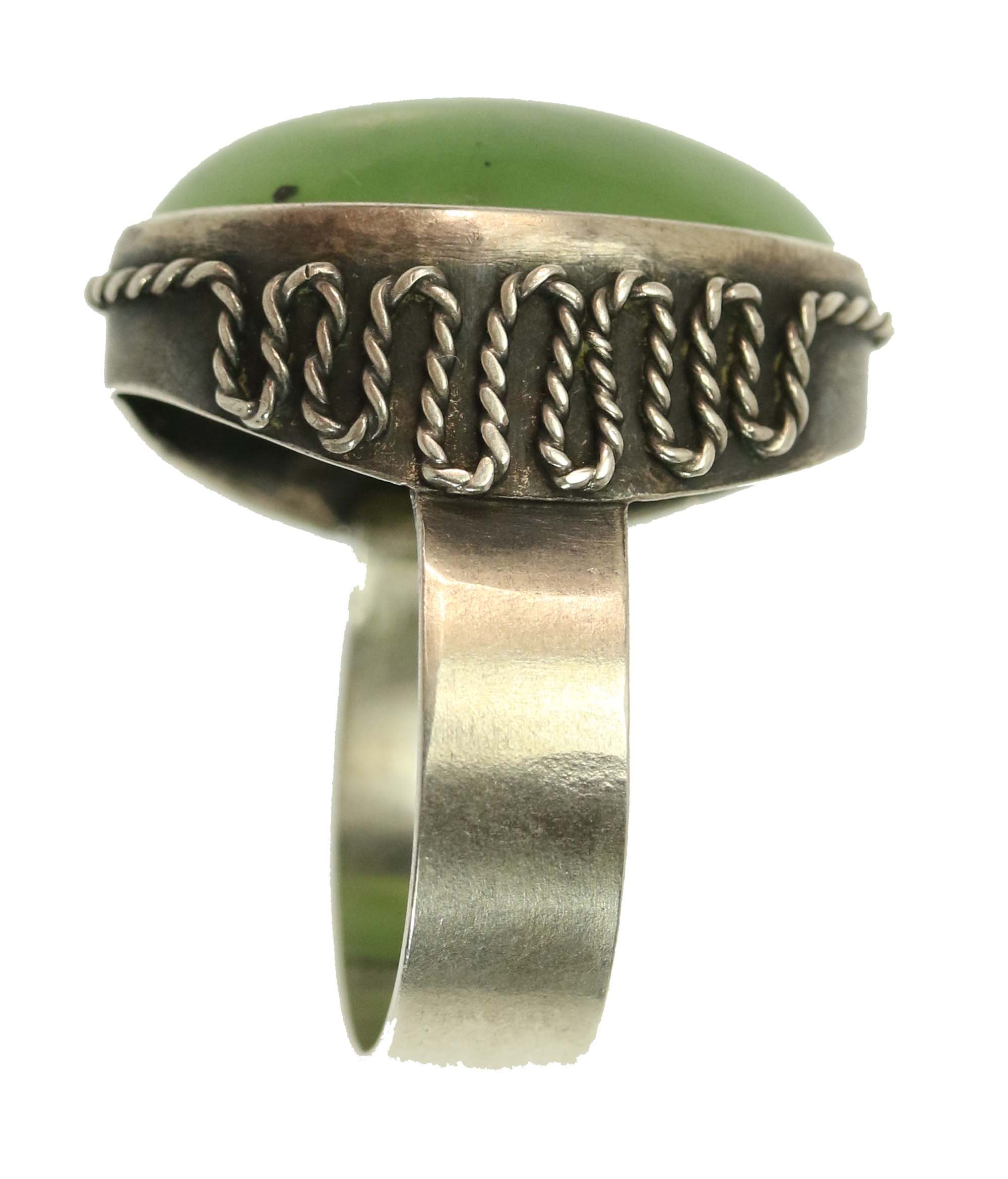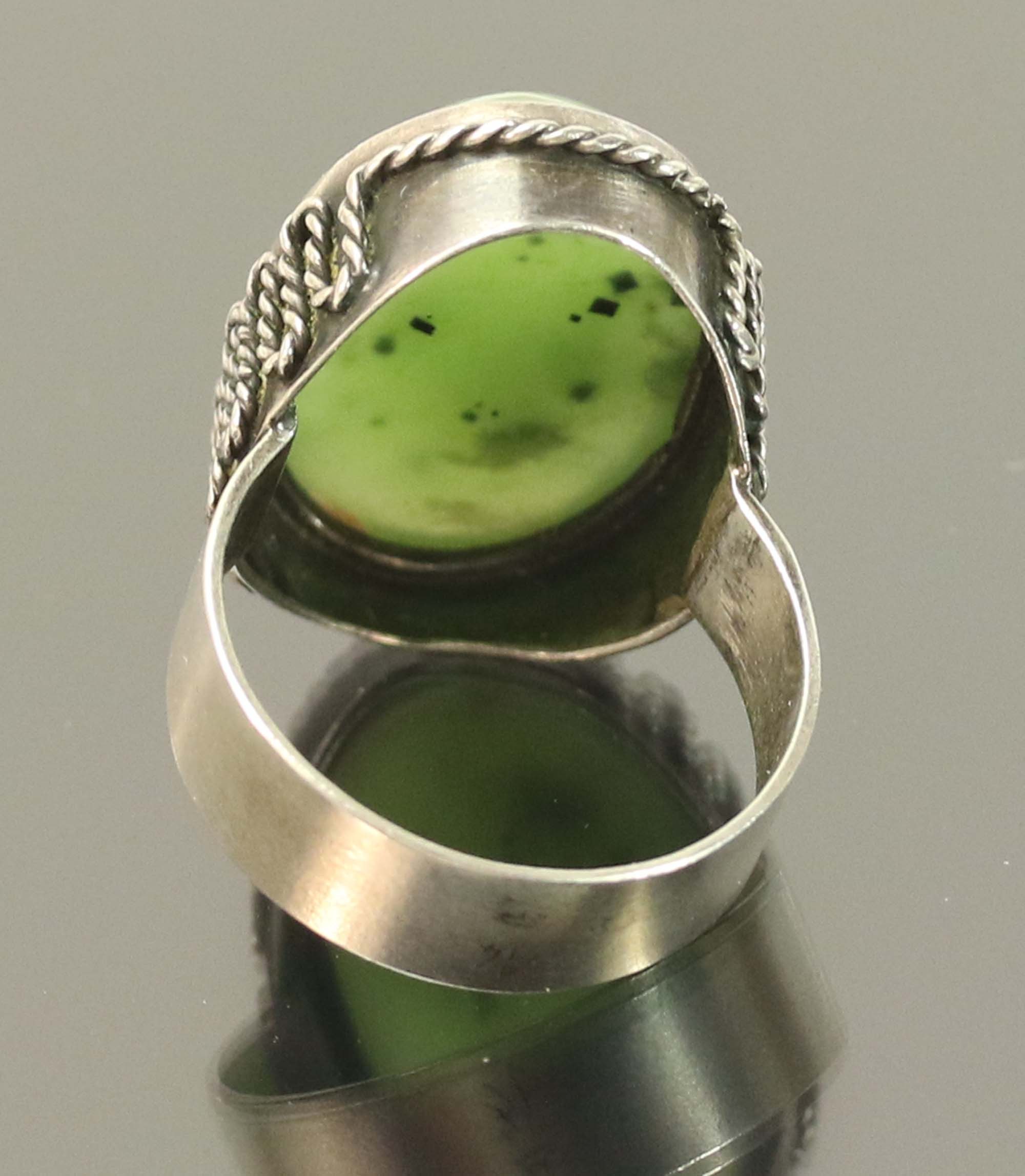 Pierścionek z nefrytem, Rytosztuka. Srebro, widoczna cecha wytwórcy oraz dodatkowa cecha "A4" oraz próba srebra "3" po 1962 r. Wym. górki 27 x 19 mm, średnica pierścionka 20 mm, waga 10 g